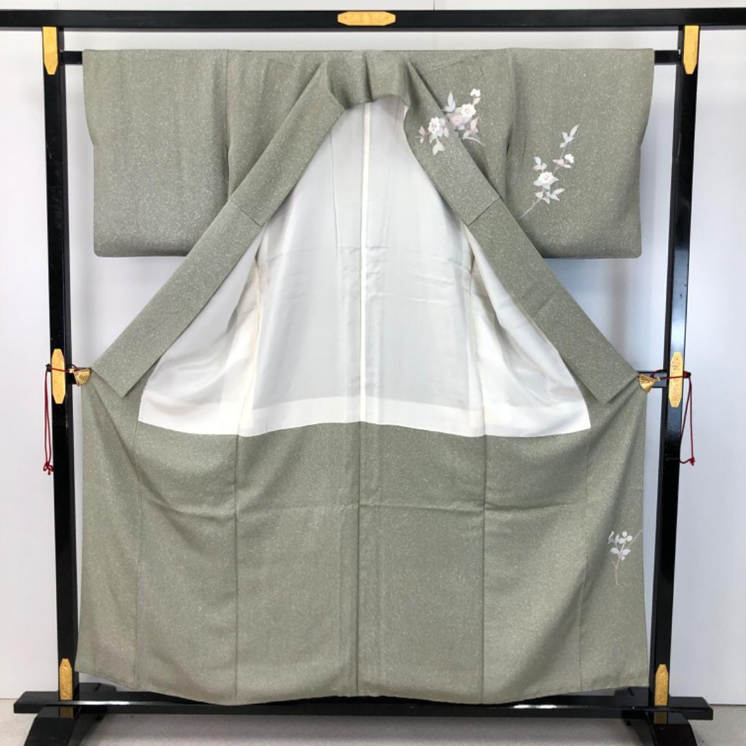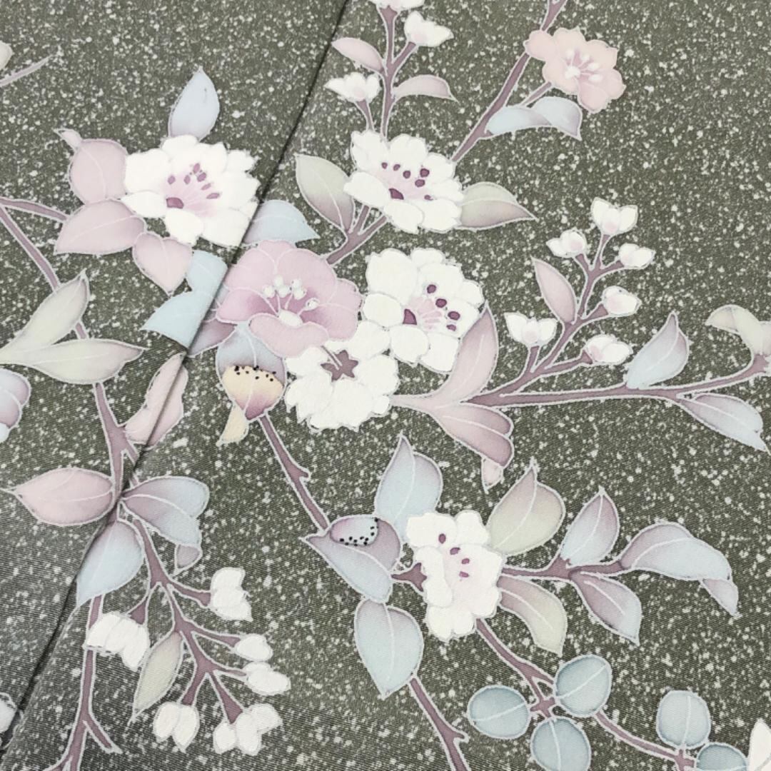 灰緑色ベースのお色味に叩き染、友禅の美しい花草模様の柄裄がデザインされた素敵なお品でございます。