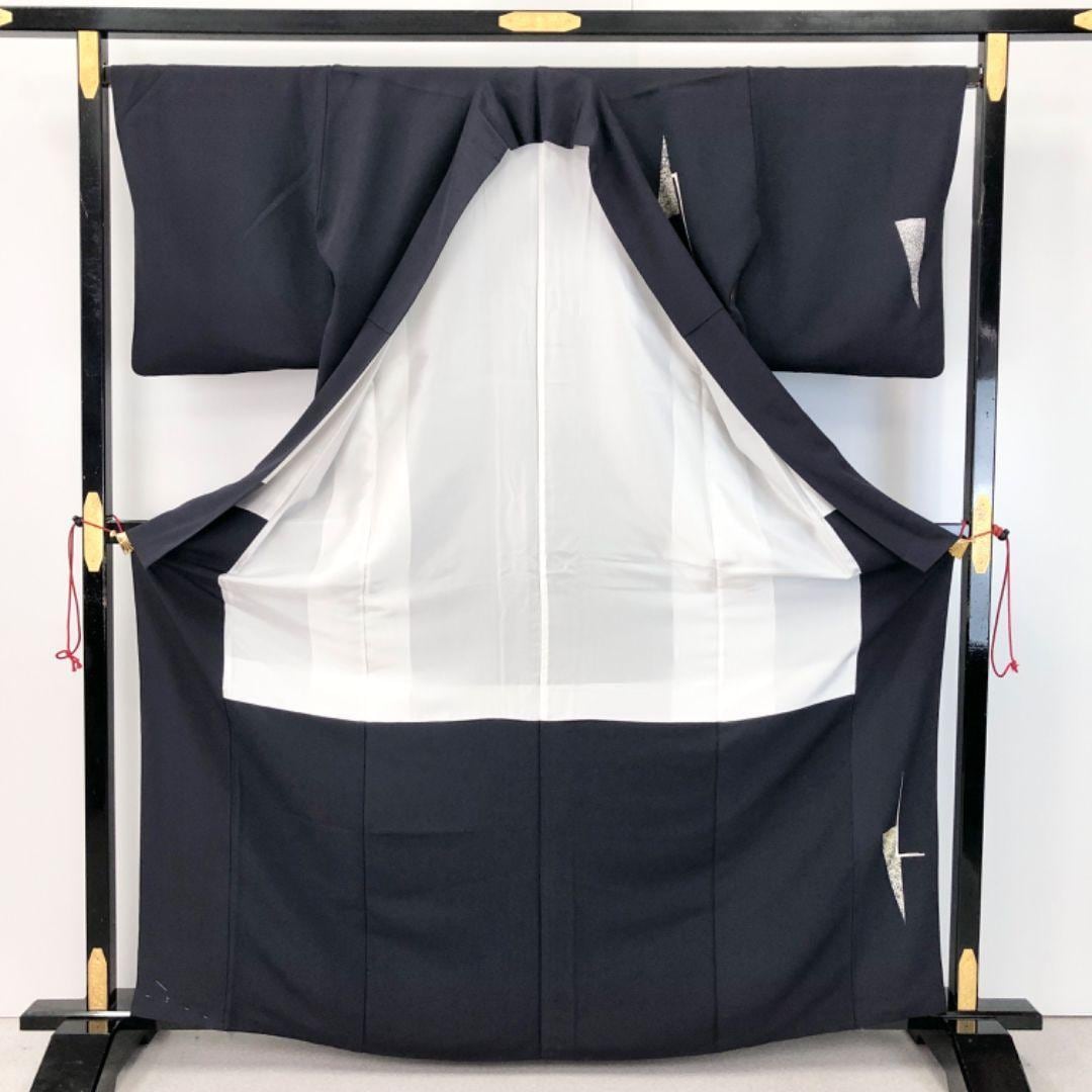 藤煤竹色のお色味の縮緬地にモダンな三角模様の柄裄がデザインされた素敵なお品でございます。