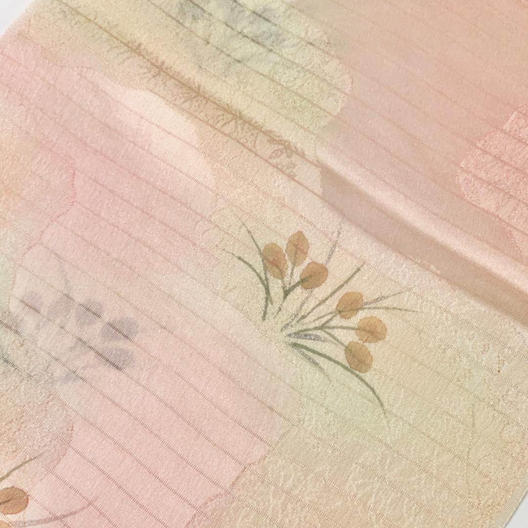 薄一斤染色のお色味に霞模様に草柄の柄裄がデザインされた素敵なお品でございます。