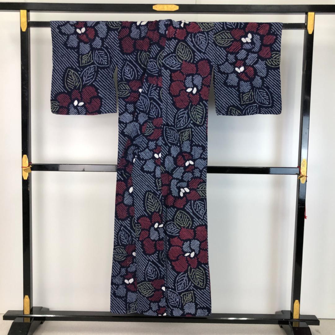 青褐色のお色味に花模様の柄裄がデザインされた素敵なお品でございます。