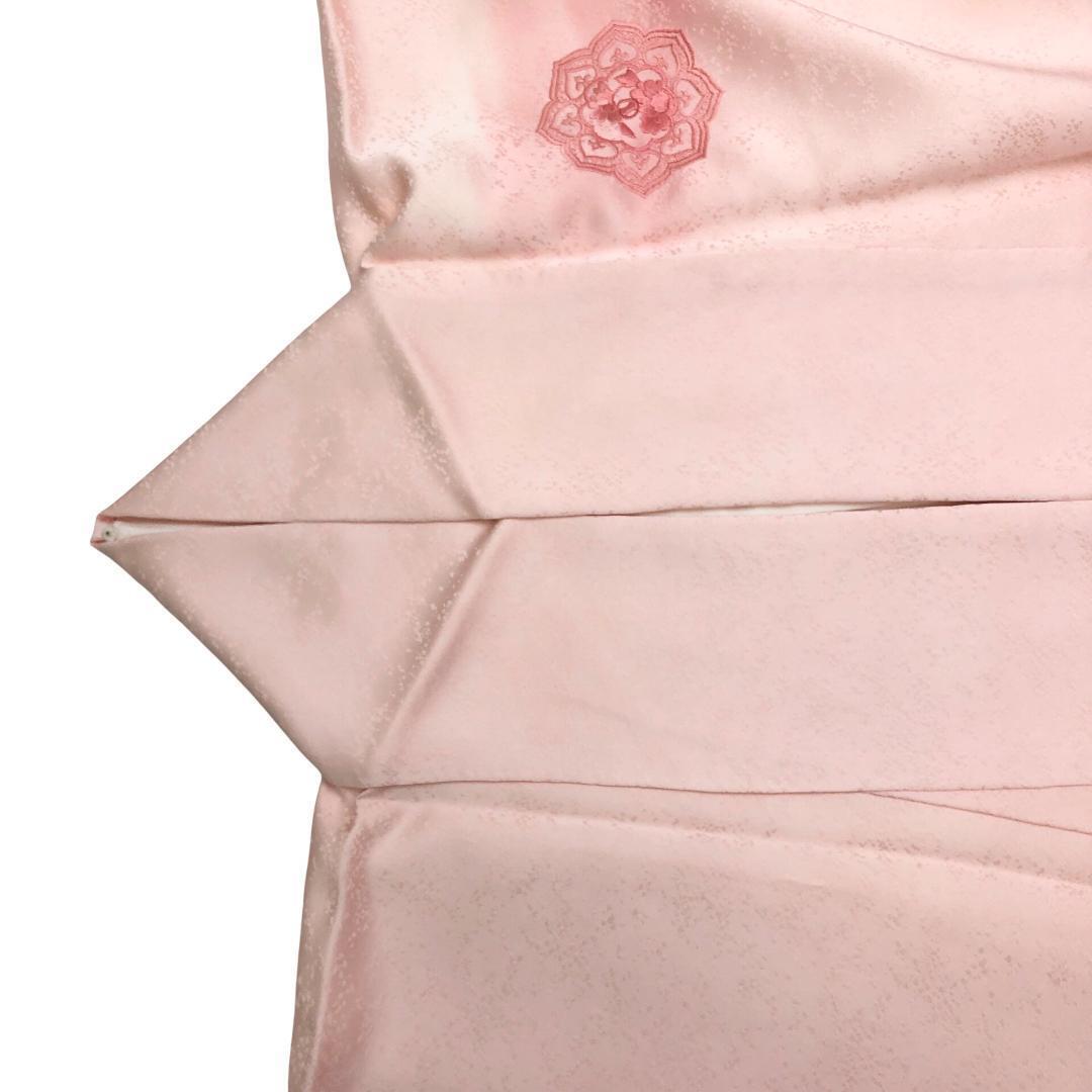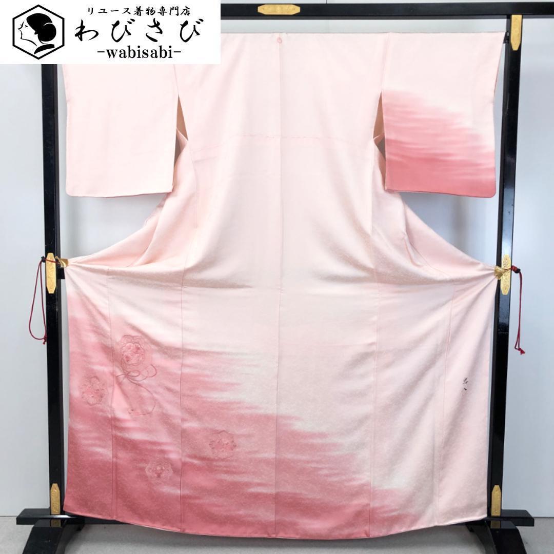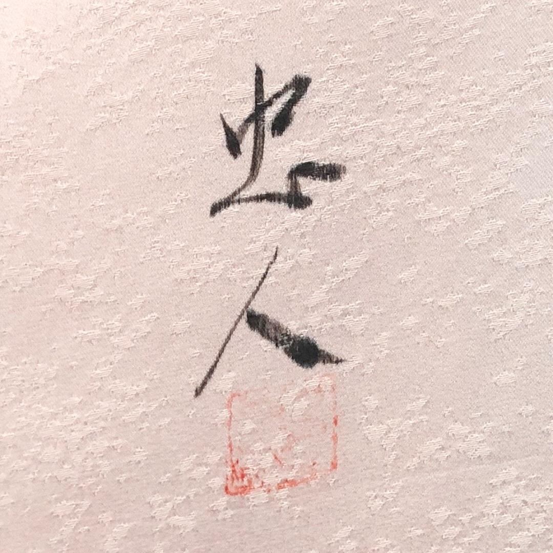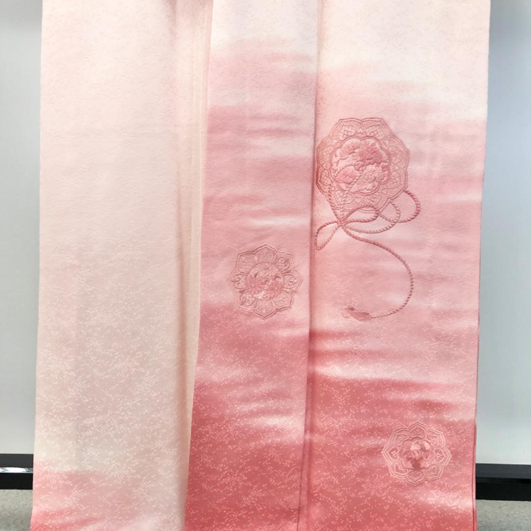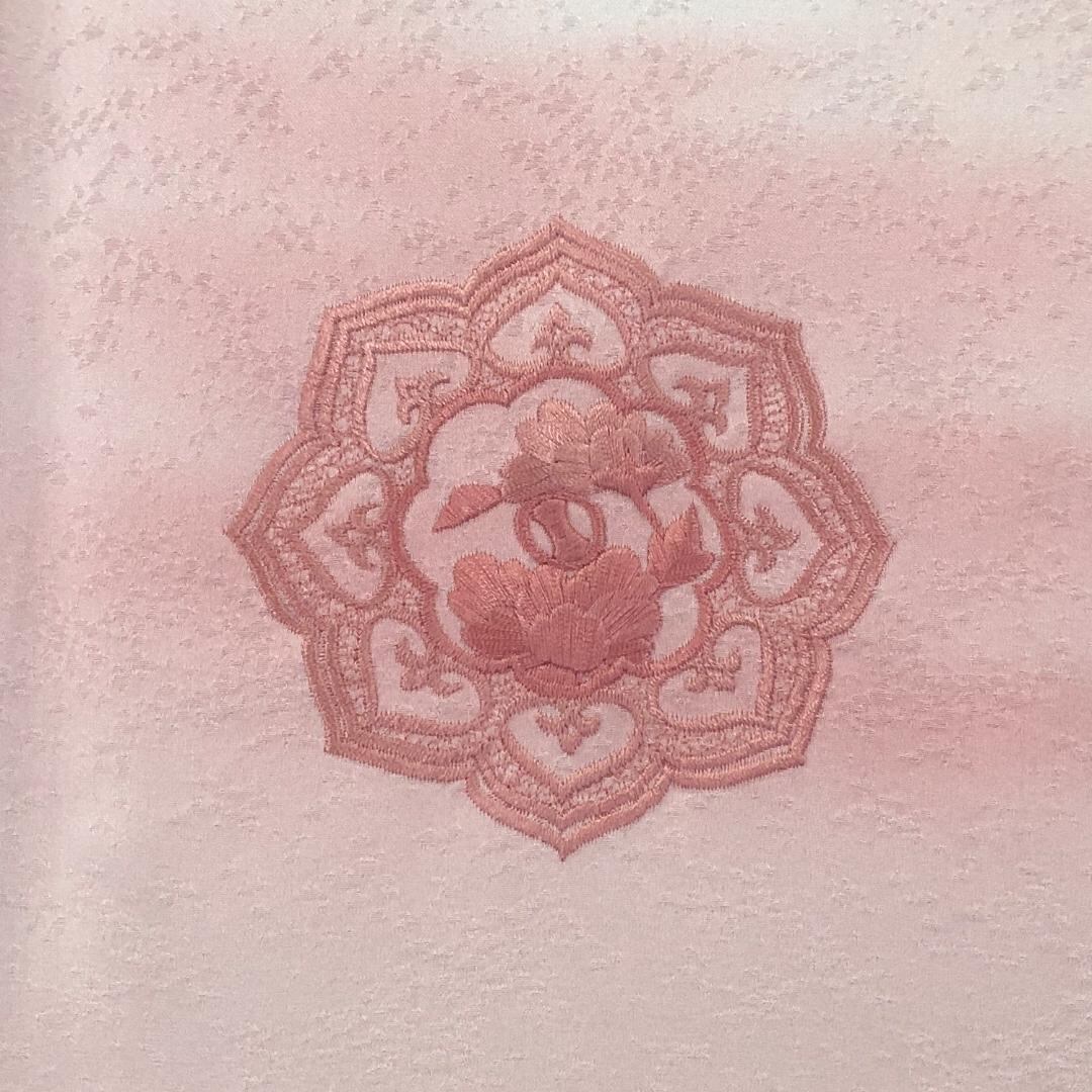 薄曙色ベースのお色味に暈し、刺繍の鏡に花模様の柄裄がデザインされた素敵なお品でございます。