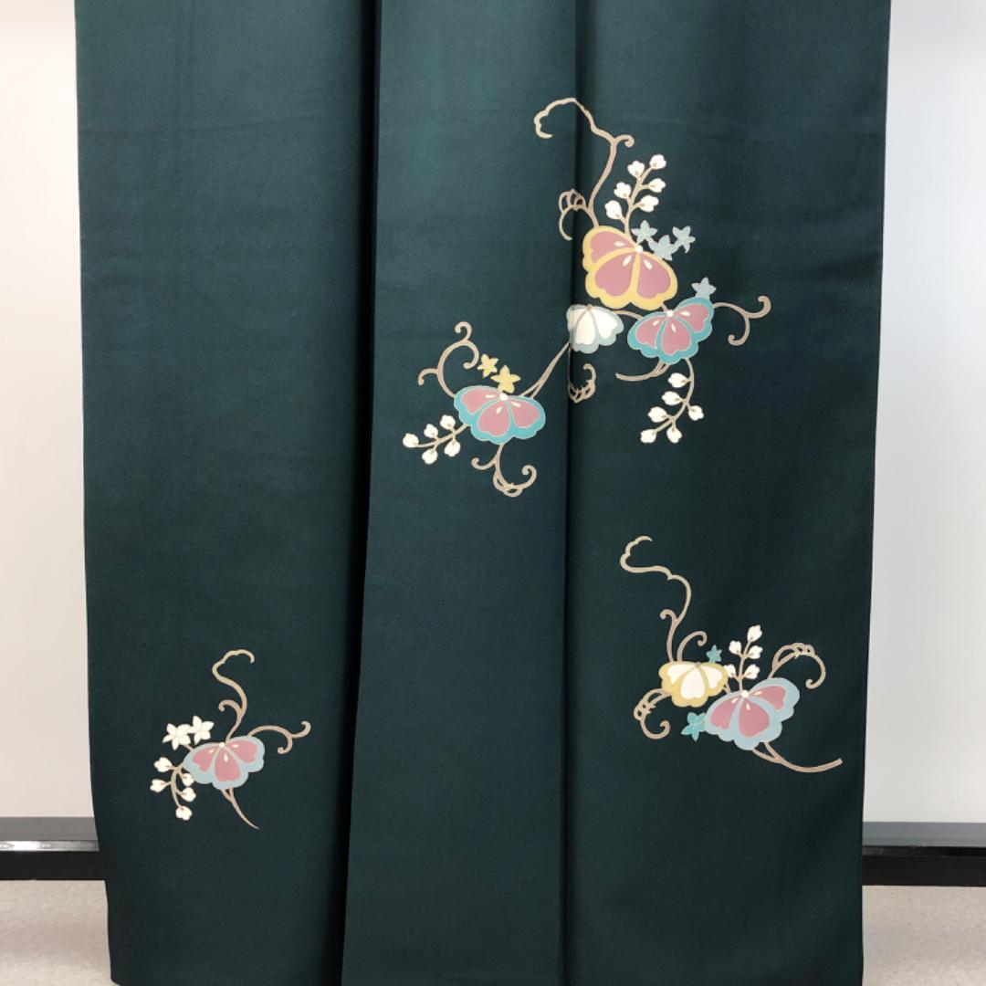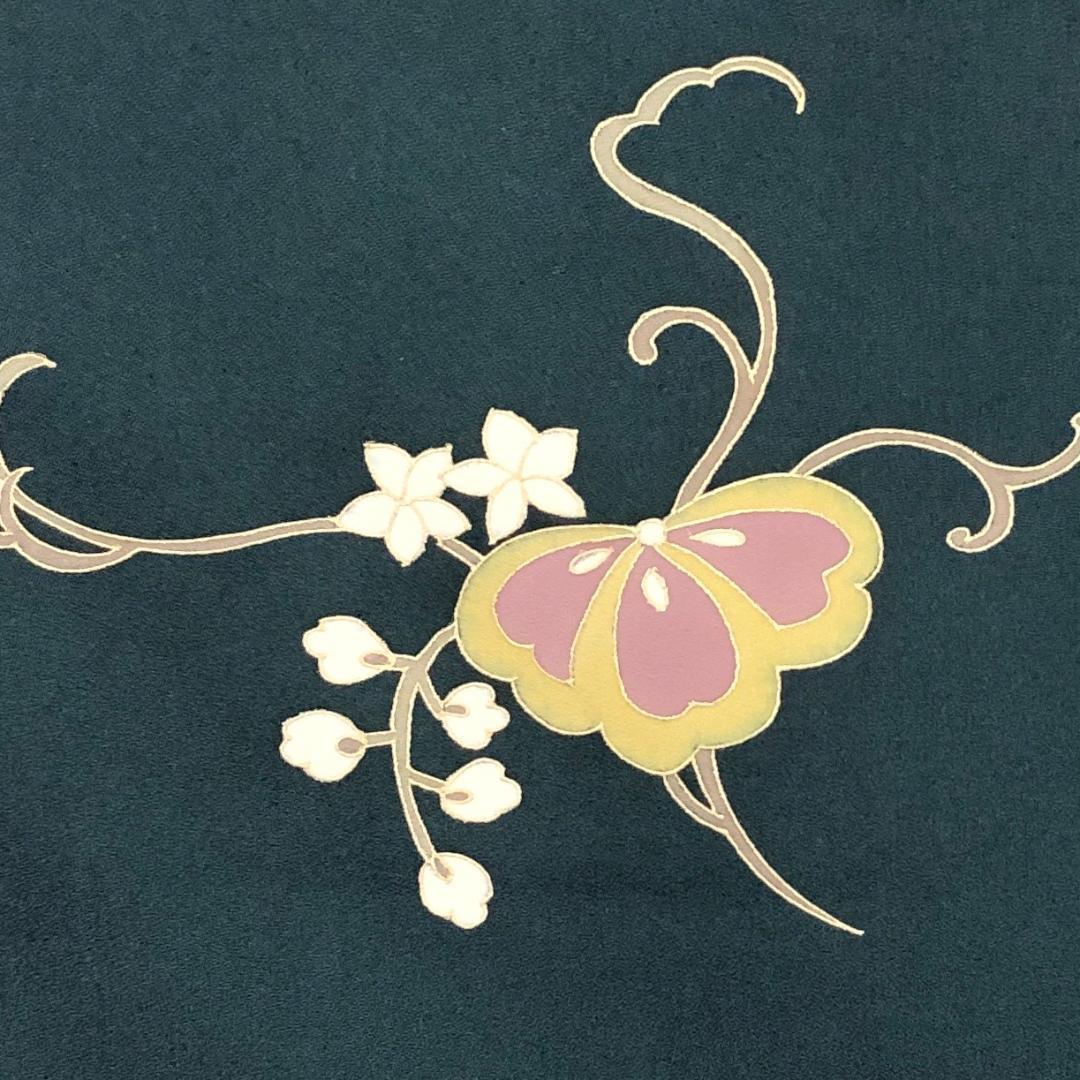 鉄色の落ち着いたお色味に花模様がデザインされた素敵な柄行のお品でございます。