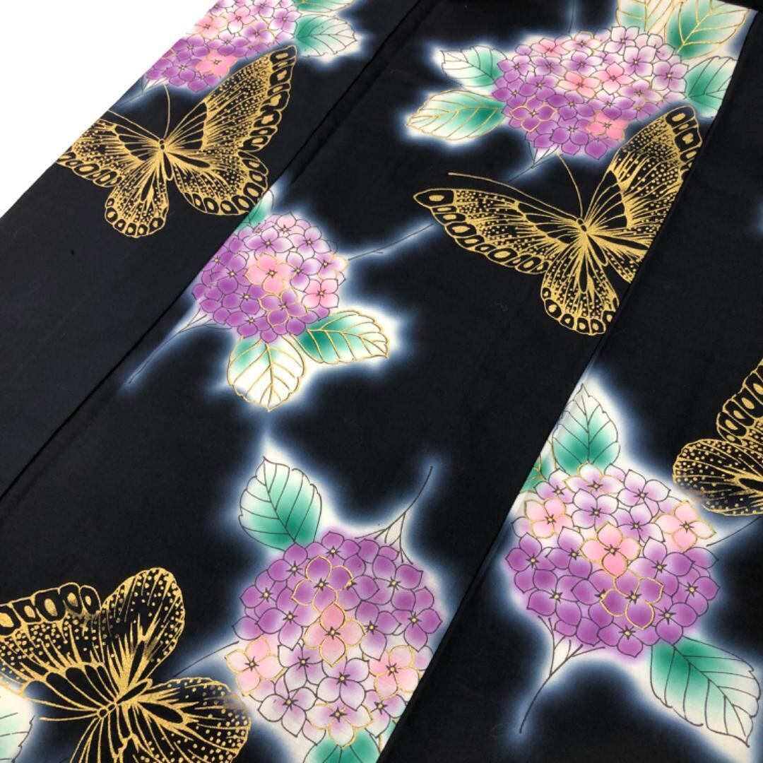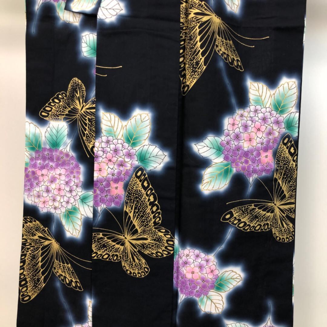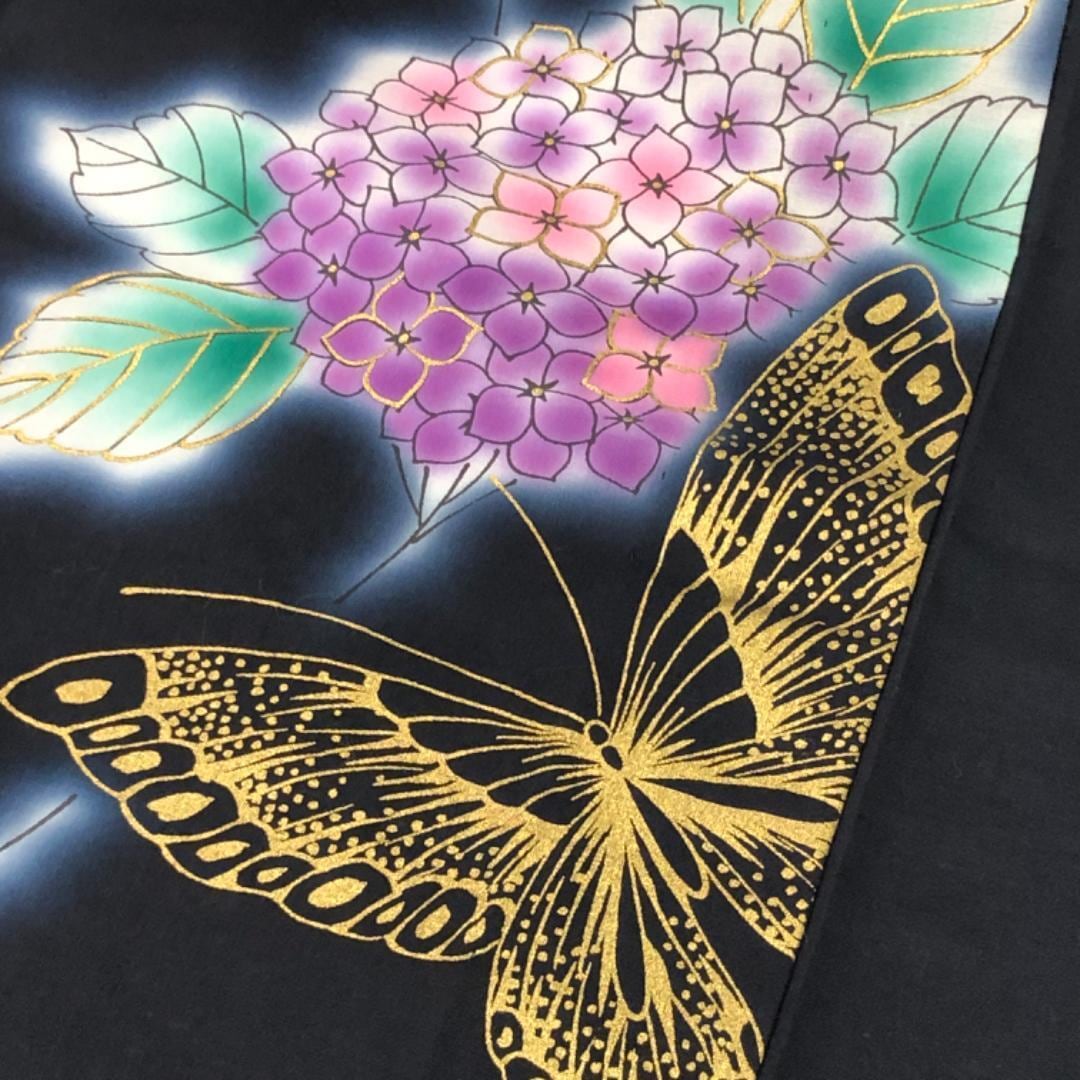 青褐色のお色味に蝶々に紫陽花の柄裄がデザインされた素敵なお品でございます。