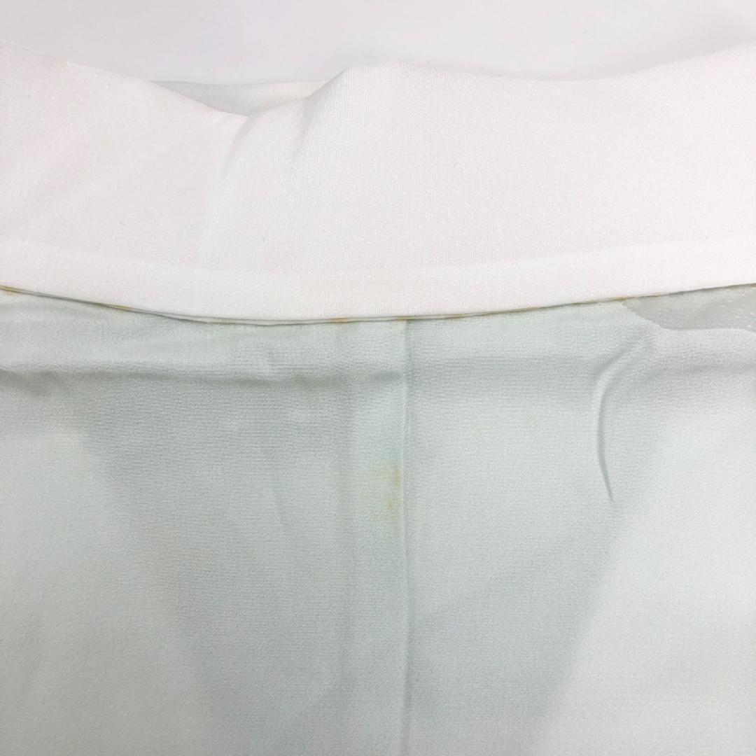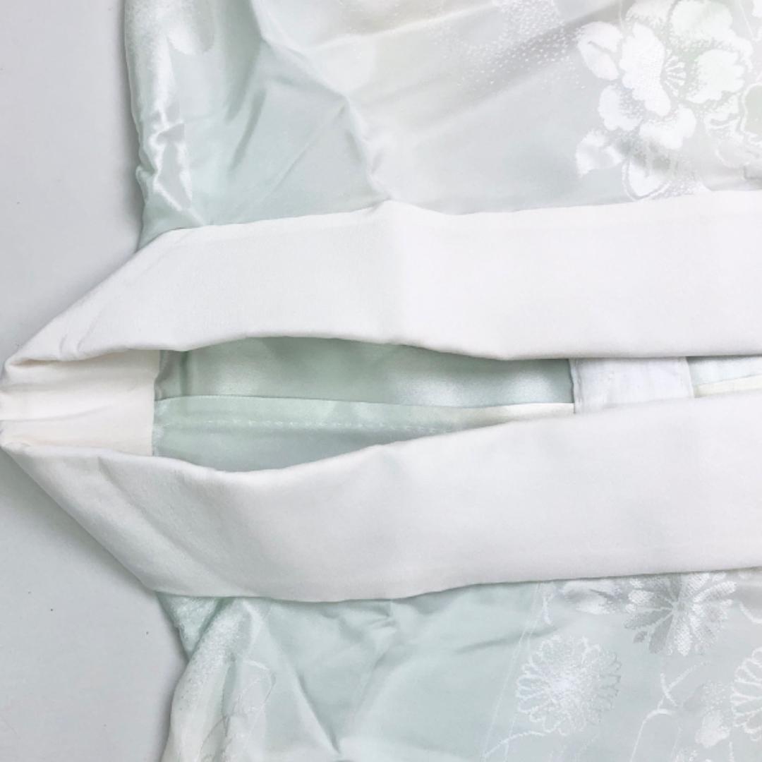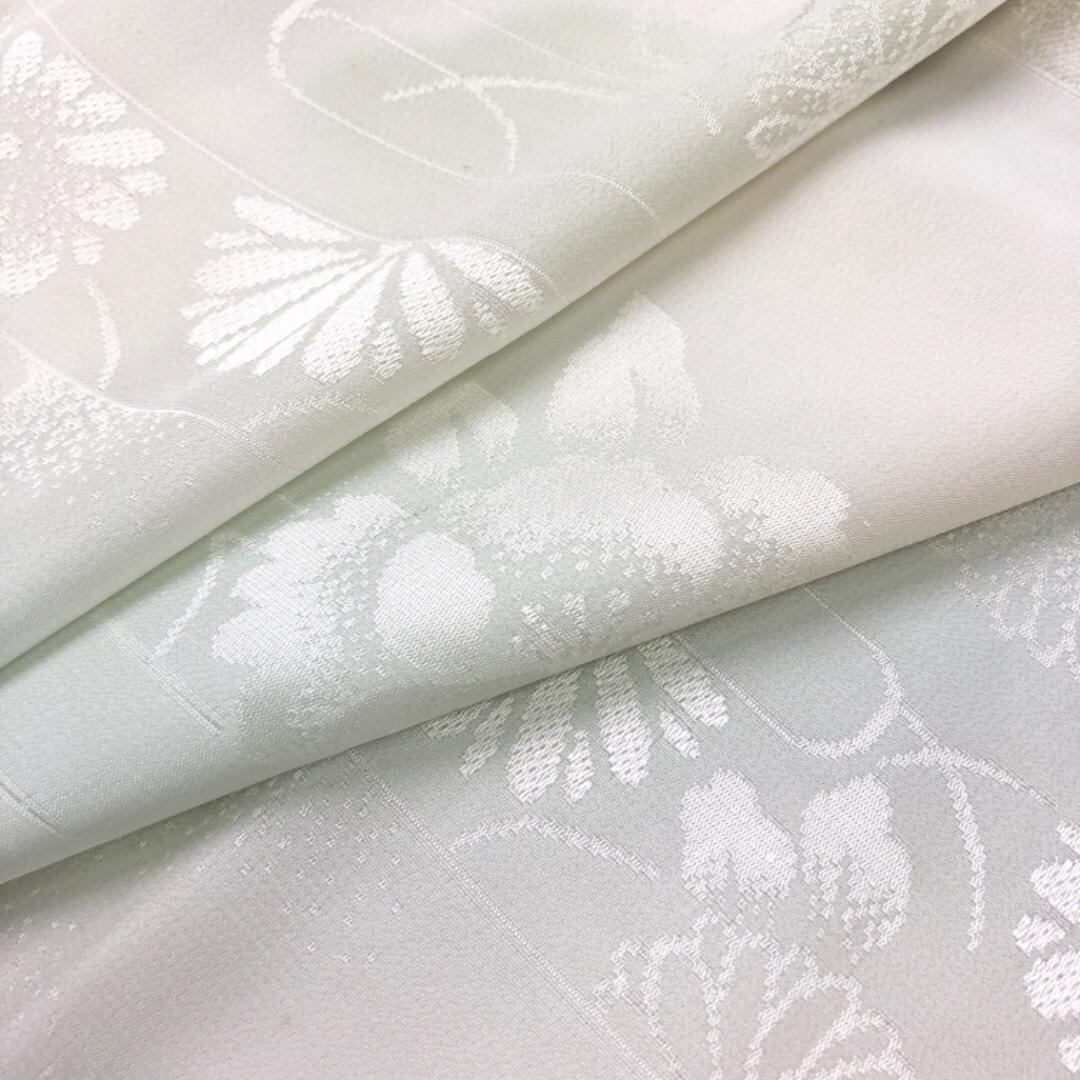 白緑色の薄淡い緑系のお色味に霞に花模様の柄裄がデザインされた素敵なお品でございます。