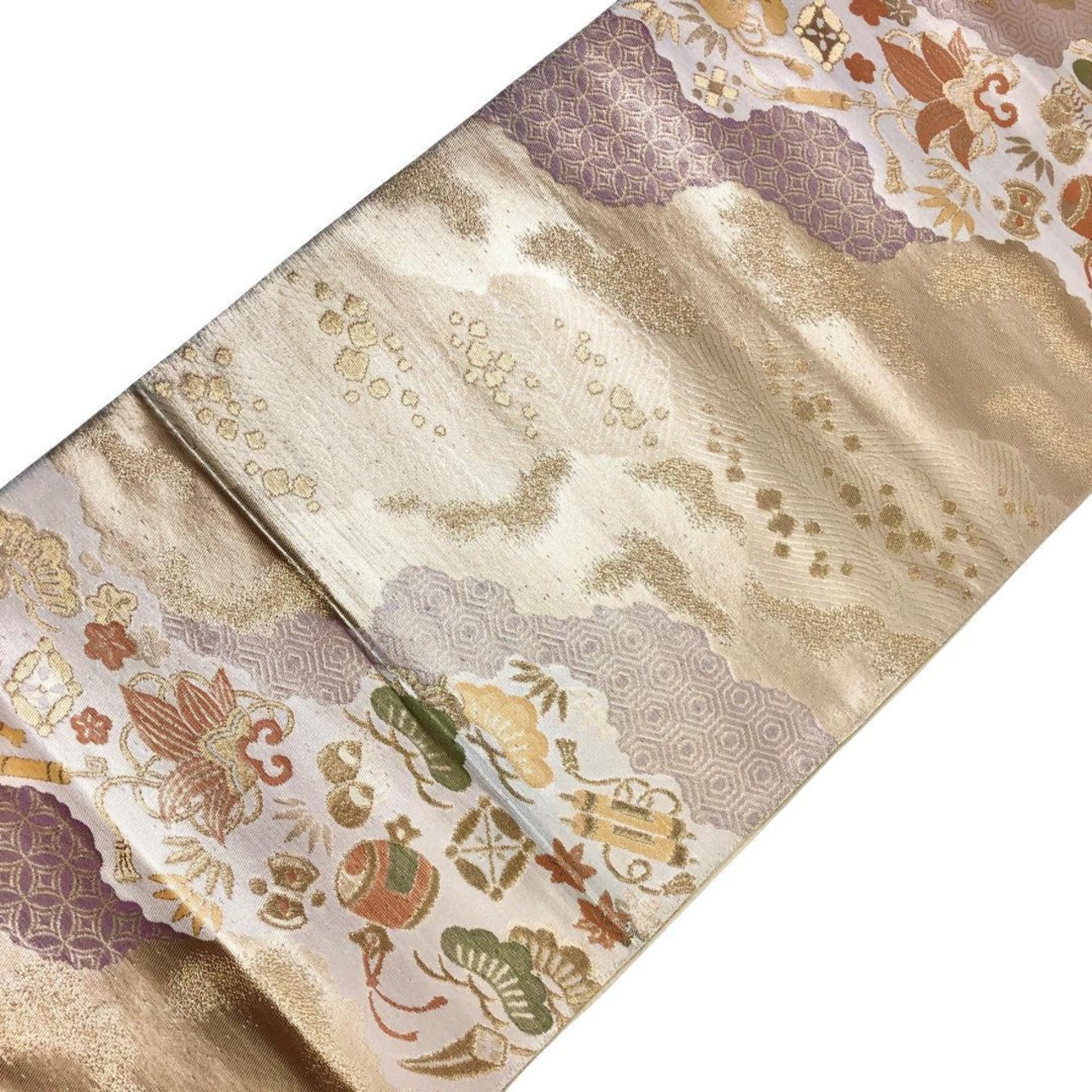 金色のお色味に道長取りに宝尽くし、七宝柄、亀甲柄がデザインされた素敵な柄裄のお品でございます。