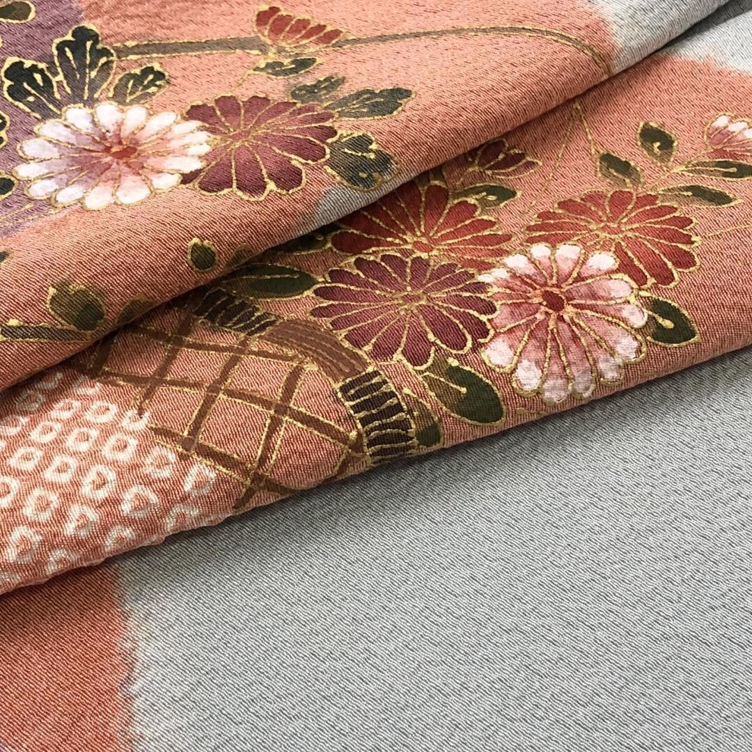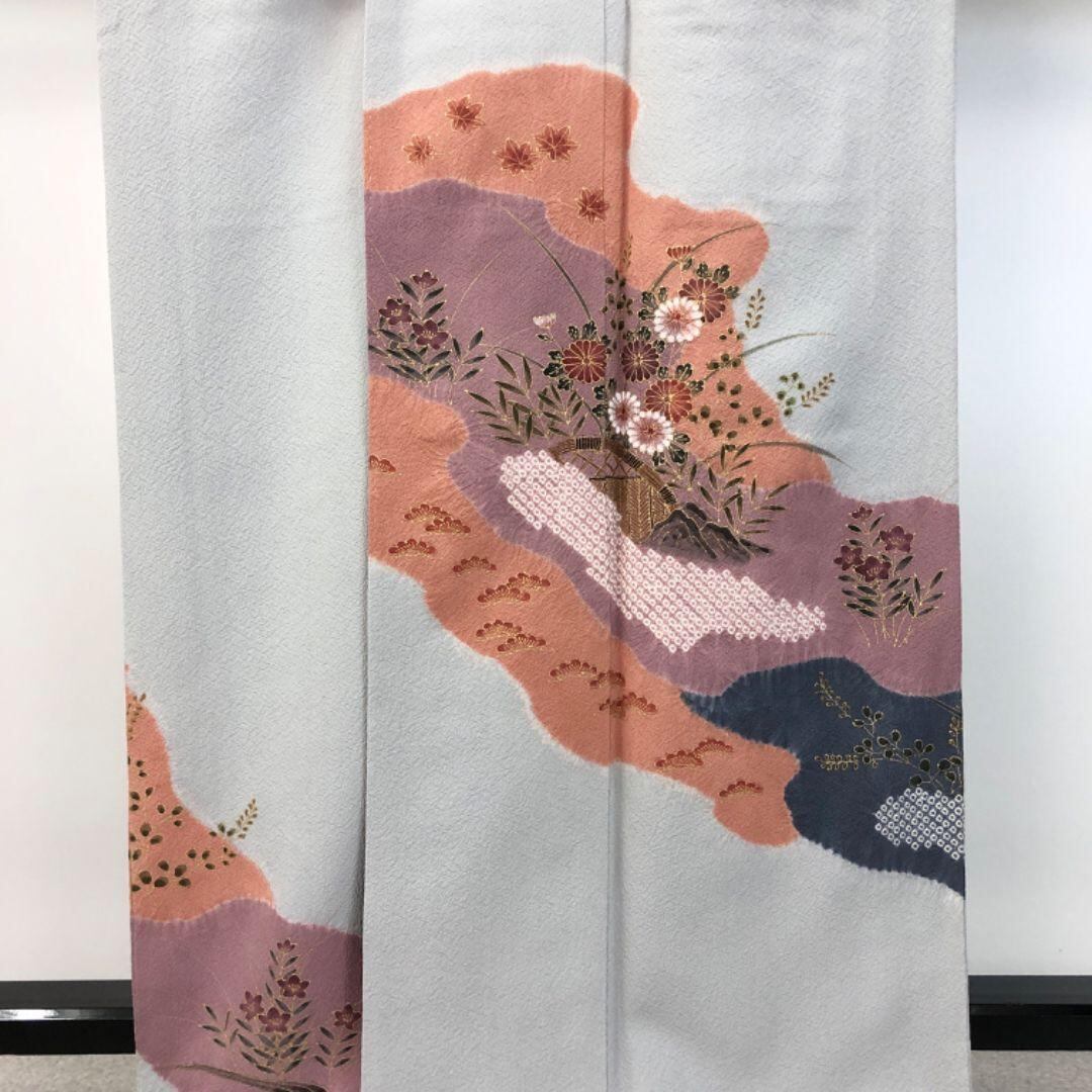 水銀色の上品なお色味に絞りの霞模様、花柄模様がデザインされた素敵なお品でございます。