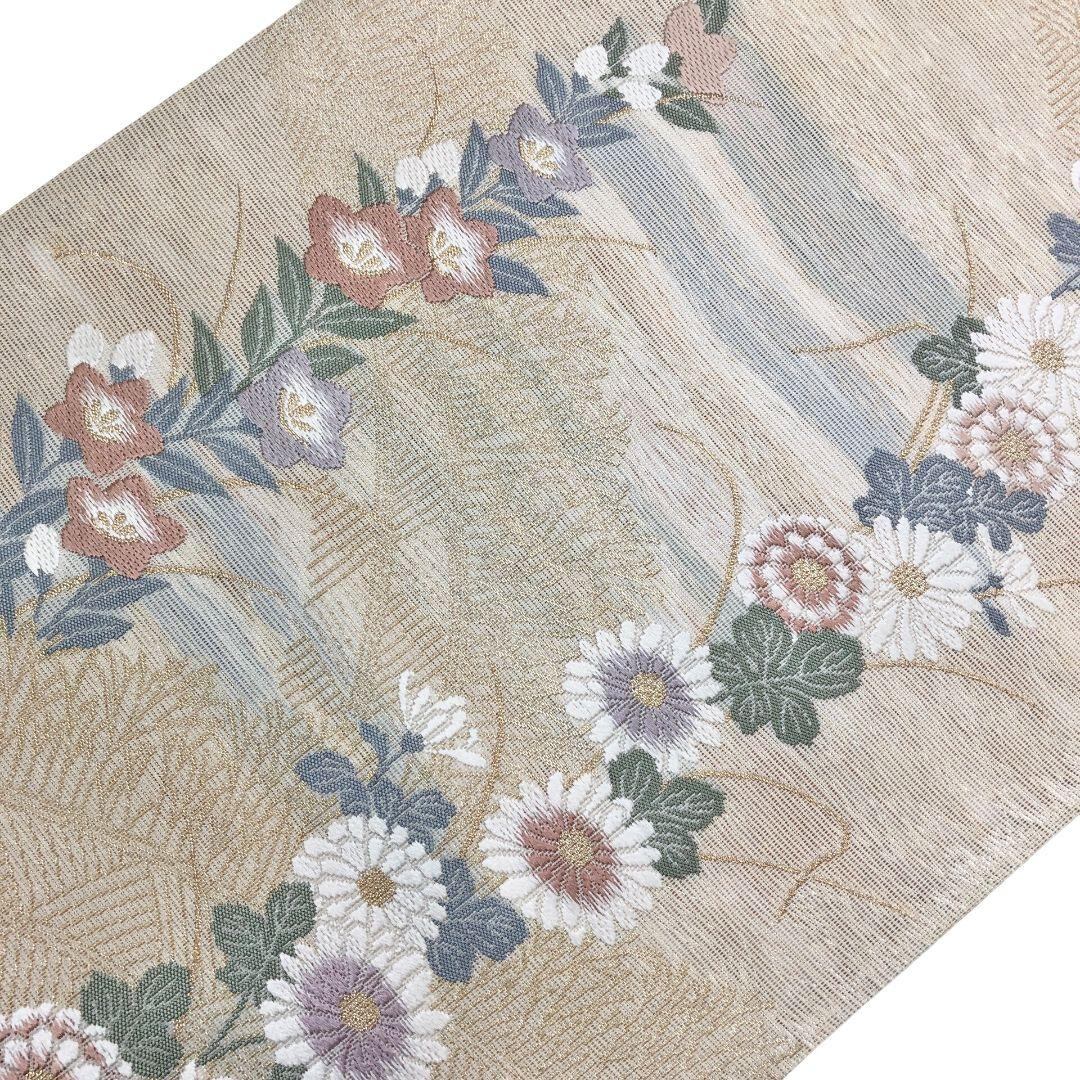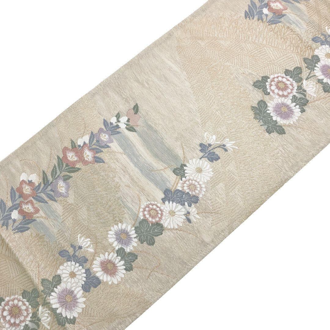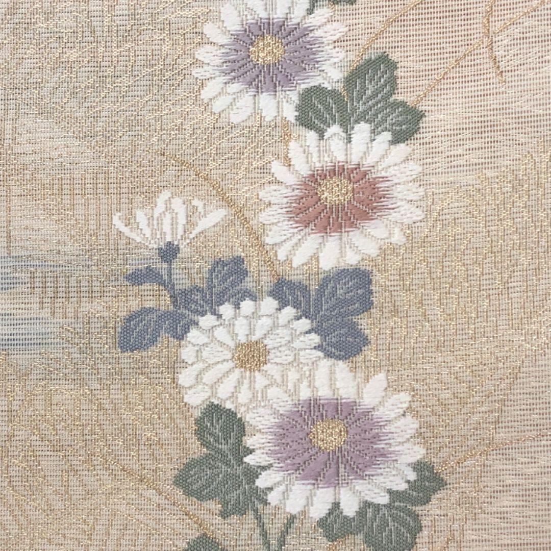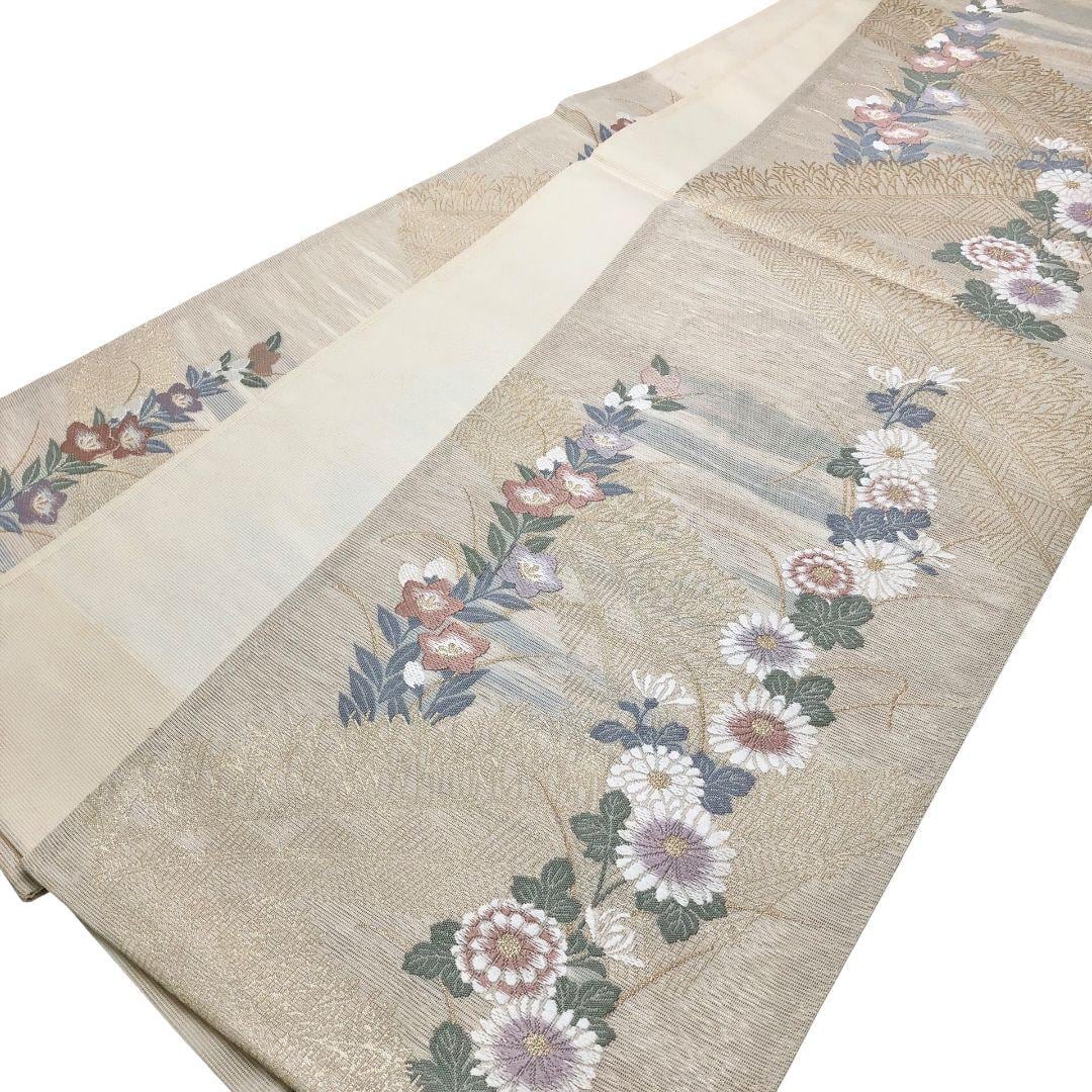 生成色のお色味に桔梗、菊などの花模様の柄裄がデザインされた素敵なお品でございます。