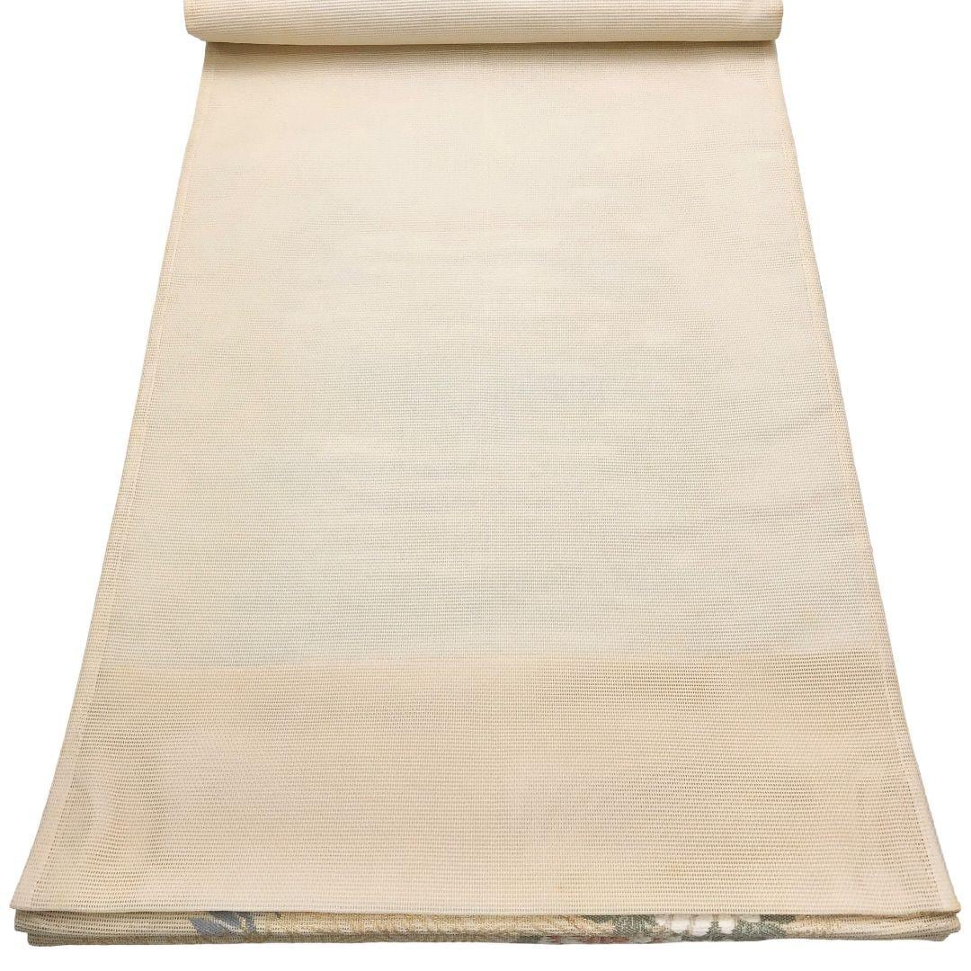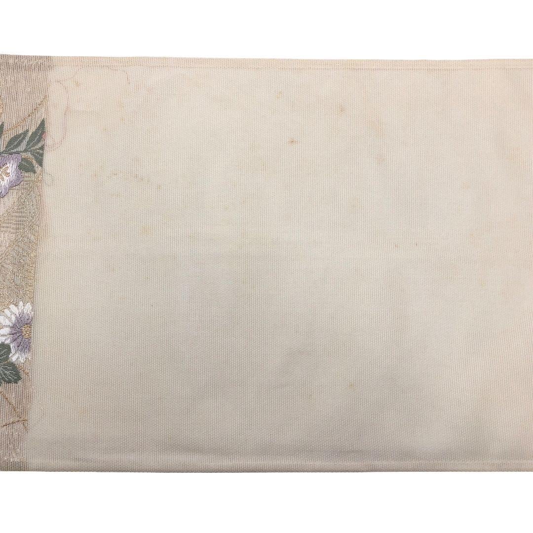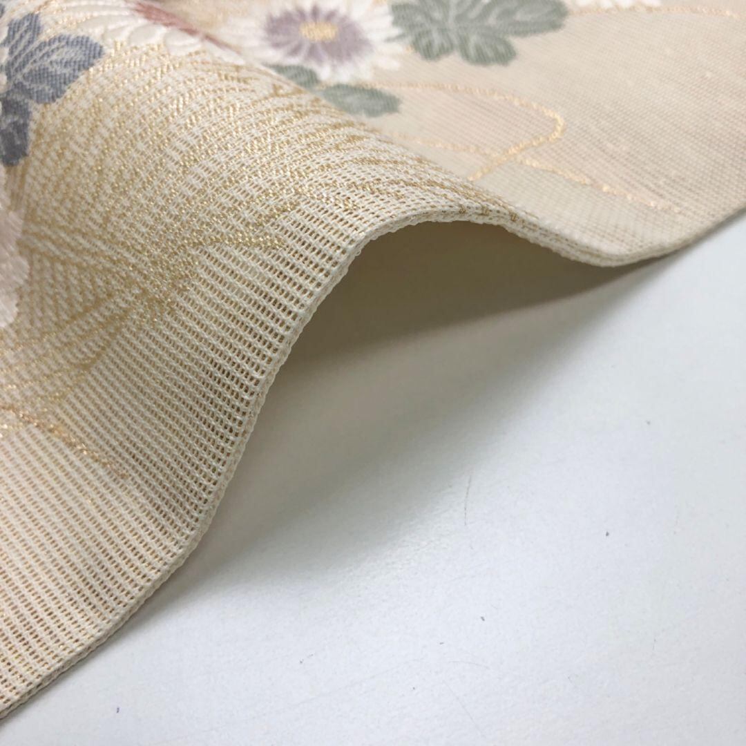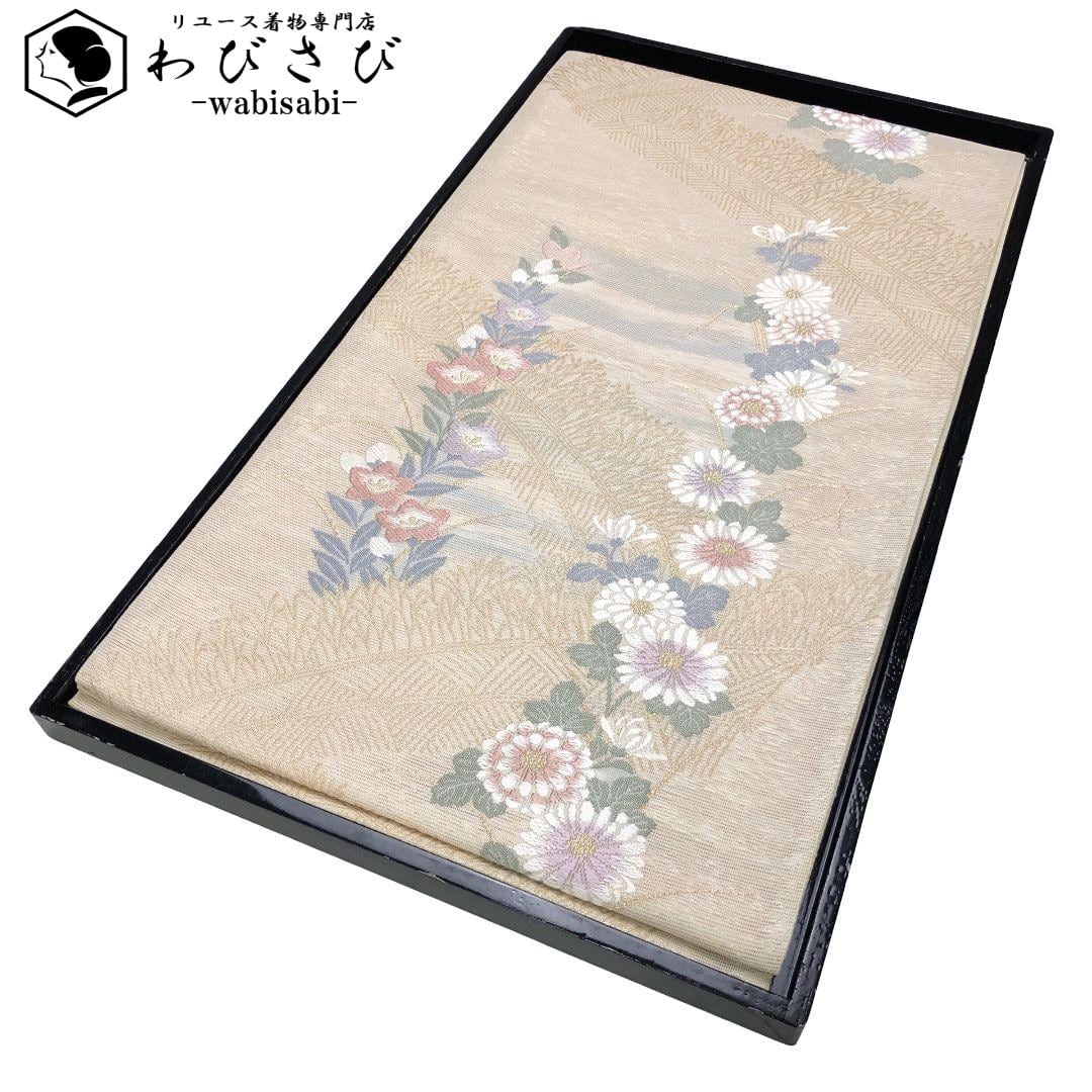 生成色のお色味に桔梗、菊などの花模様の柄裄がデザインされた素敵なお品でございます。