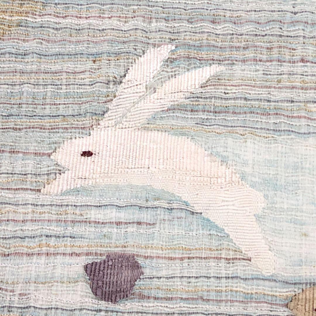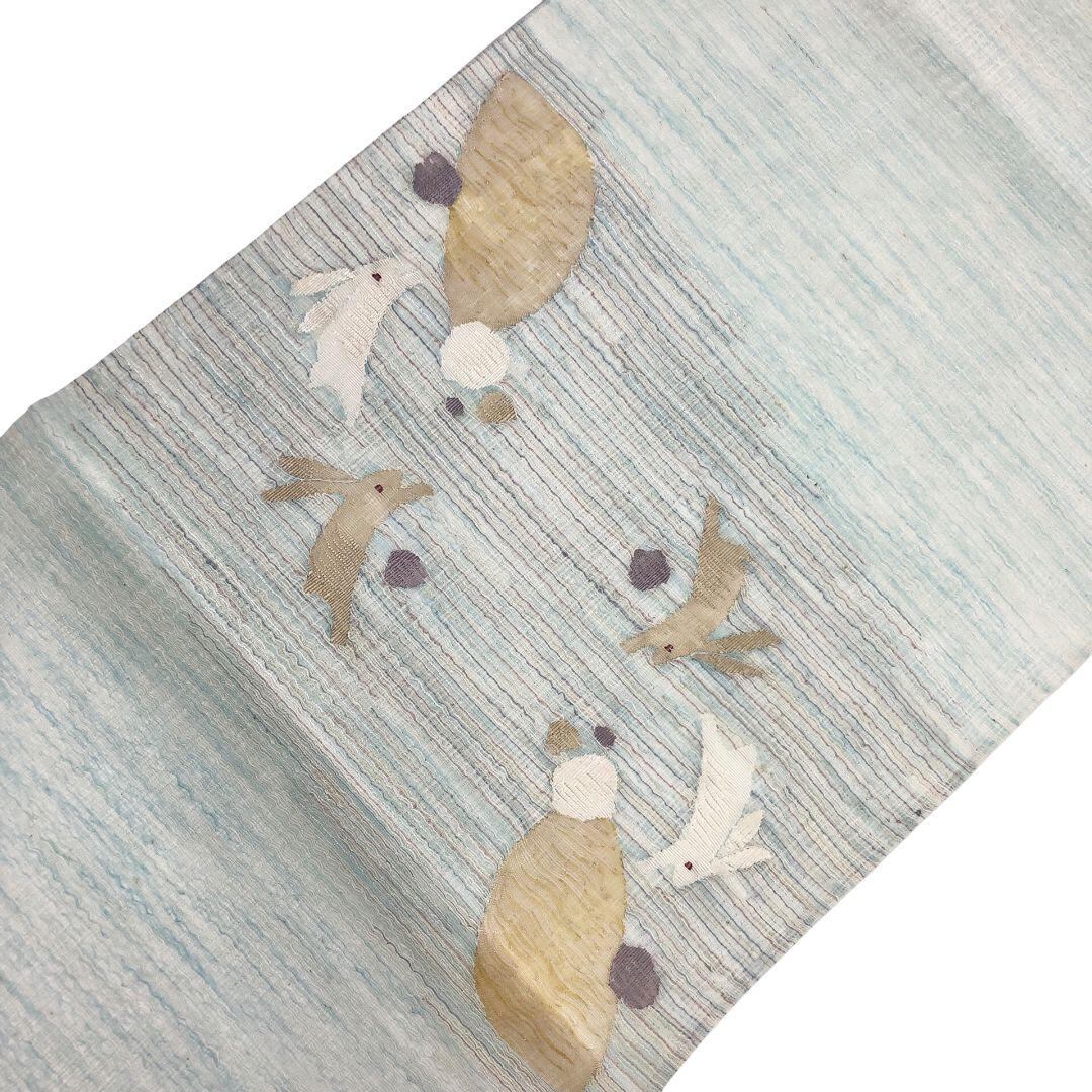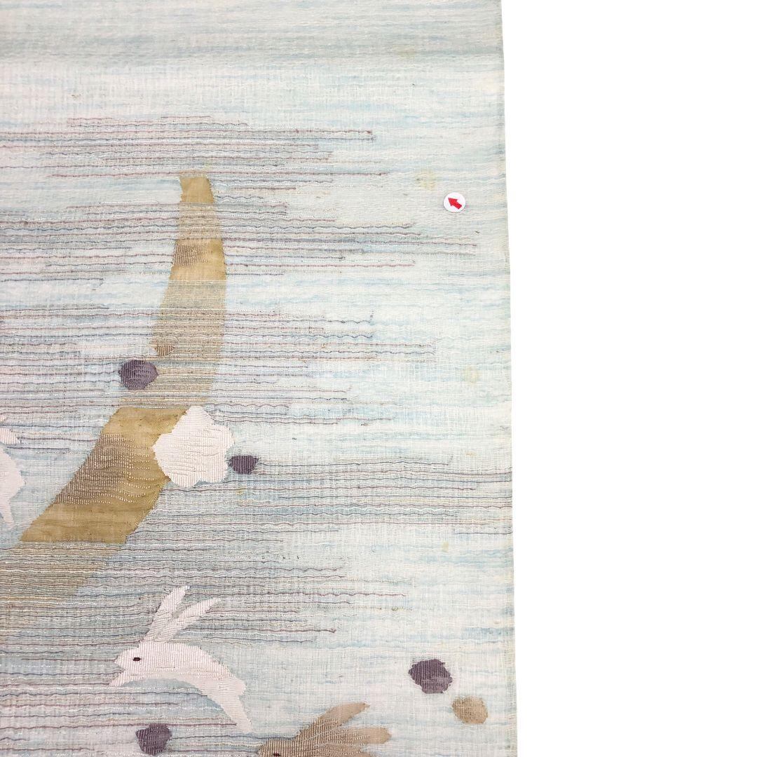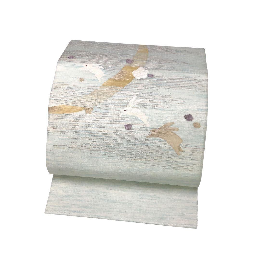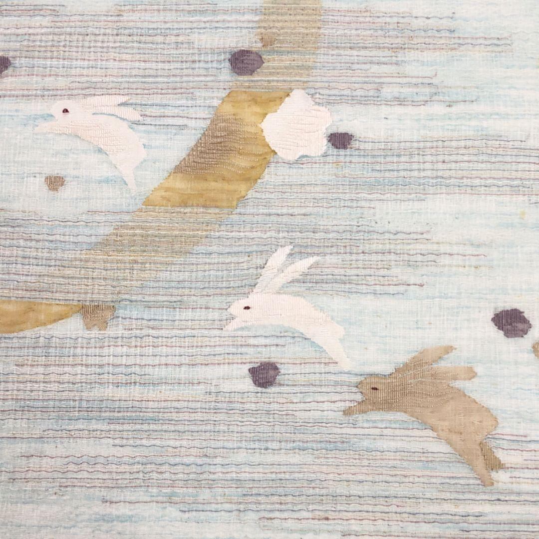 青白磁色の上品なお色味、三日月に可愛らしいうさぎ、水玉模様がデザインされた涼しげな色彩の素敵な柄裄のお品でございます。