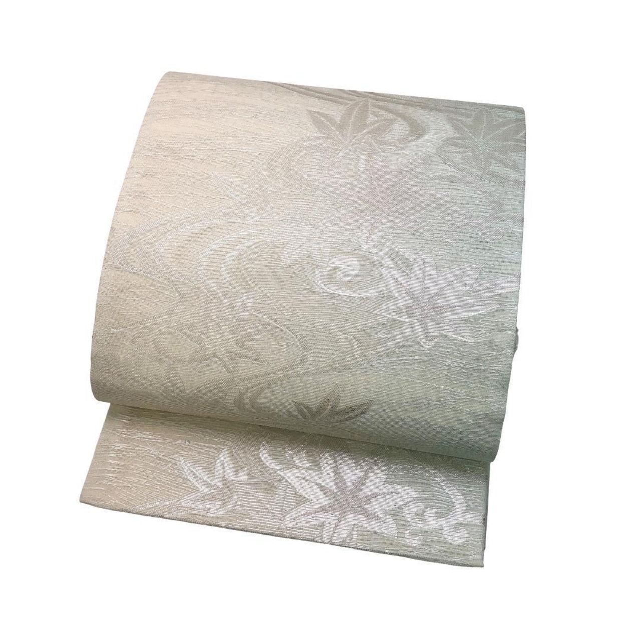 乳白色と薄緑色の淡く上品なグラデーションのお色味、流水に紅葉の柄裄がデザインされた涼しげな雰囲気の素敵なお品でございます。
