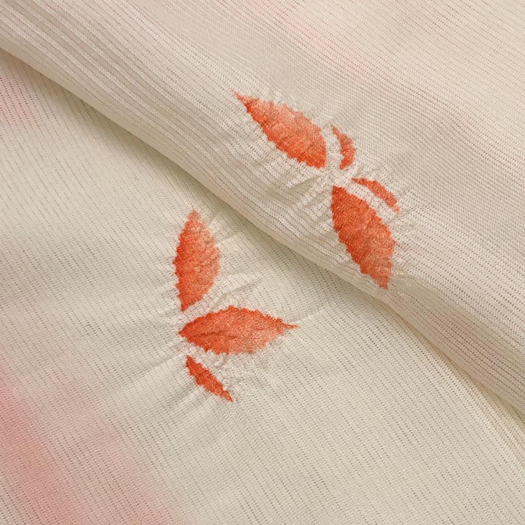 乳白色のお色味に絞りで蝶々の柄裄がデザインされた素敵なお品でございます。