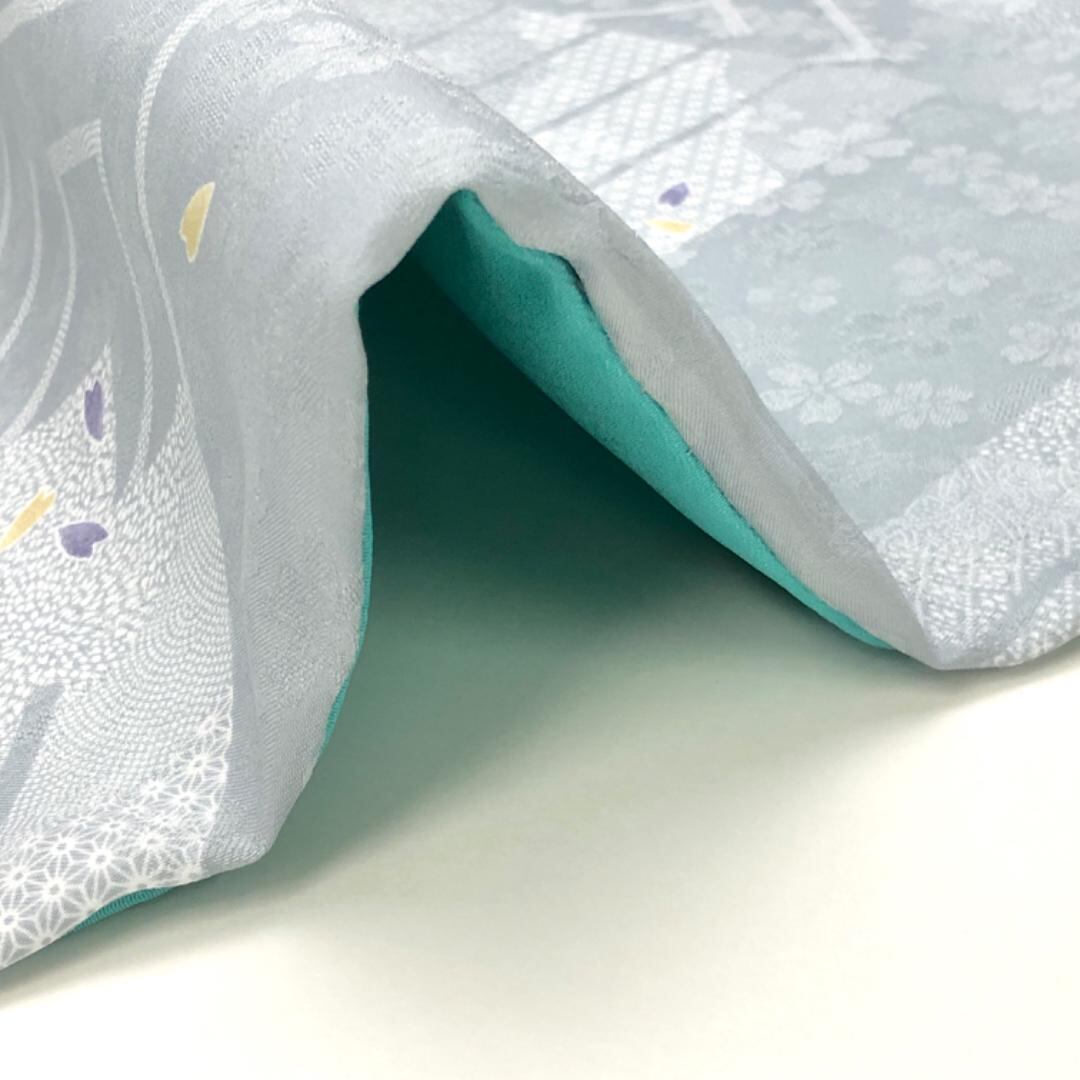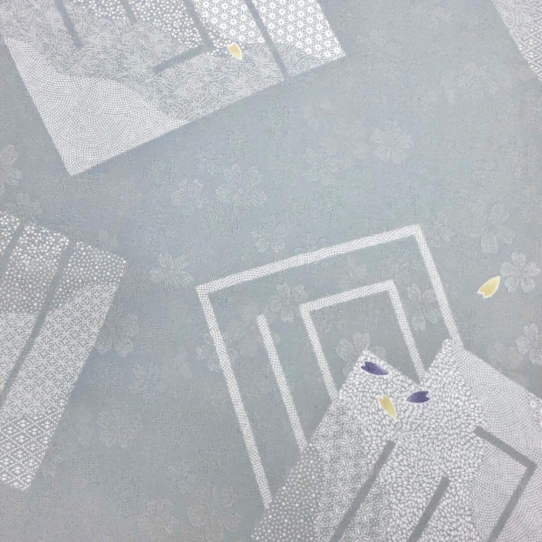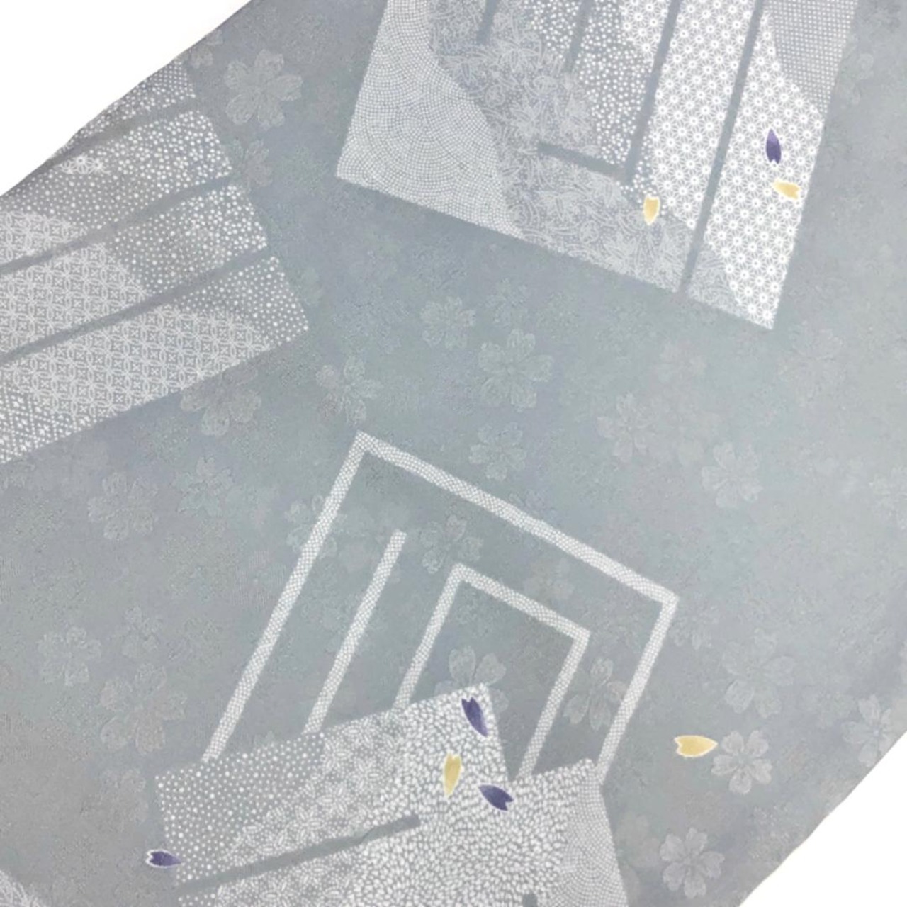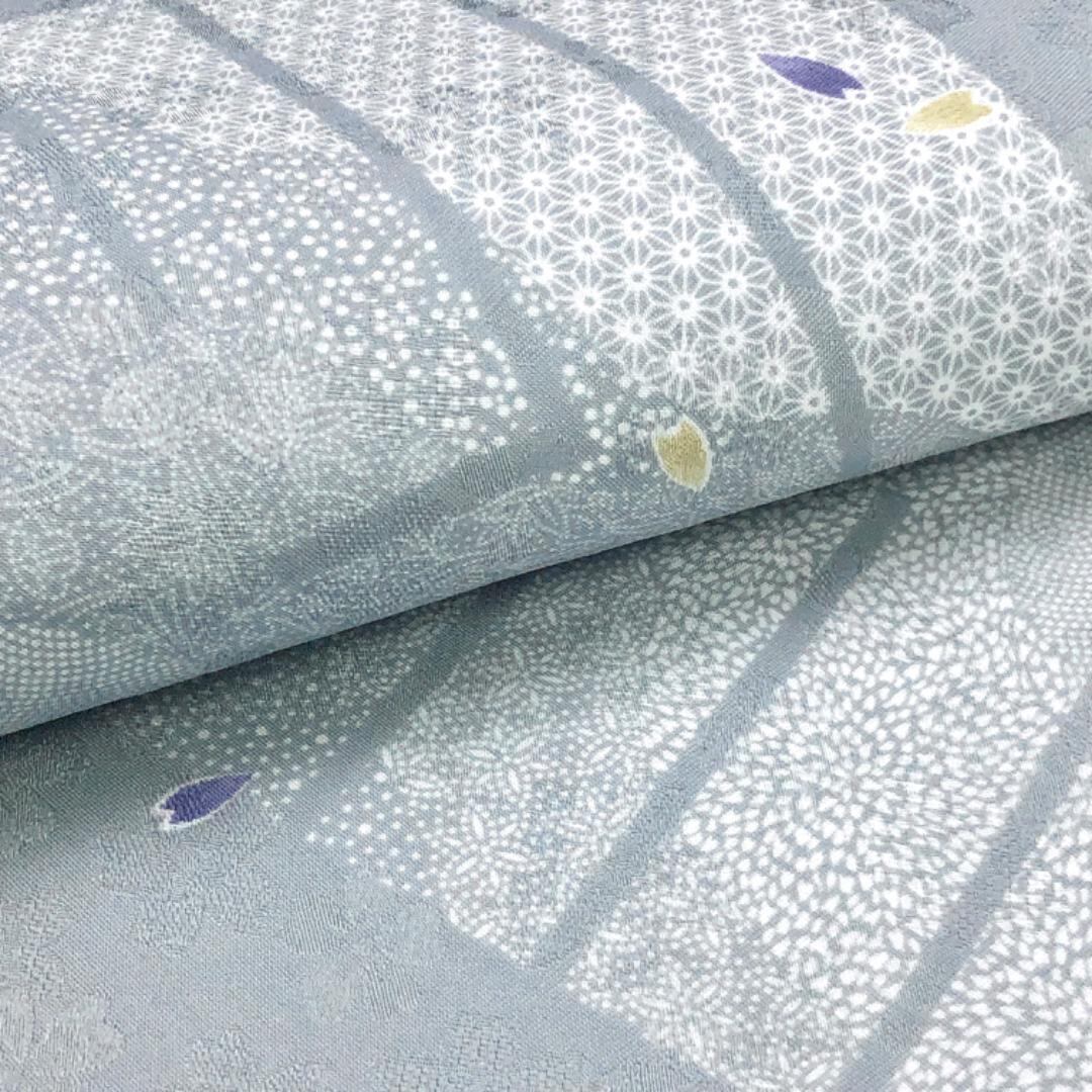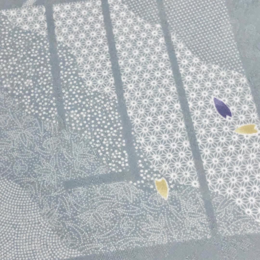 空色鼠色の上品なお色味に源氏香に桜の花びらがデザインされた素敵な柄裄のお品でございます。