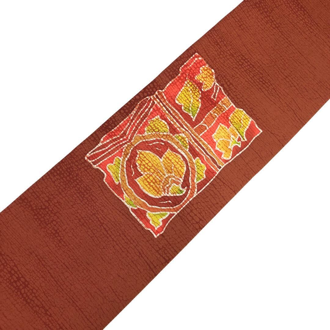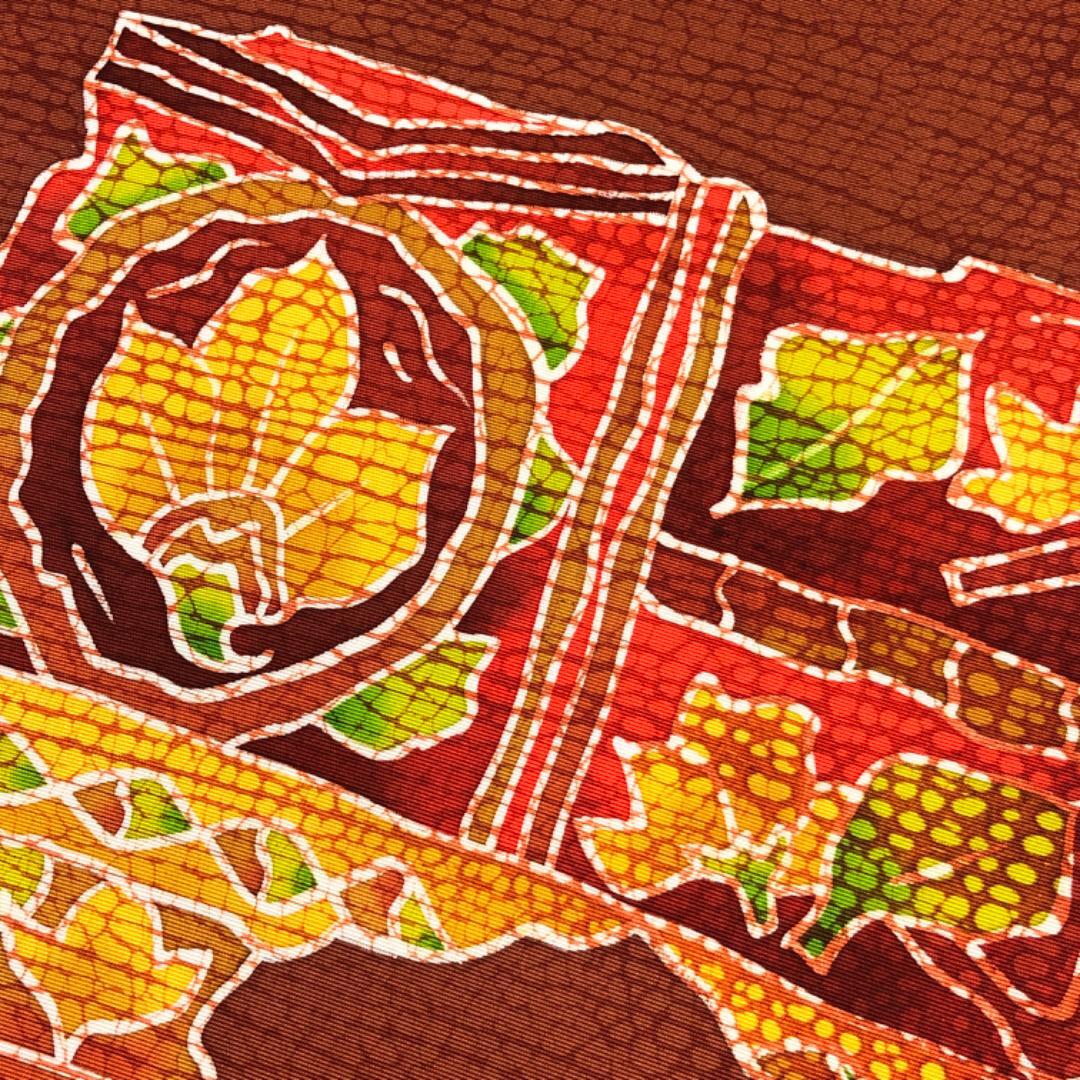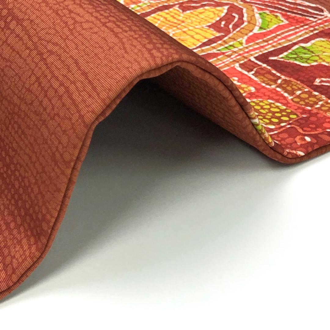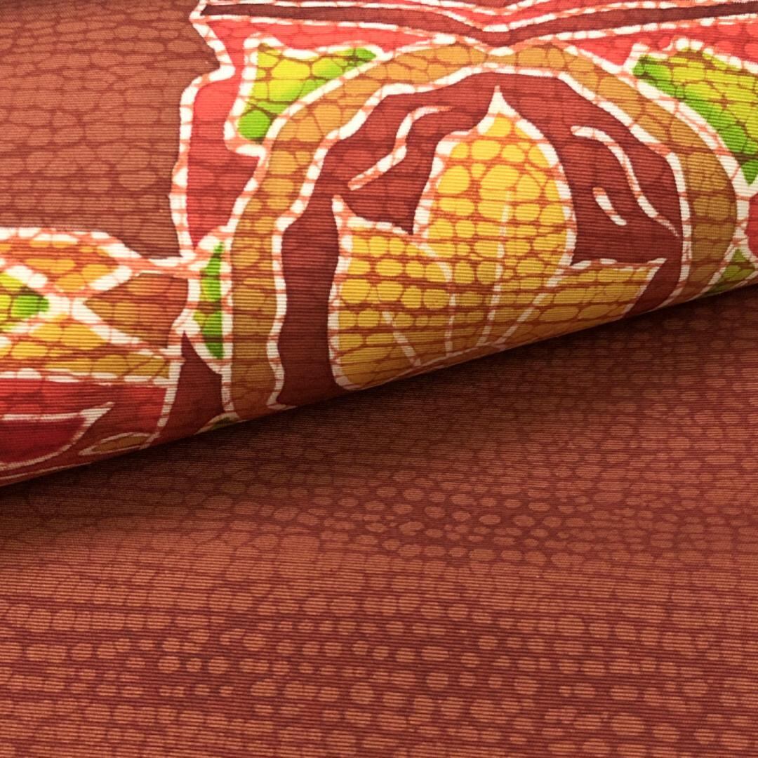 赤蘇芳色ベースのお色味に抽象花唐草模様がデザインされた素敵な柄裄のお品でございます。