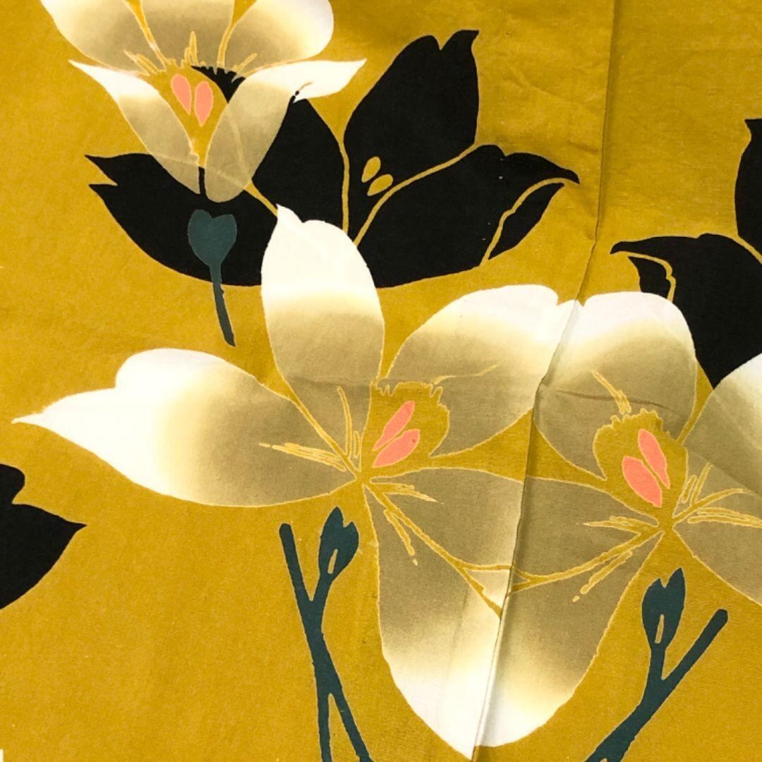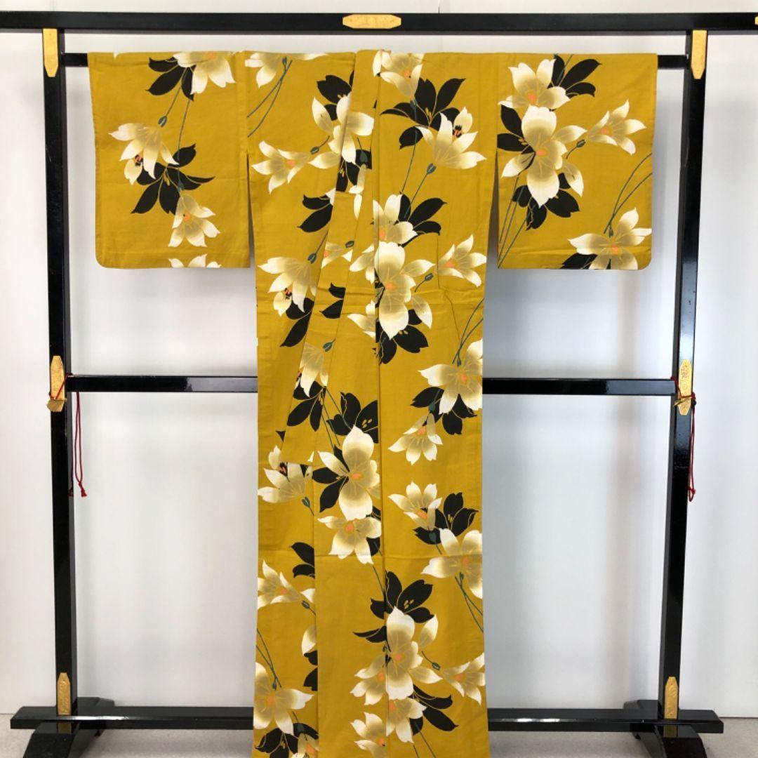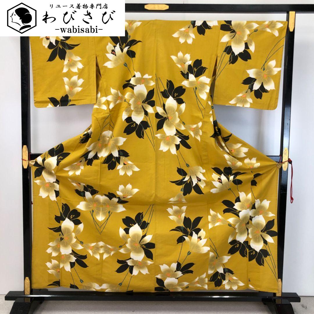 黄櫨色のお色味に美しい花模様の柄裄がデザインされた素敵なお品でございます。