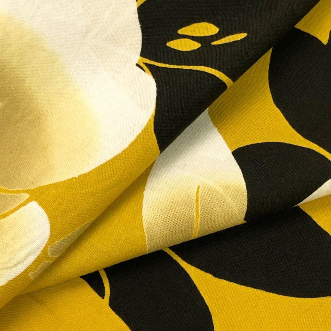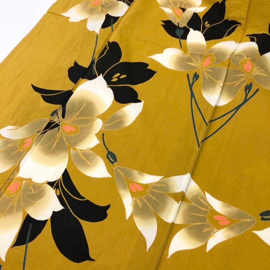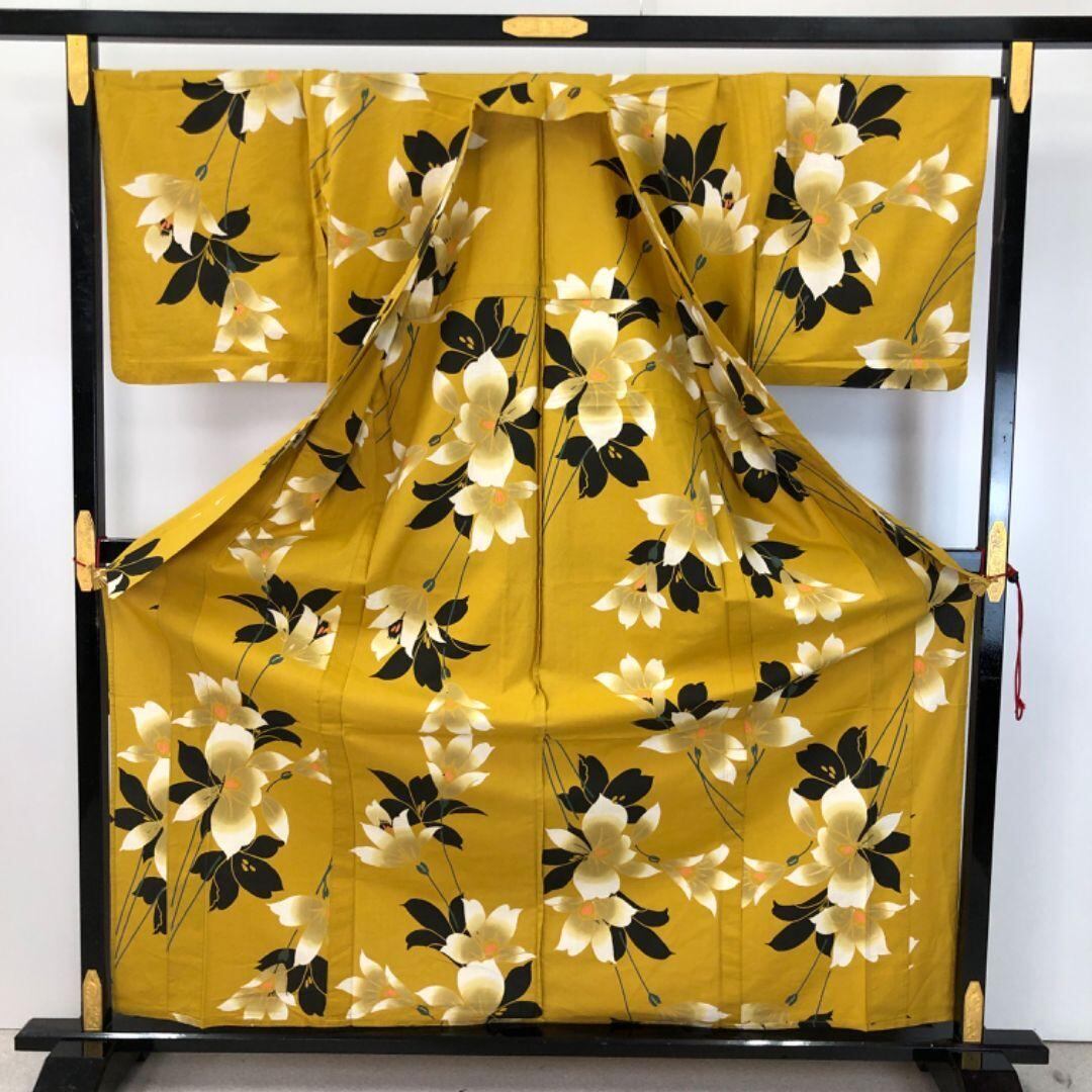 黄櫨色のお色味に美しい花模様の柄裄がデザインされた素敵なお品でございます。