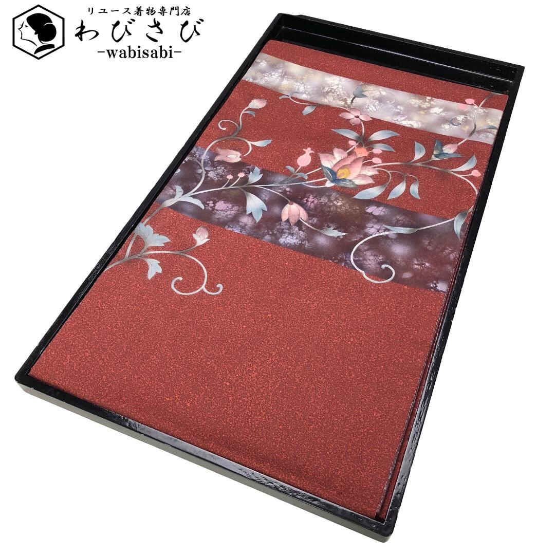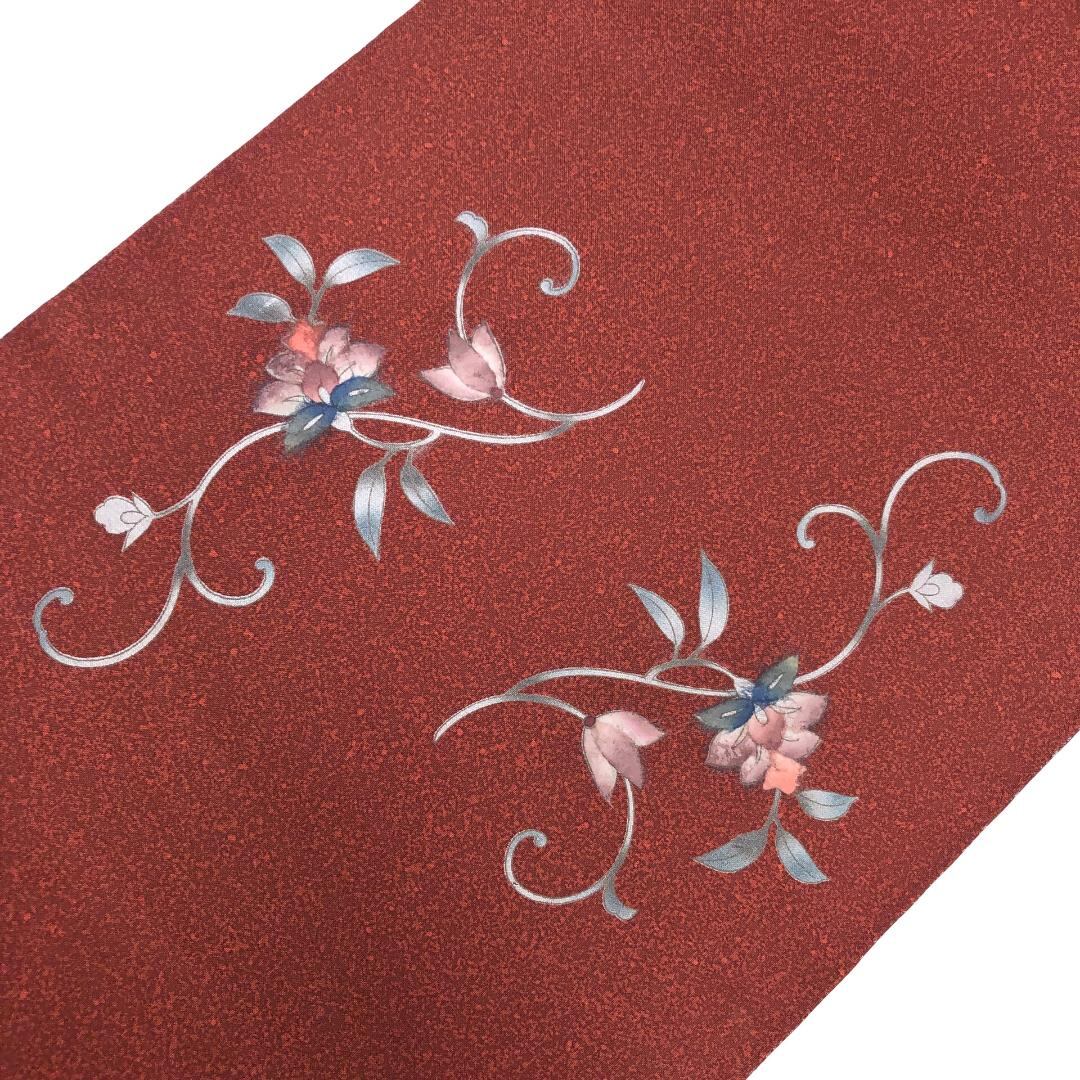 袋帯 手描き 花唐草模様 叩き染 海老色 O-5209 着物 きもの kimono 和服 和装 中古 リサイクル着物 【送料無料】