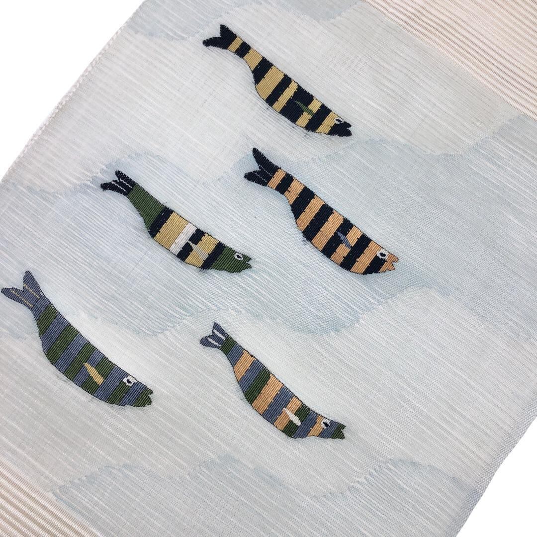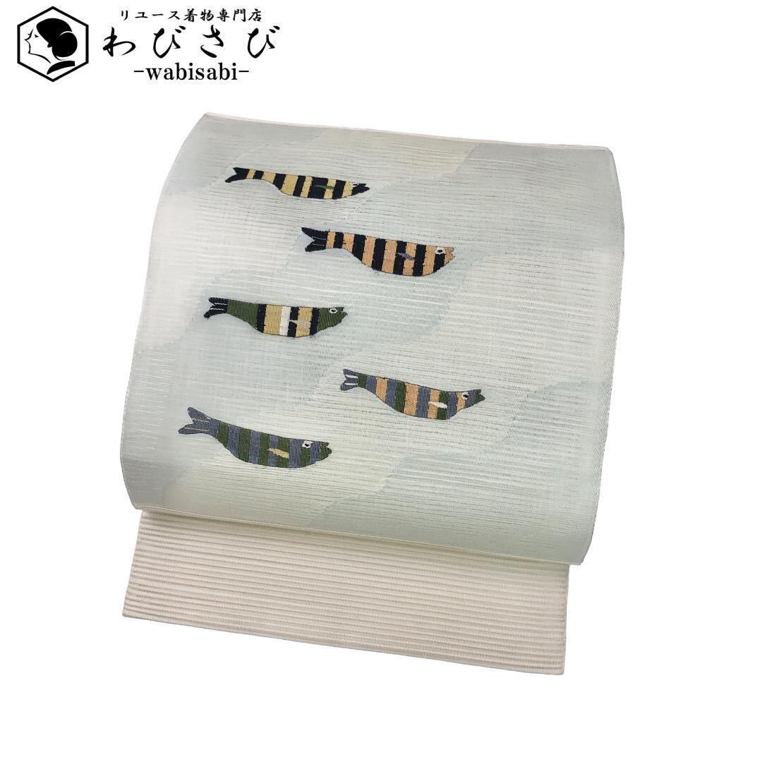 夏帯 名古屋帯 絽 縞模様の魚柄 乳白色 O-5275 着物 きもの kimono 和服 和装 中古 リサイクル着物 【送料無料】