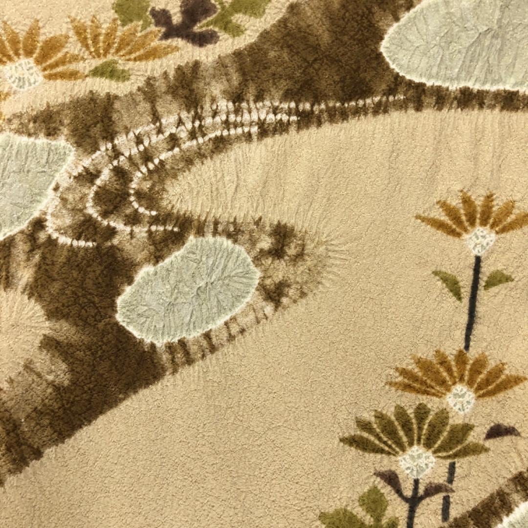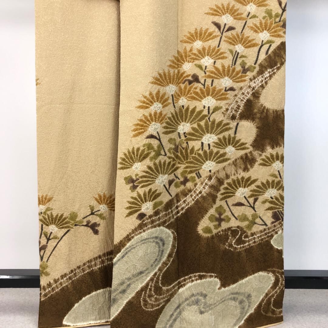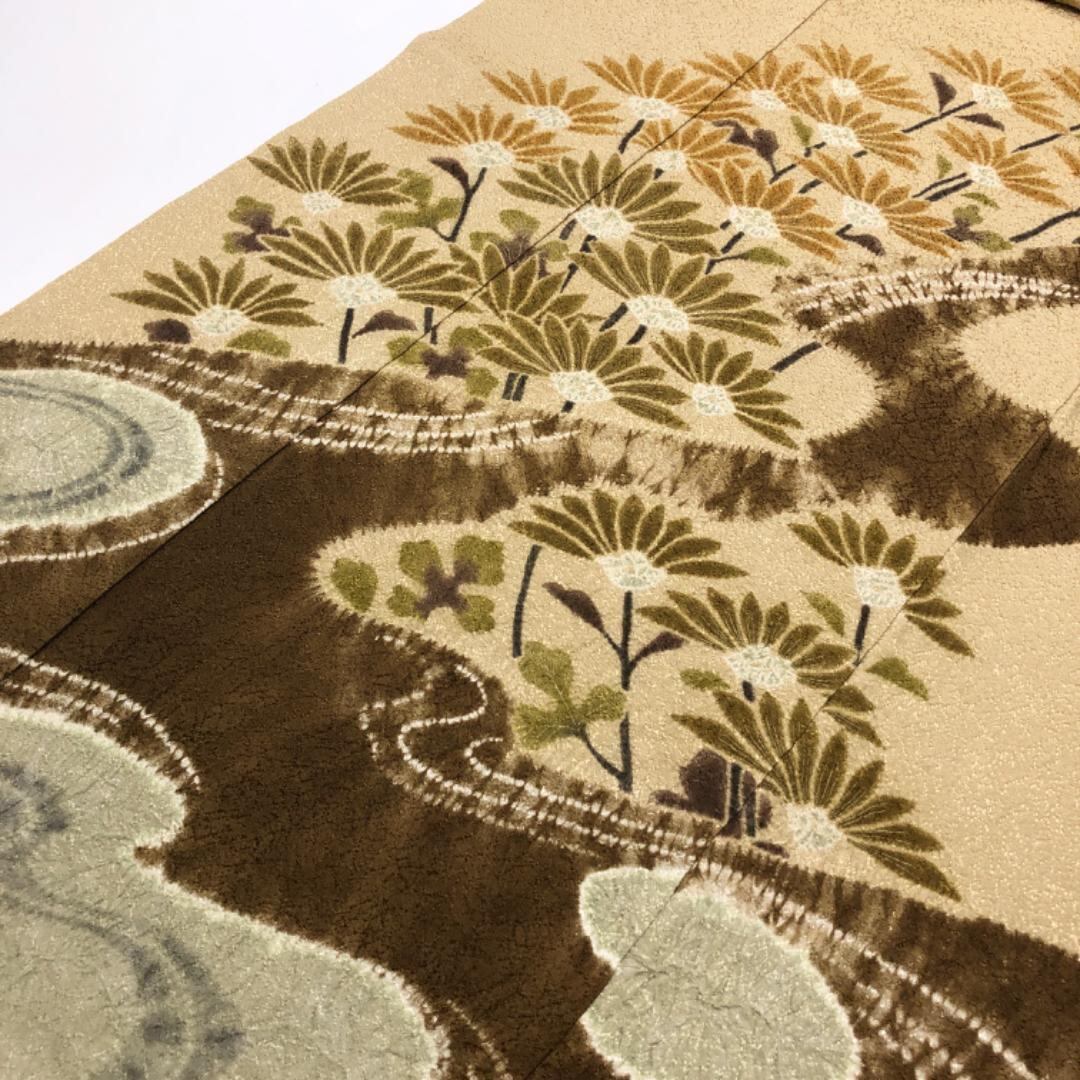 枯野色の落ち着きのあるお色味に雰囲気のある美しい絞りの花模様がデザインされた素敵な柄裄のお品でございます。