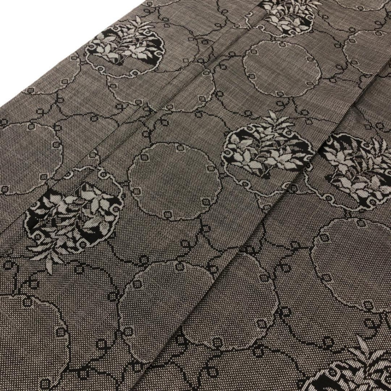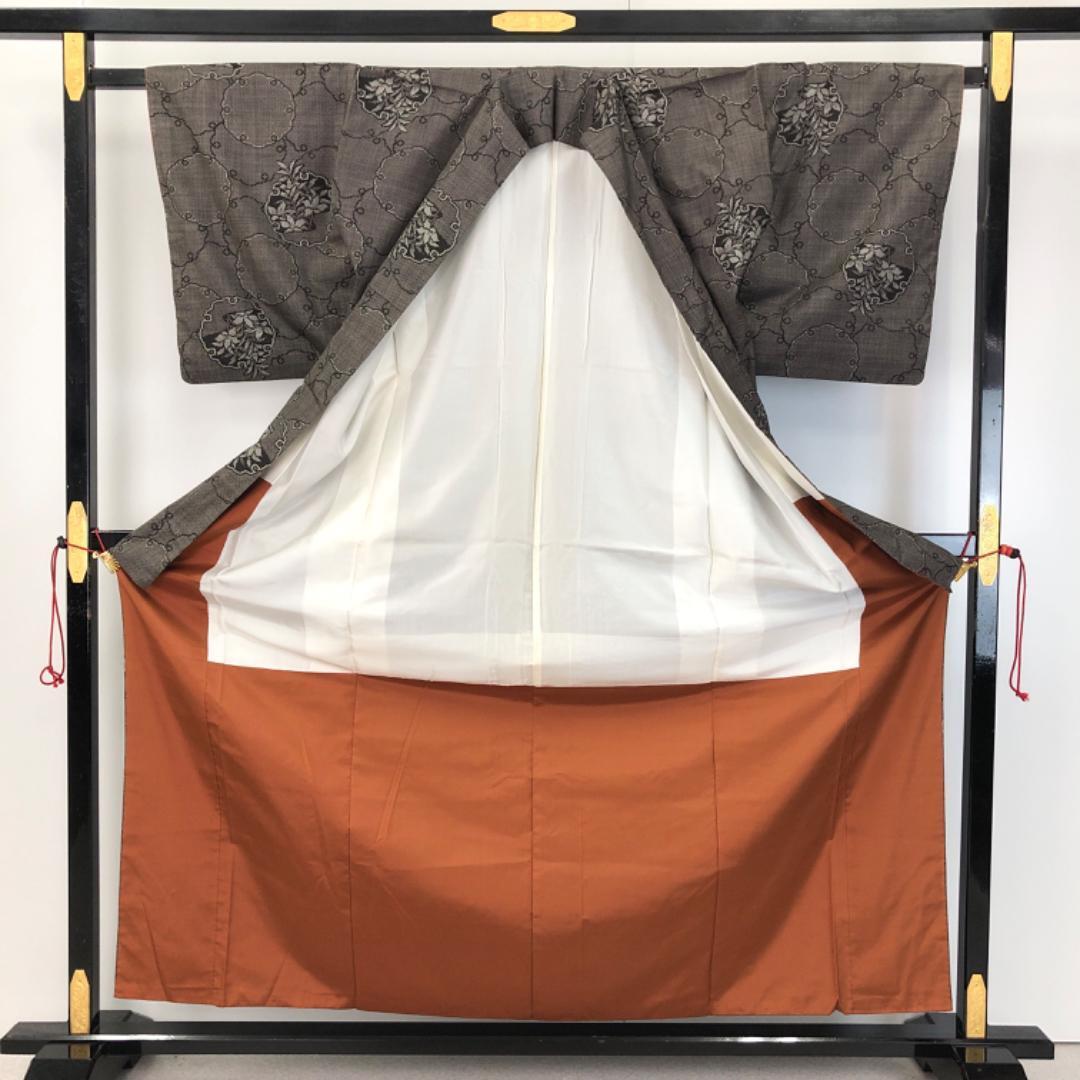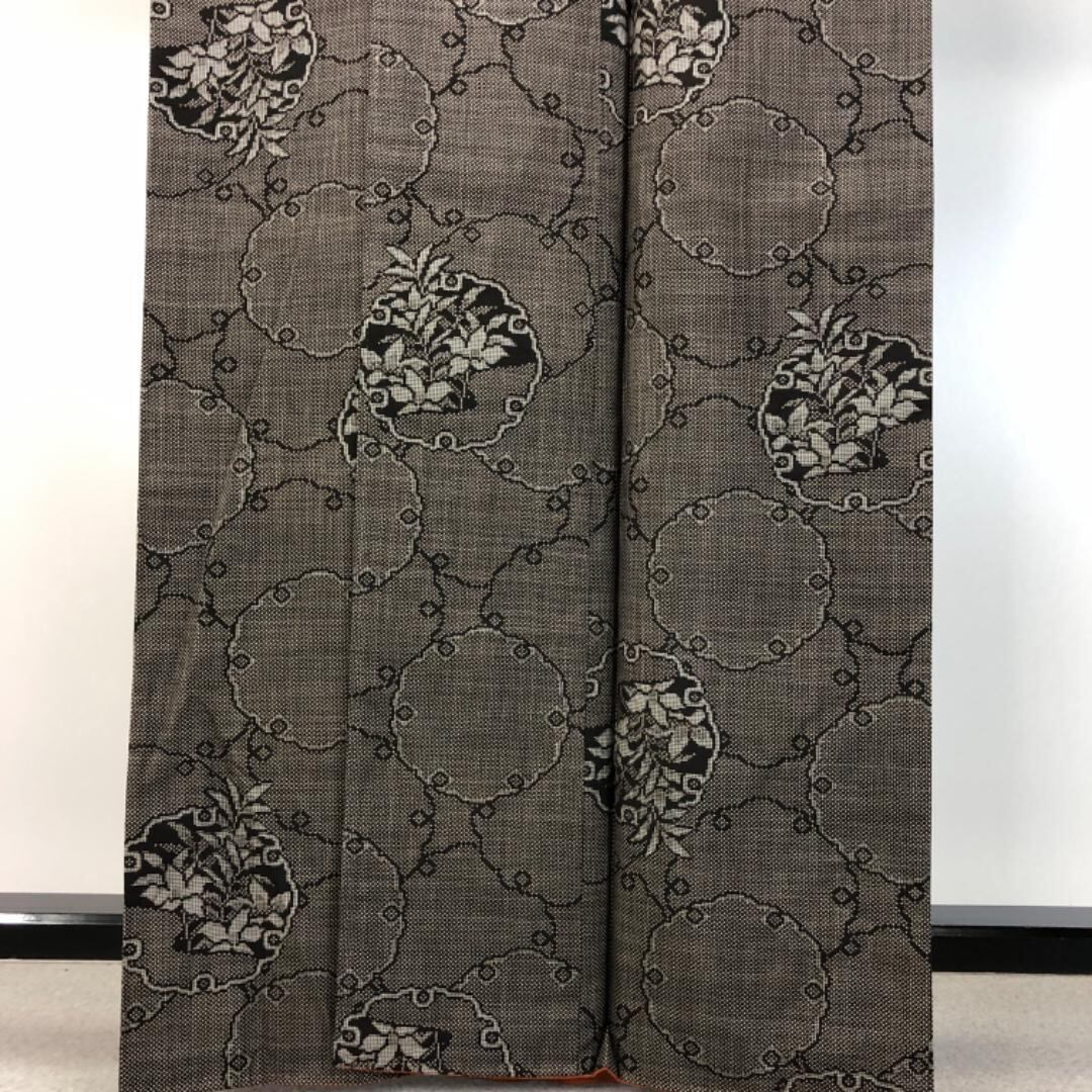茶泥染の雰囲気の良いお色味に雪輪に花模様の柄裄がデザインされた素敵なお品でございます。