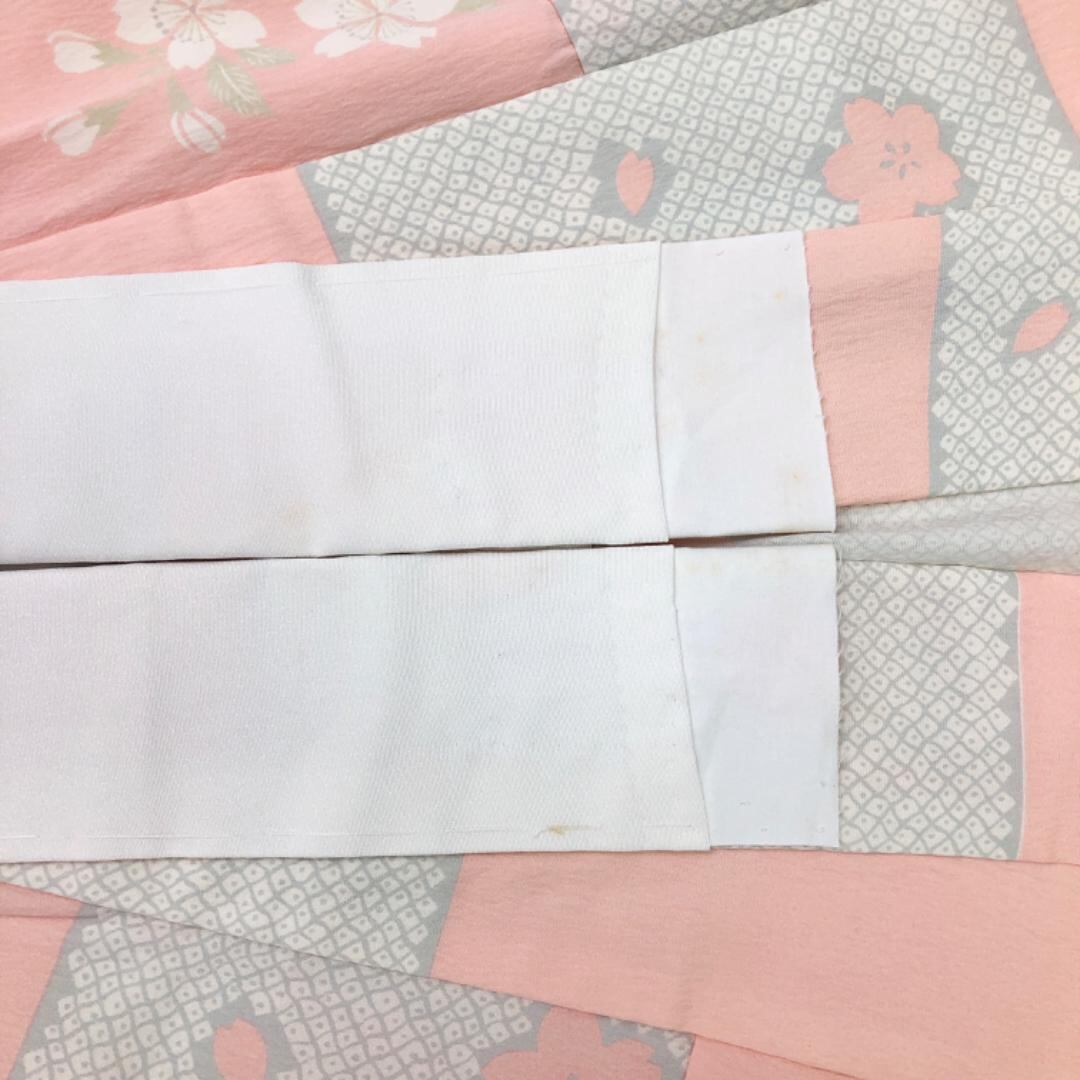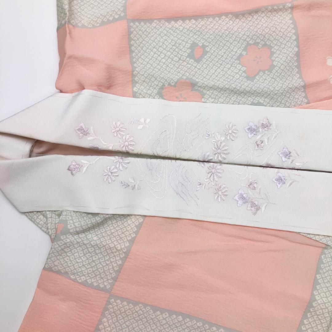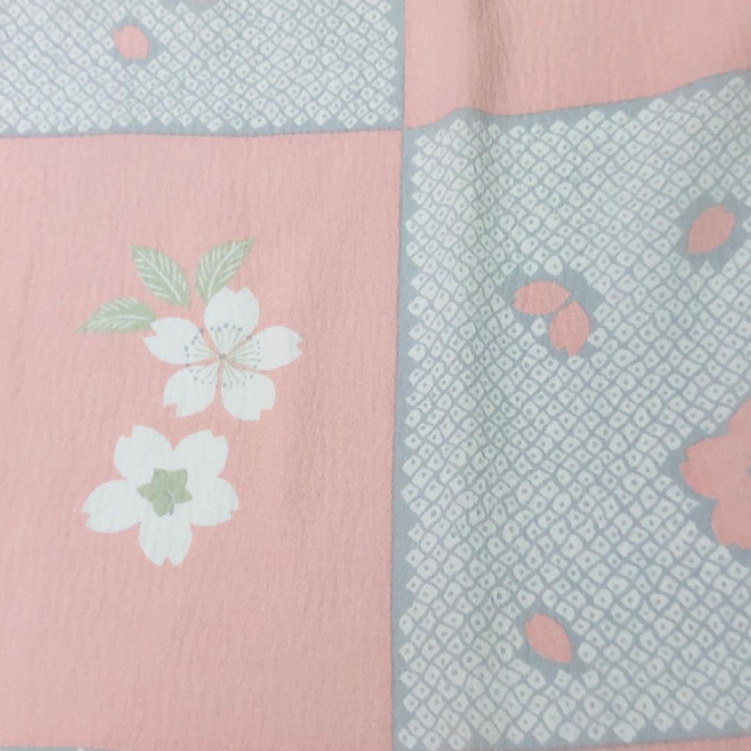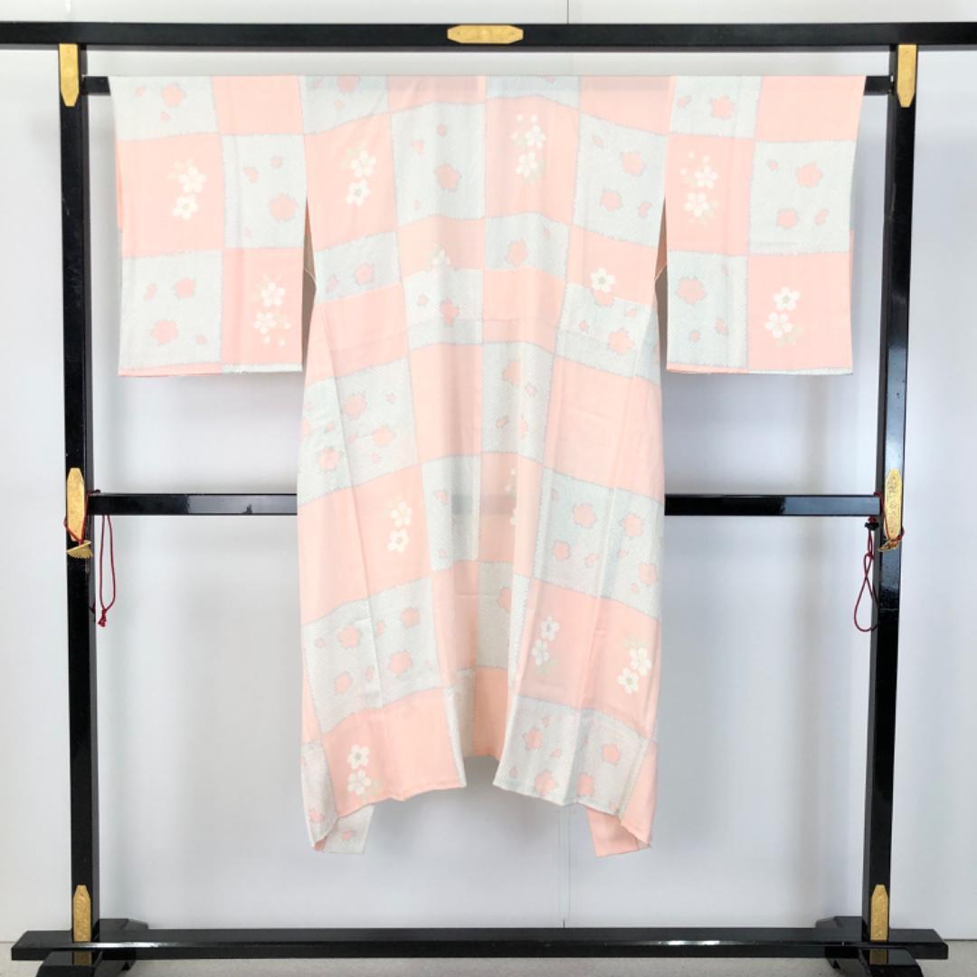 一重梅色のお色味に格子に桜の花模様の柄裄がデザインされた素敵なお品でございます。
