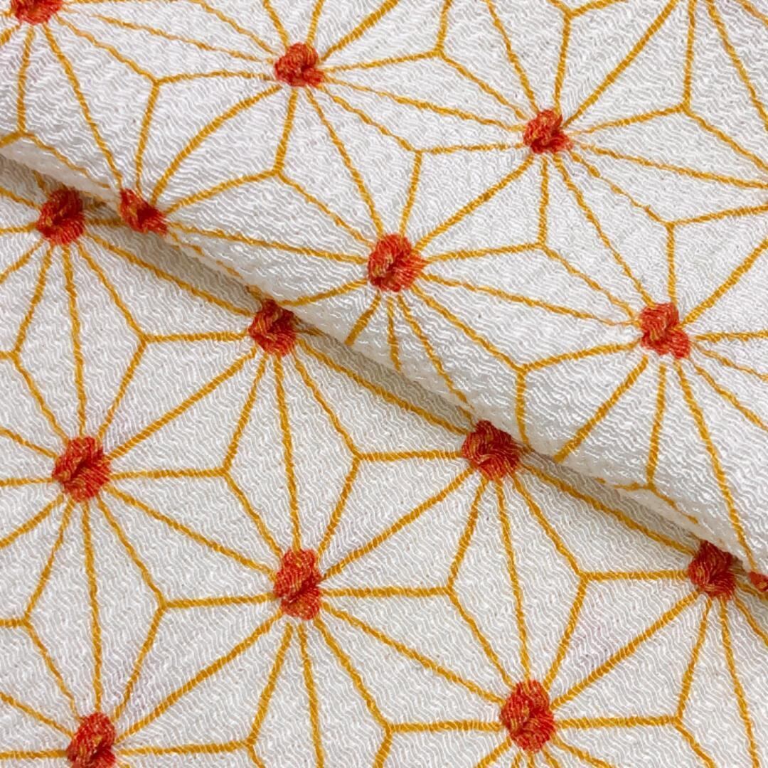 練色のお色味に絞りに麻の葉模様の柄裄がデザインされた素敵なお品でございます。