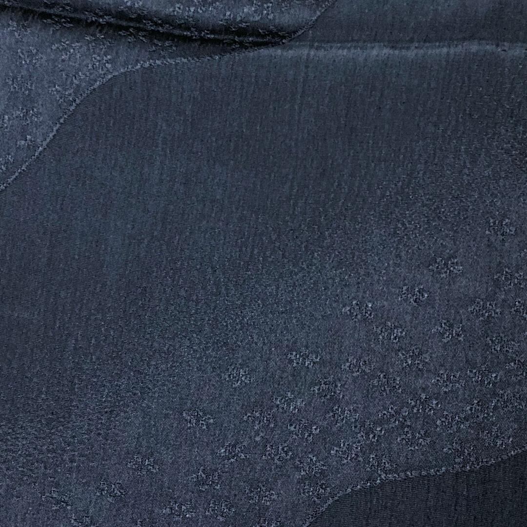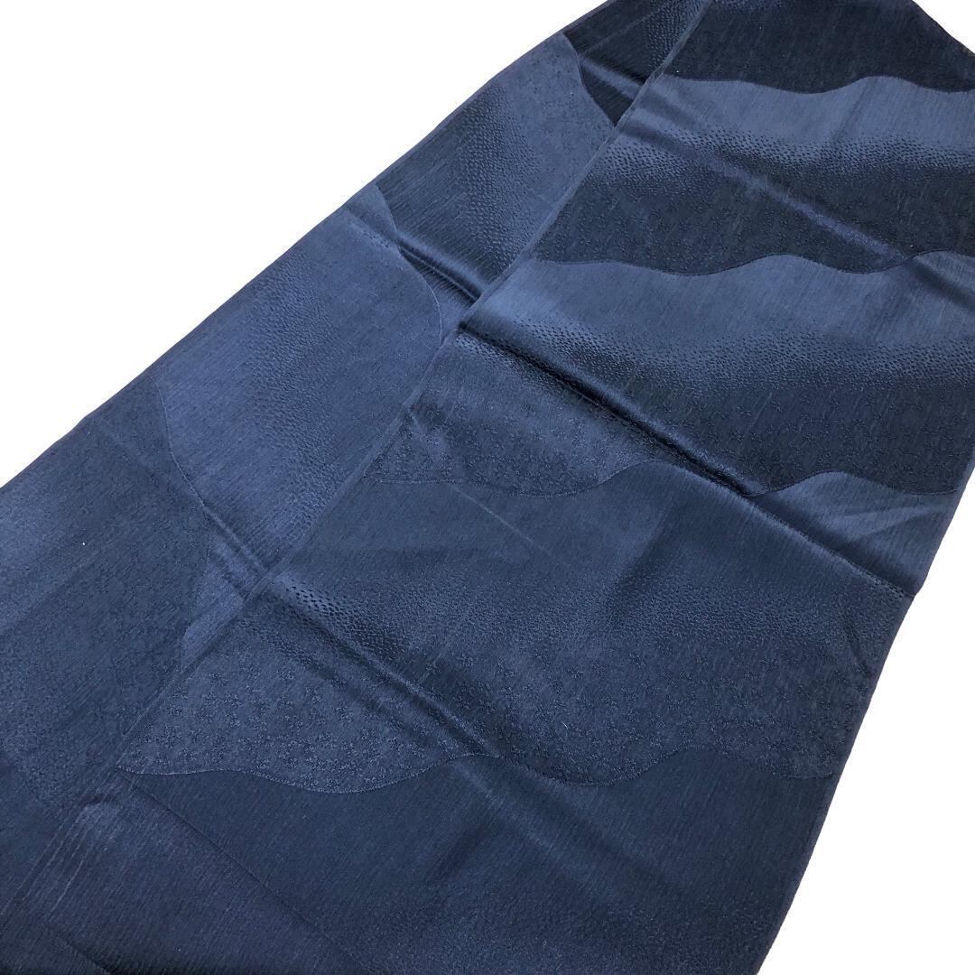 印度藍色のお色味に曲線斜め模様の柄裄がデザインされた素敵なお品でございます。