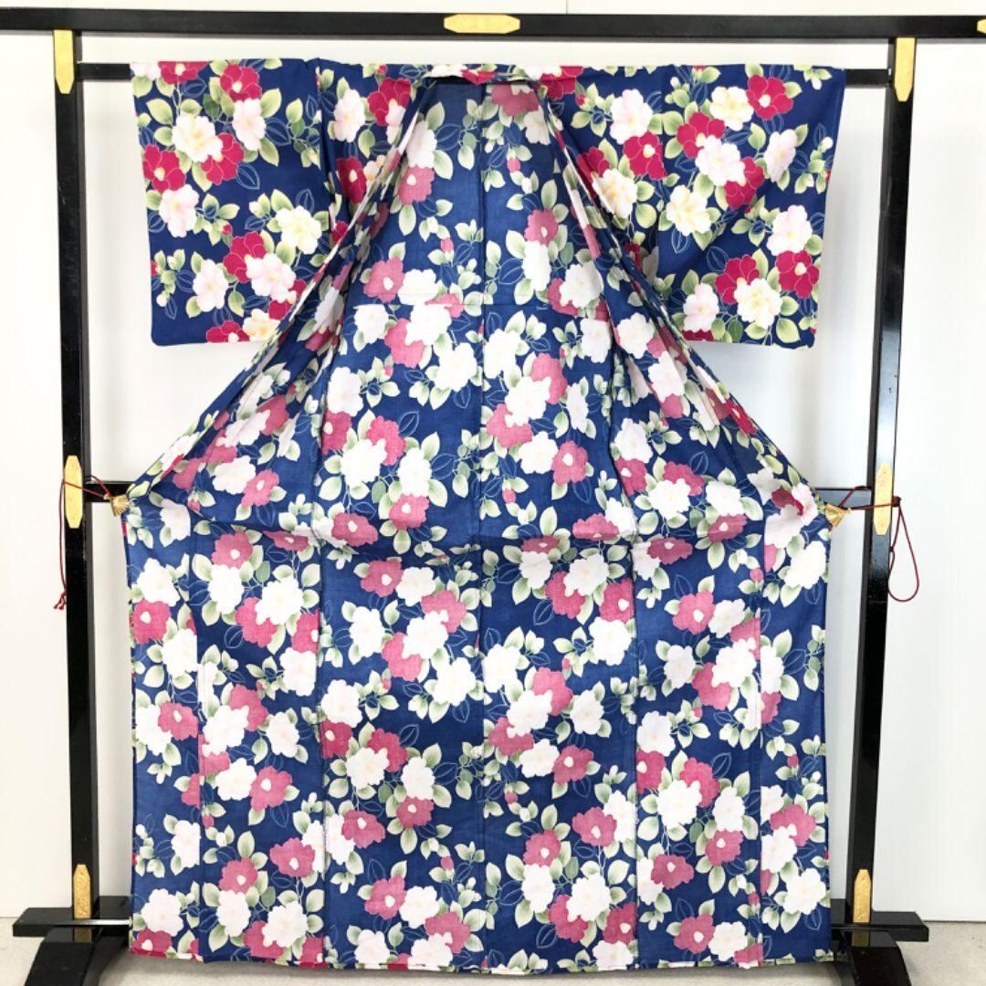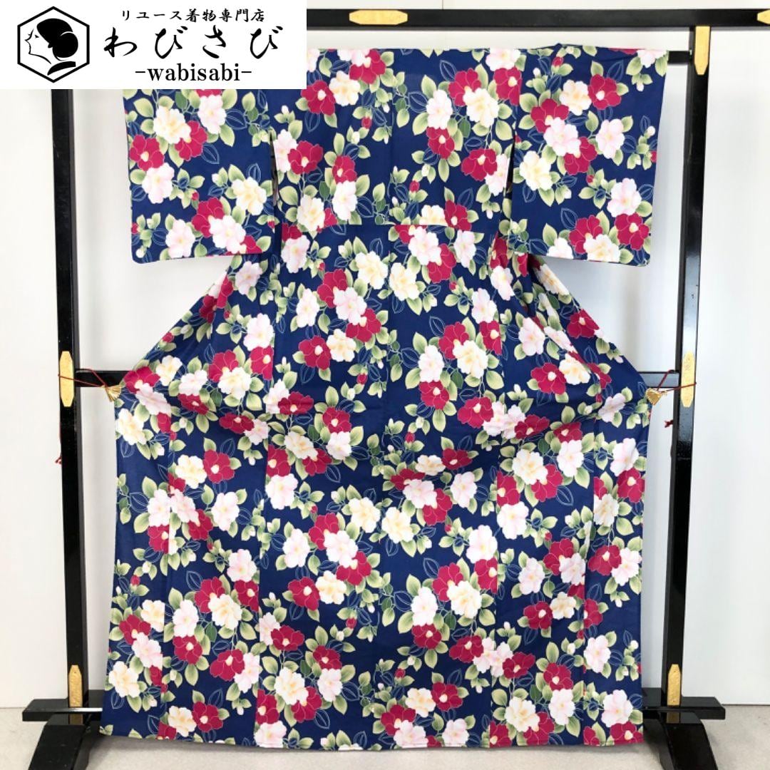 夏着物 浴衣 椿の花模様 瑠璃色 K-5039 着物 きもの kimono 和服 和装 中古 リサイクル着物 【送料無料】