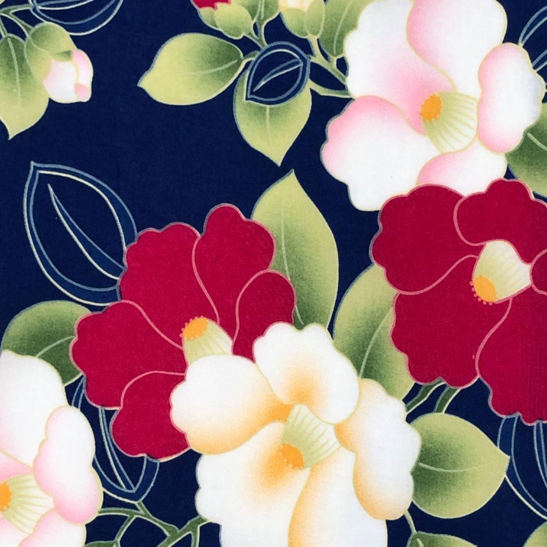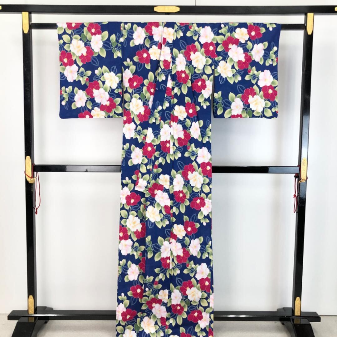 瑠璃色のお色味に椿の花模様の柄裄がデザインされた素敵なお品でございます。