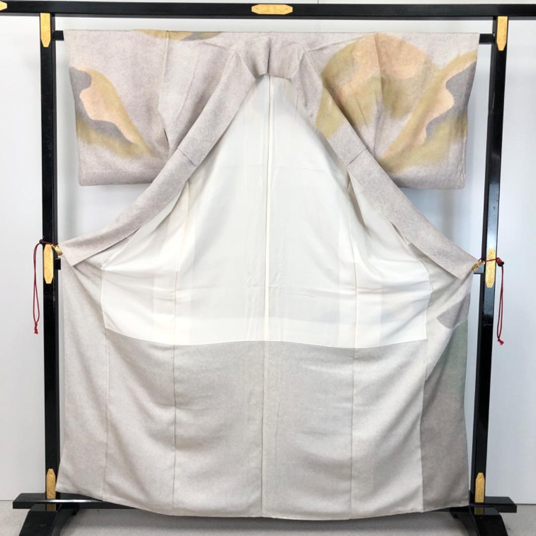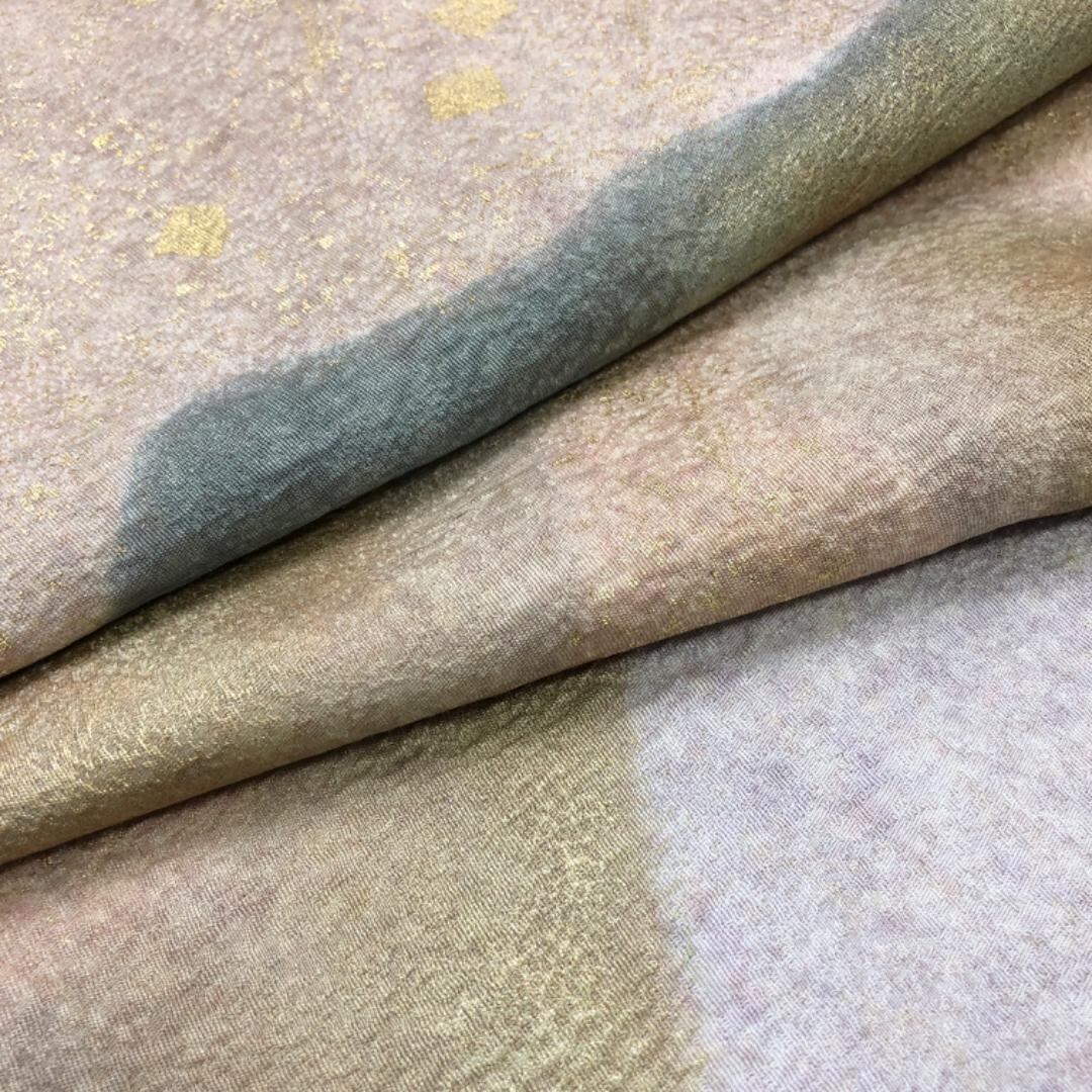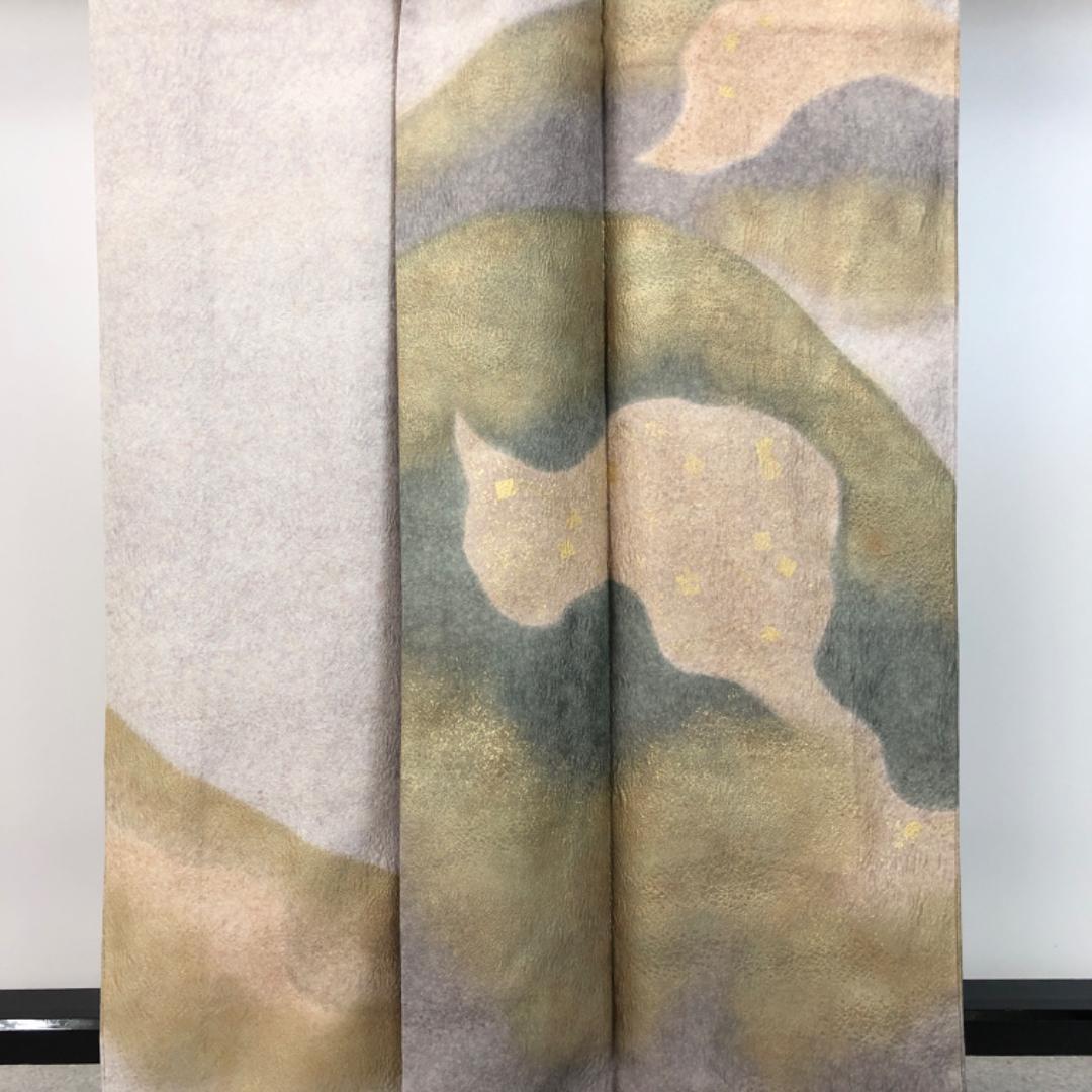 白練色のお色味に暈し、金彩が使われた遠山模様の柄裄がデザイン品のあるされた素敵なお品でございます。
