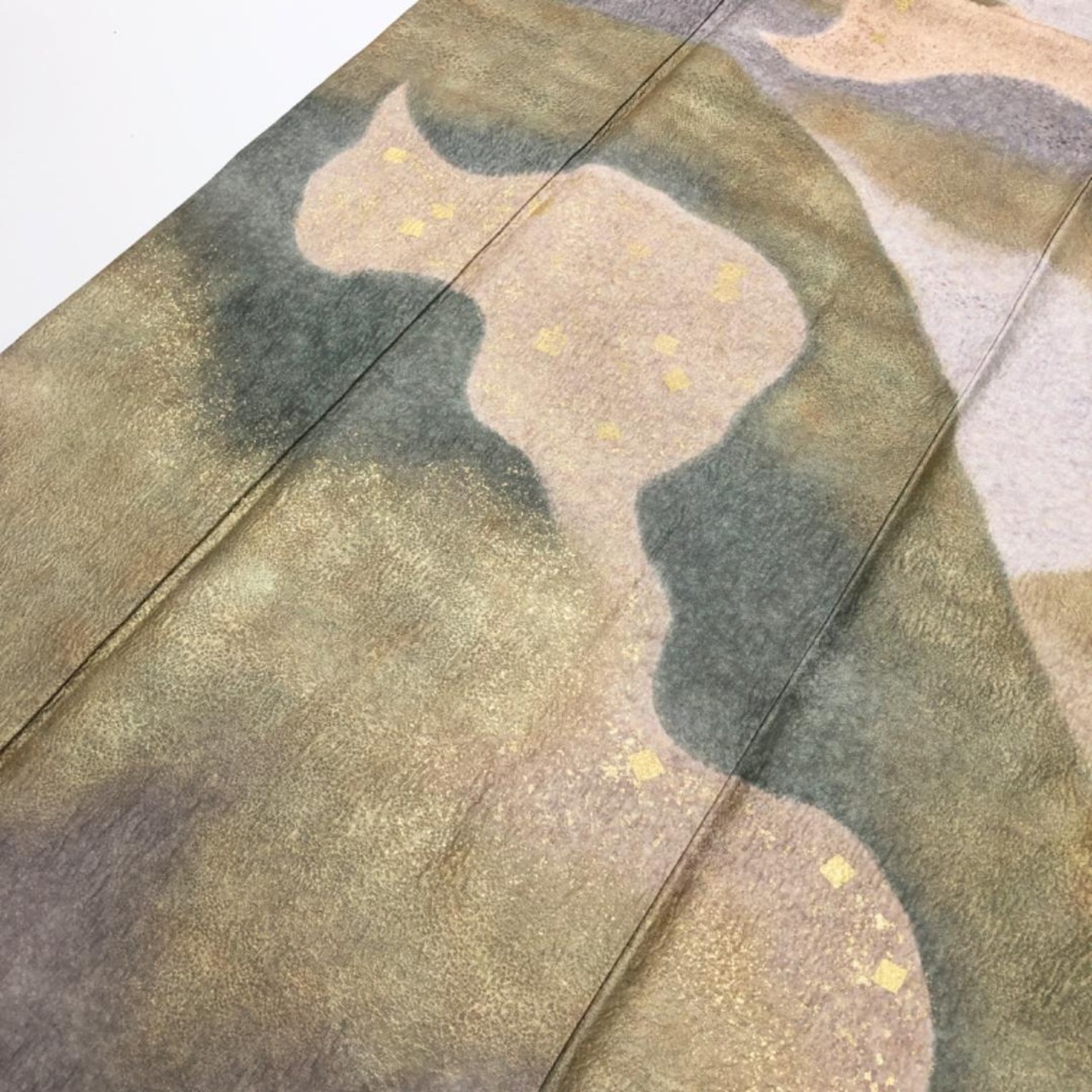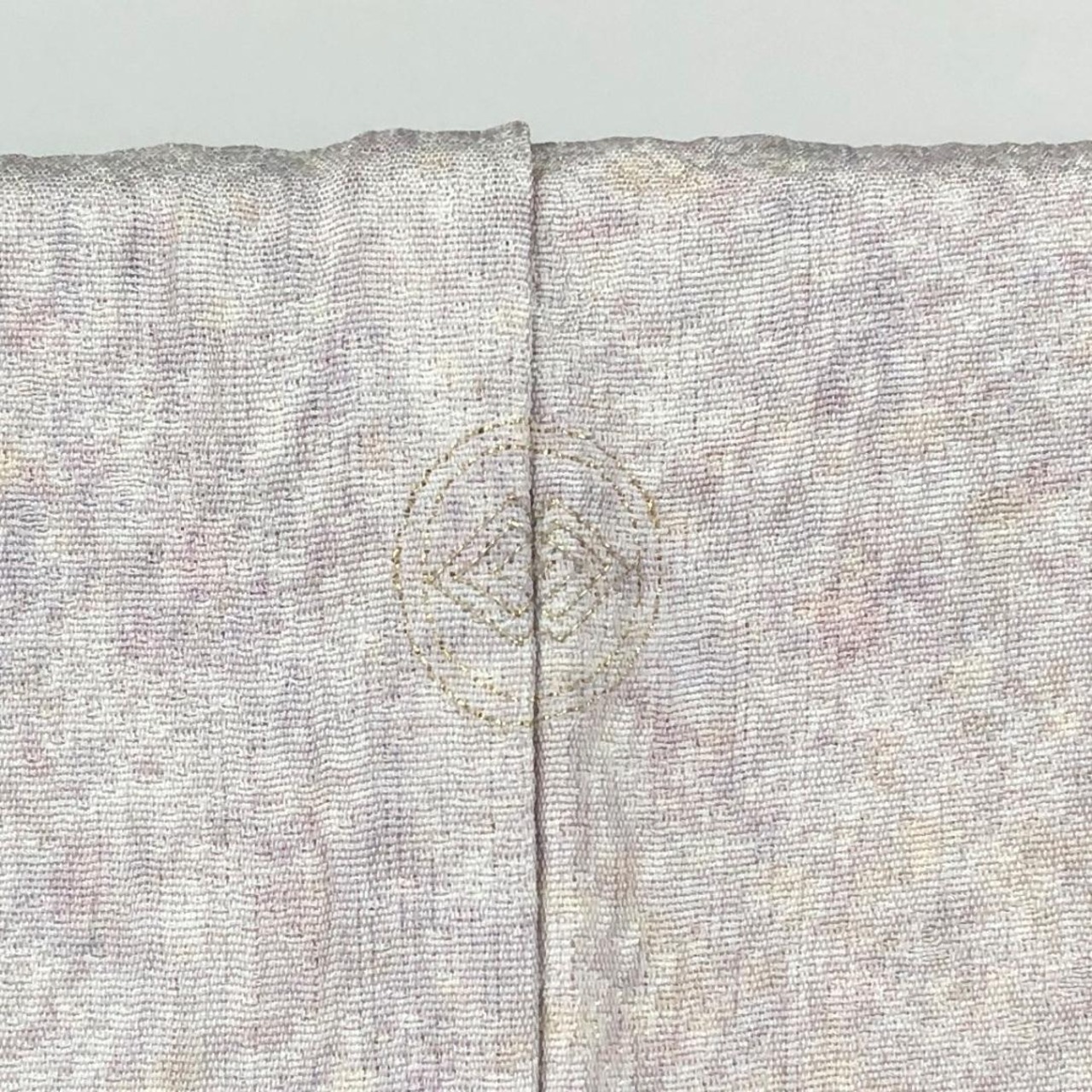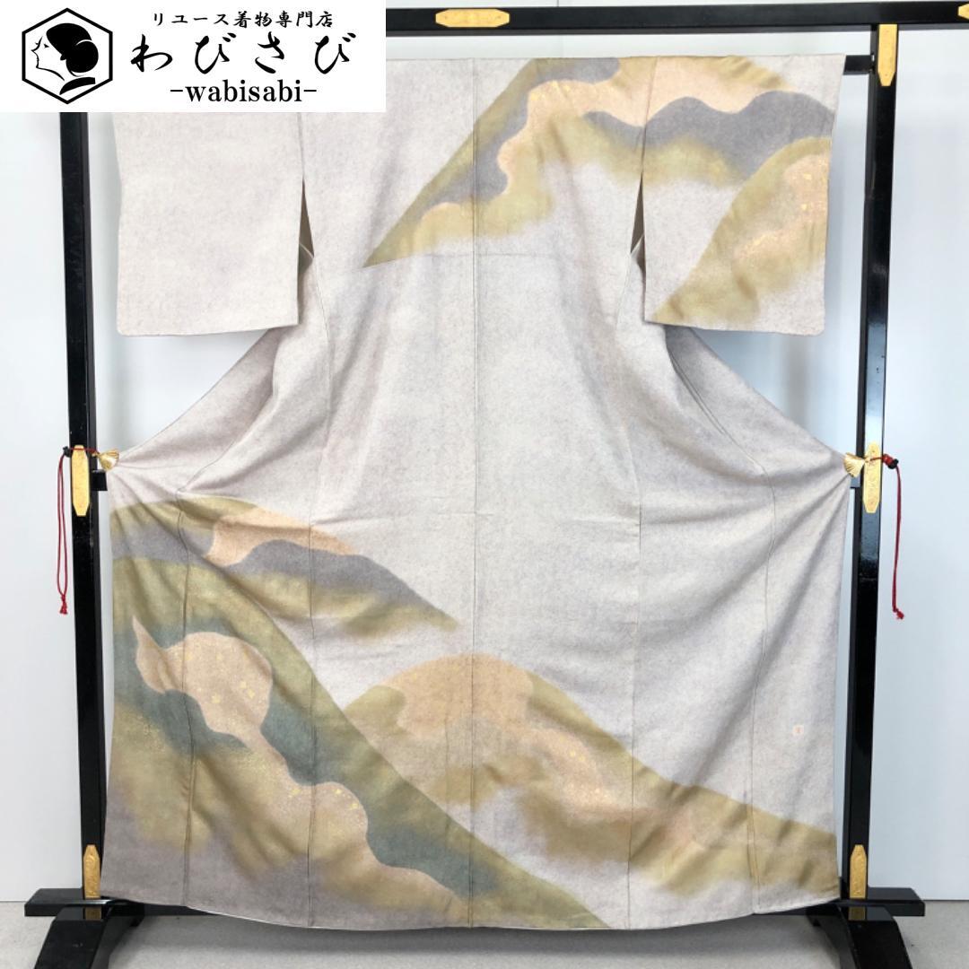 白練色のお色味に暈し、金彩が使われた遠山模様の柄裄がデザイン品のあるされた素敵なお品でございます。