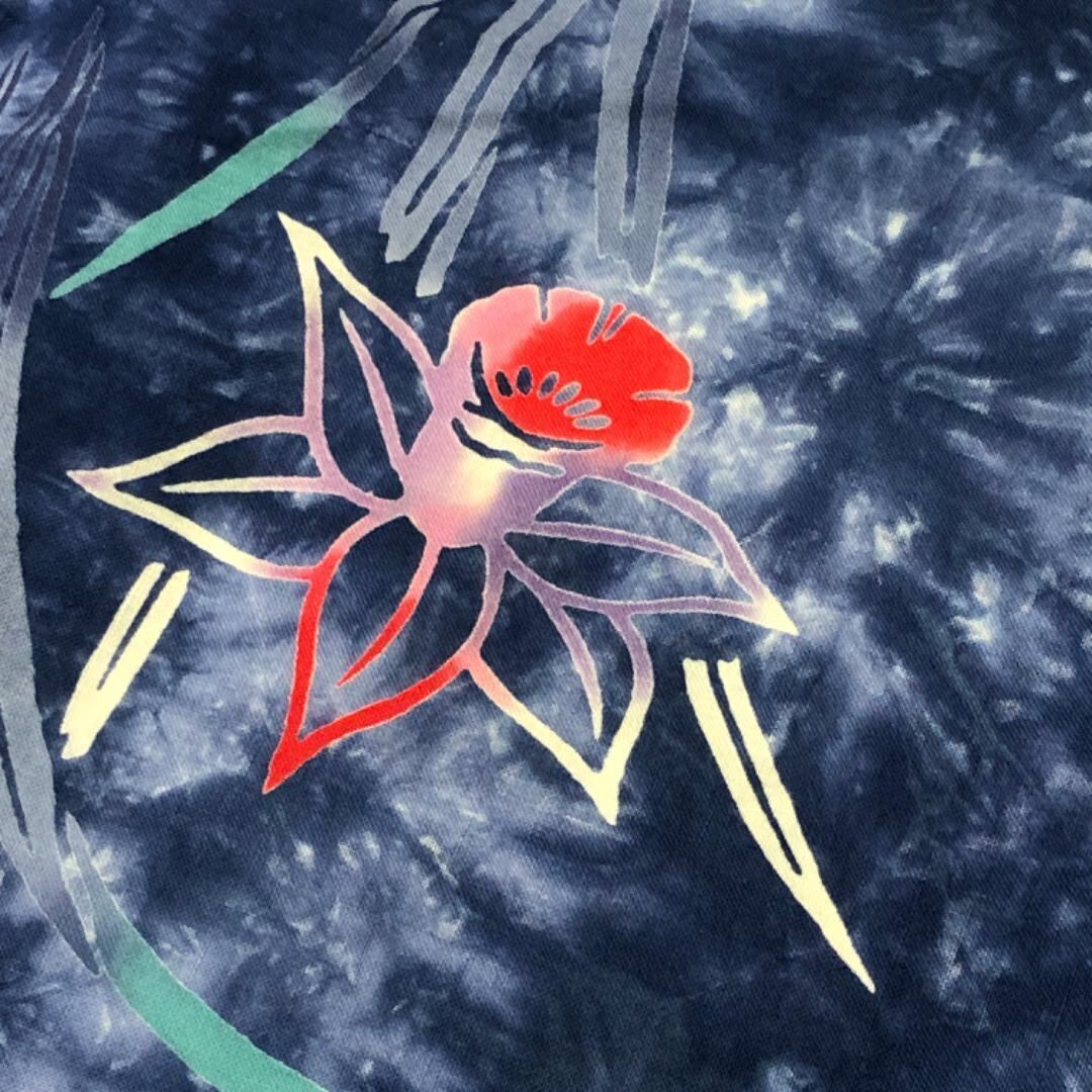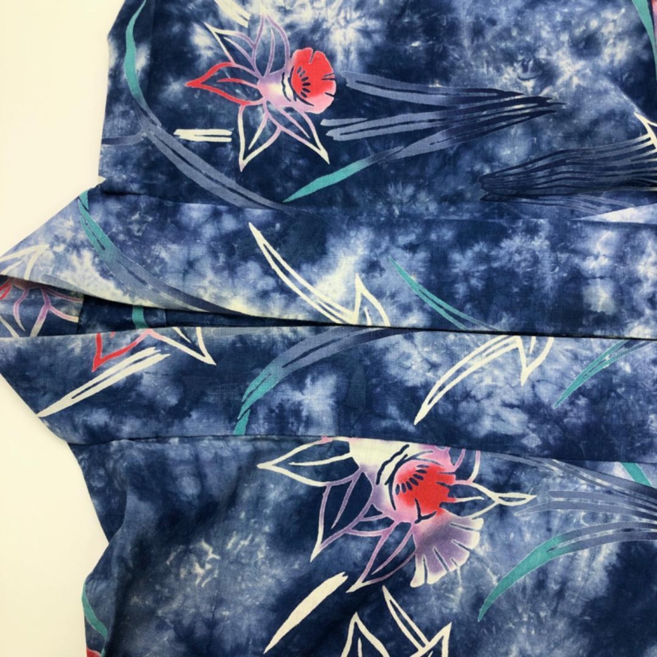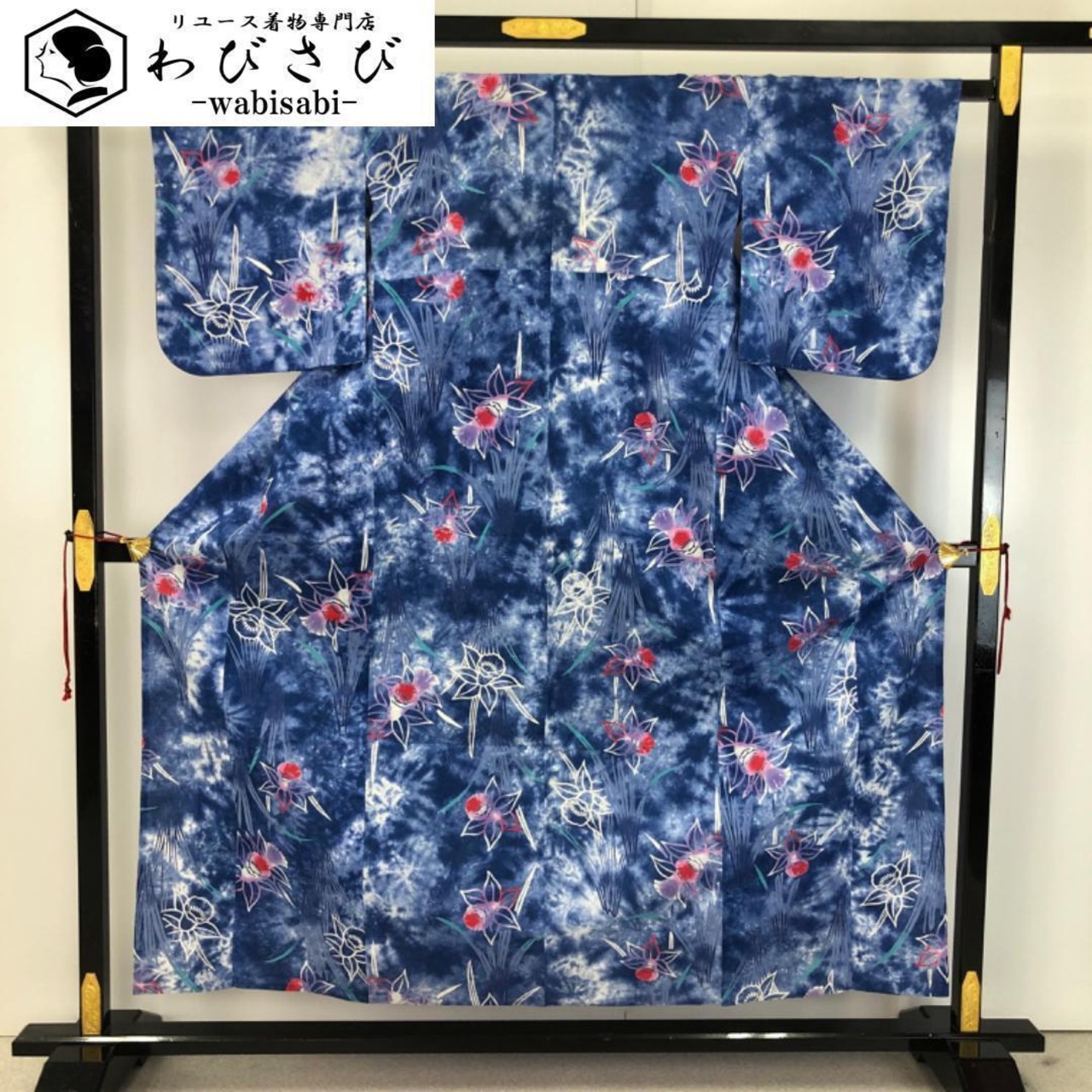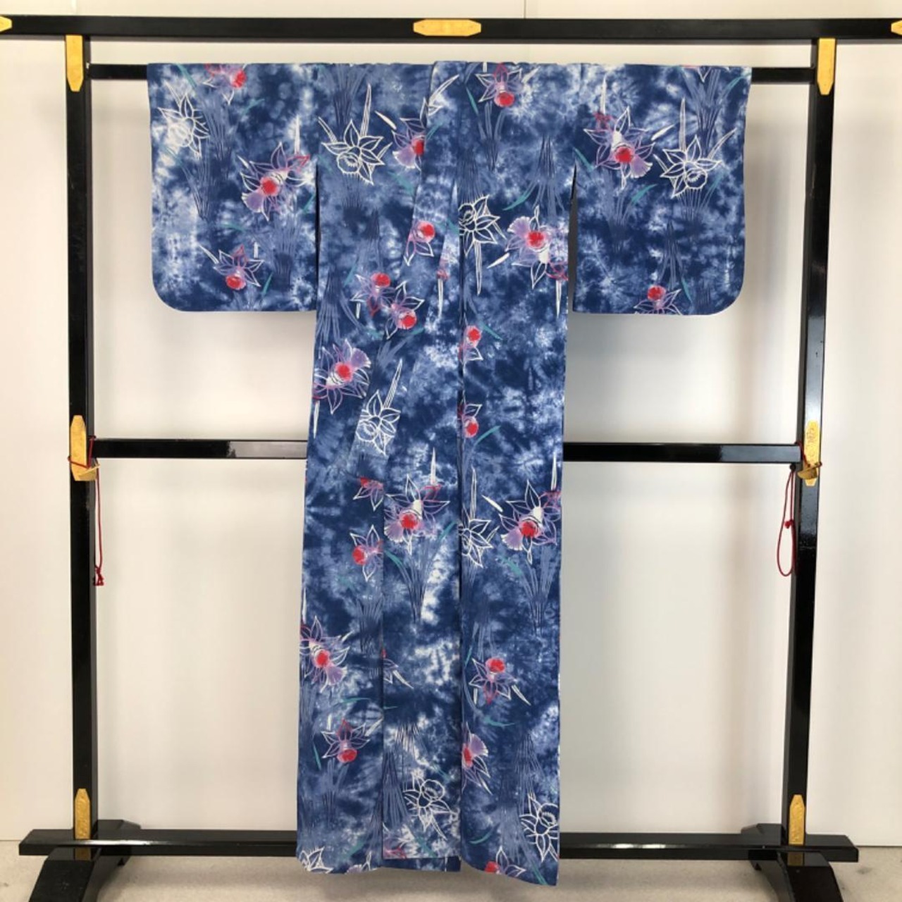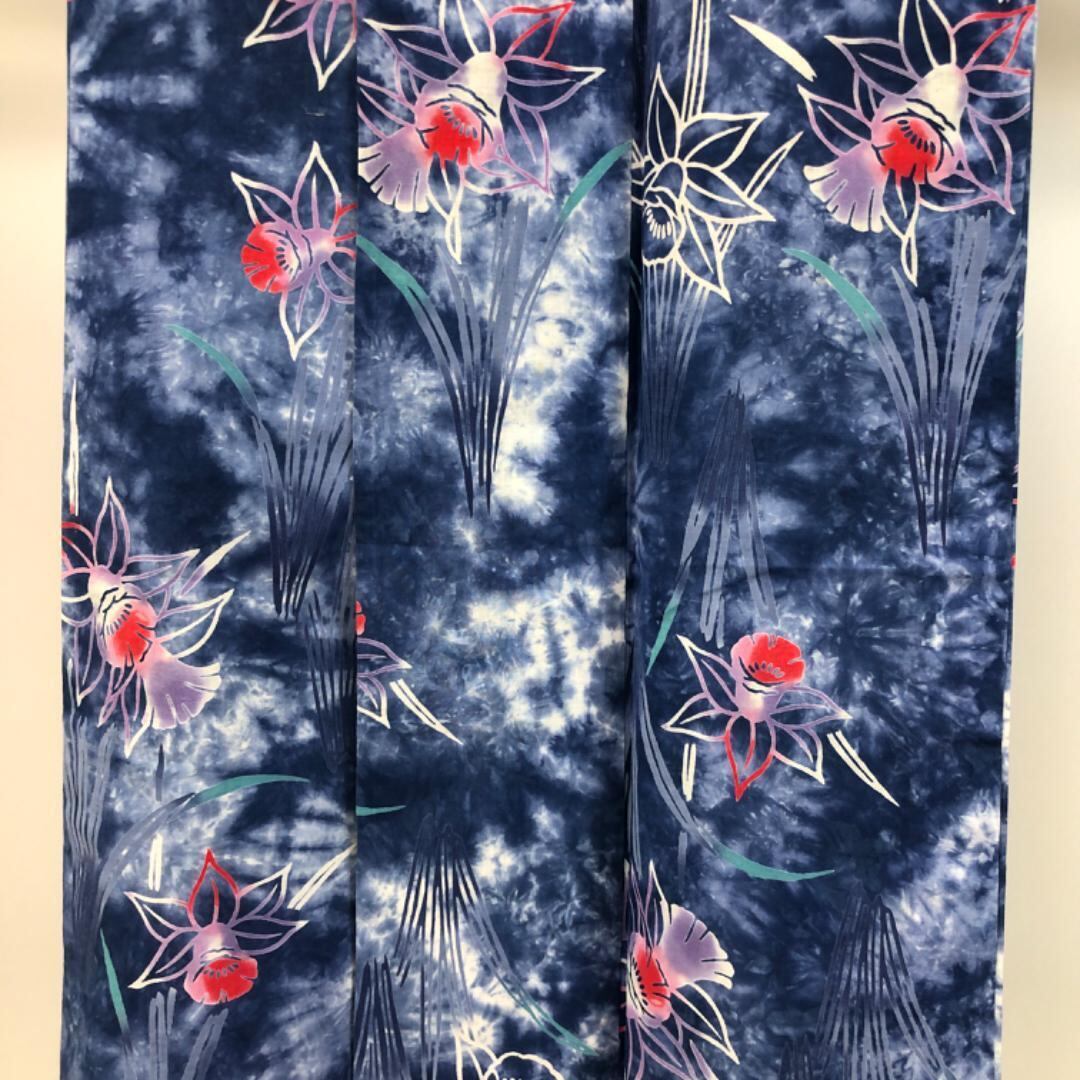 紺碧色のお色味に水仙の花模様の柄裄がデザインされた素敵なお品でございます。