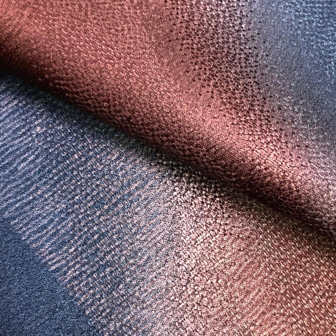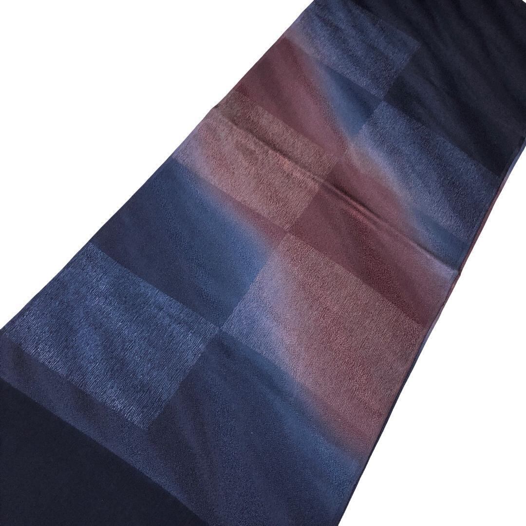 紺鳶色ベースのお色味に四角に斜線模様の柄裄がデザインされた素敵なお品でございます。