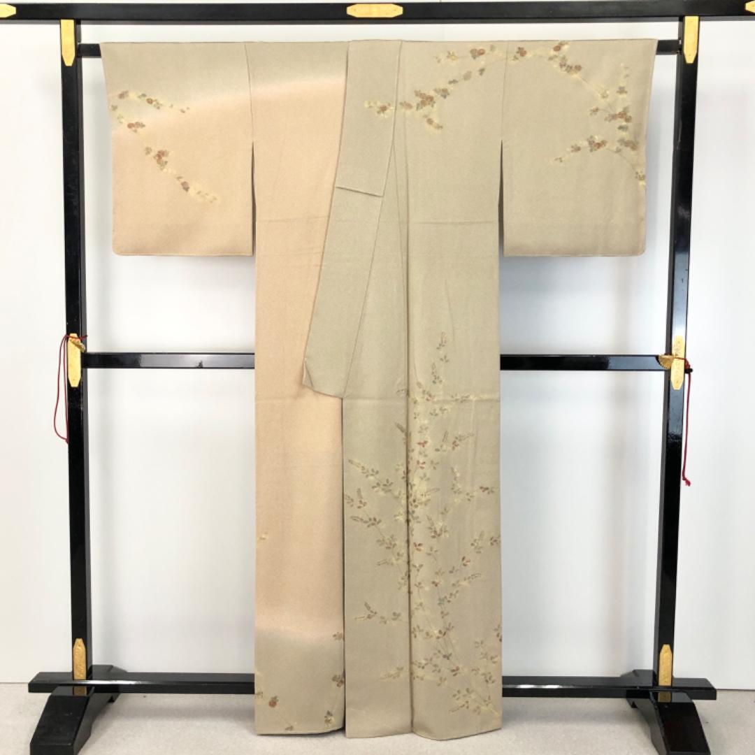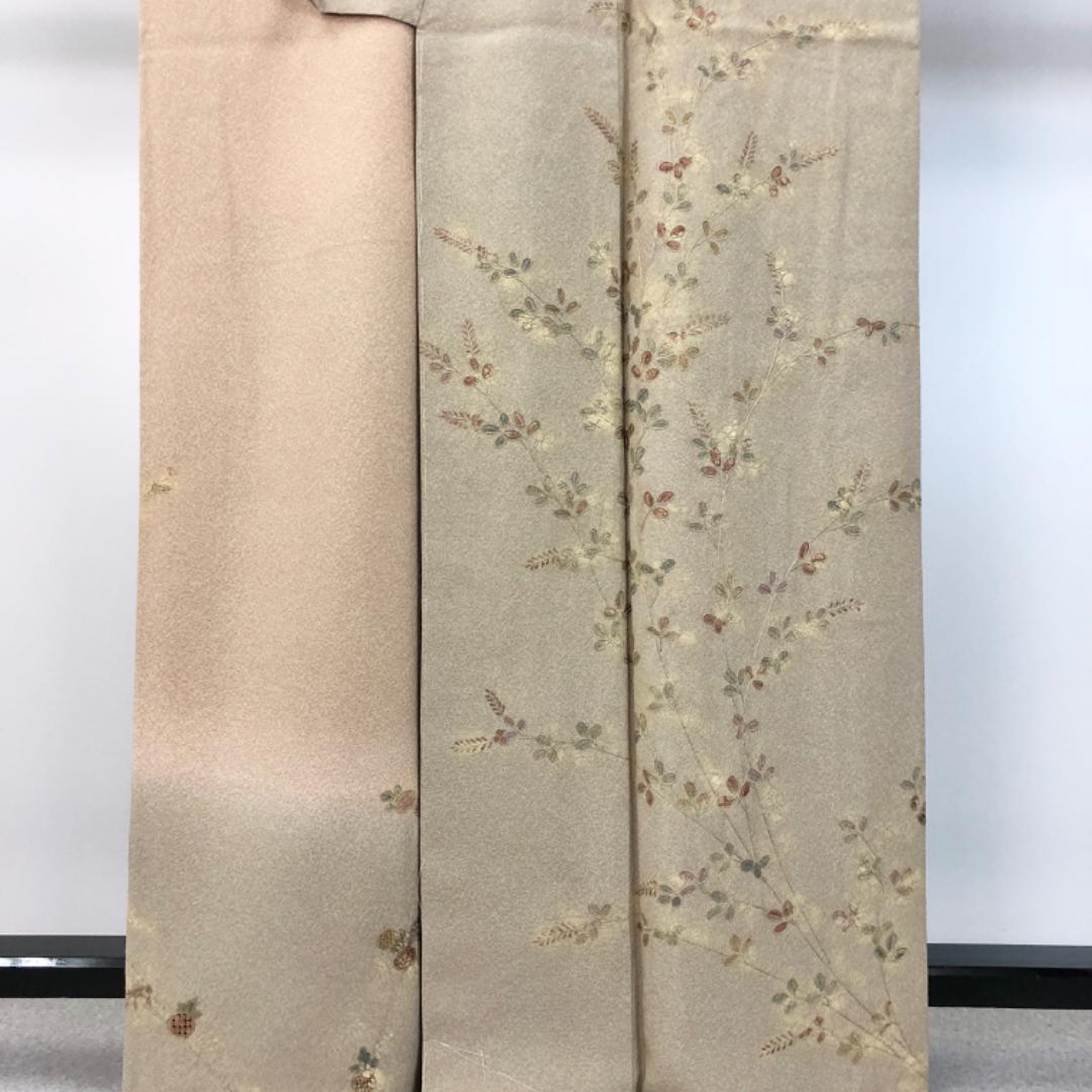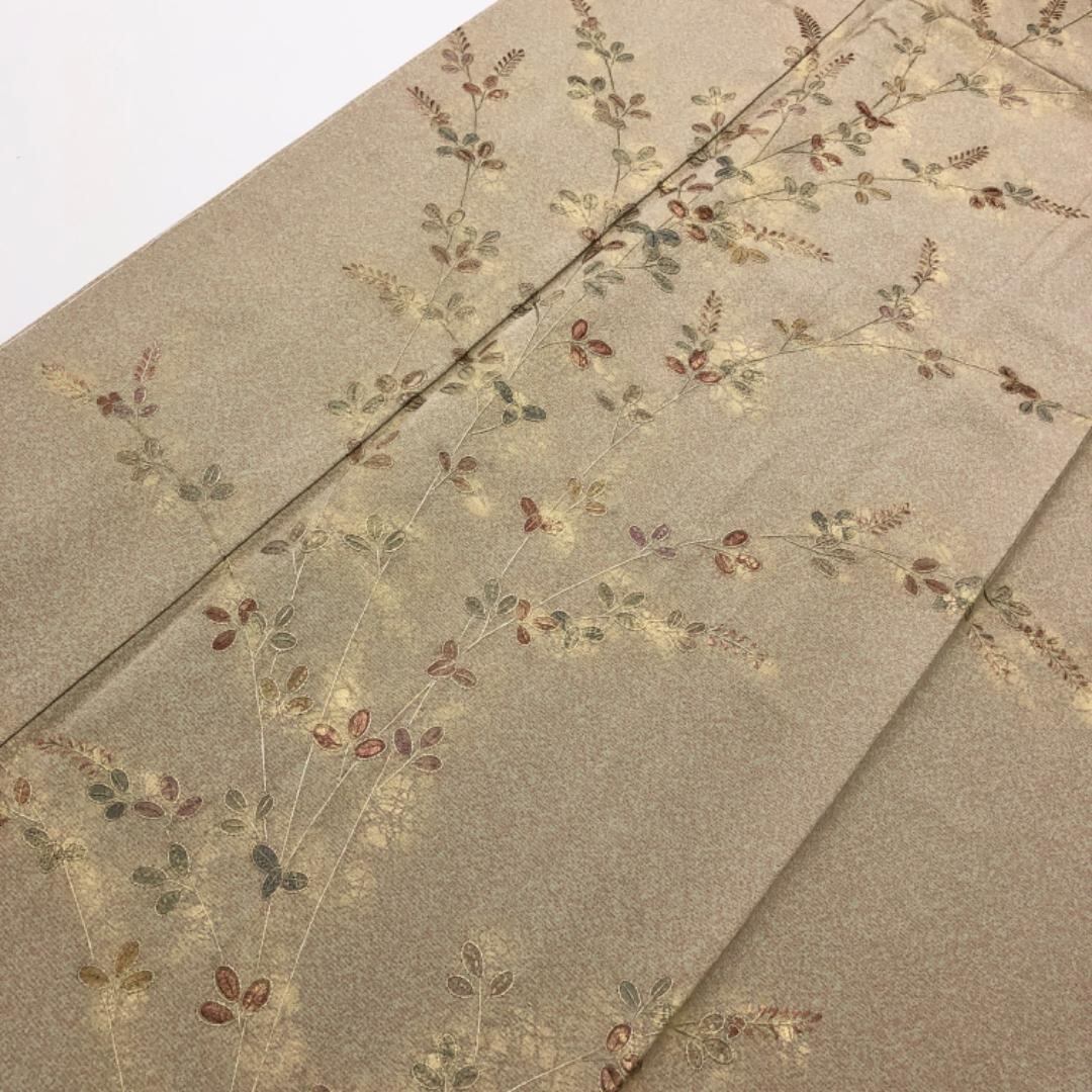 藁色ベースの染分けの上品なお色味に刺繍が使われた萩模様がデザインされた素敵なお品でございます。