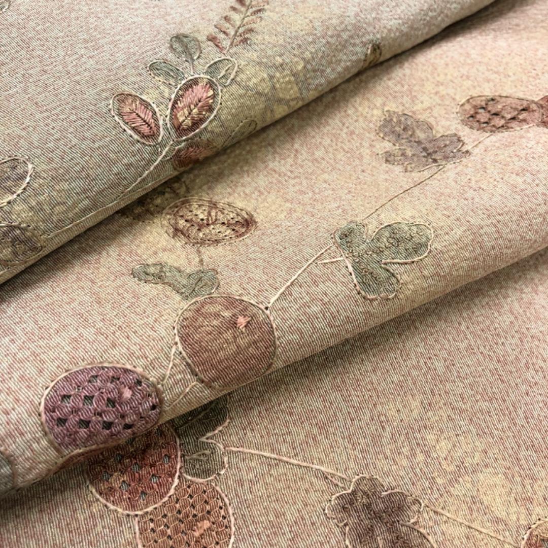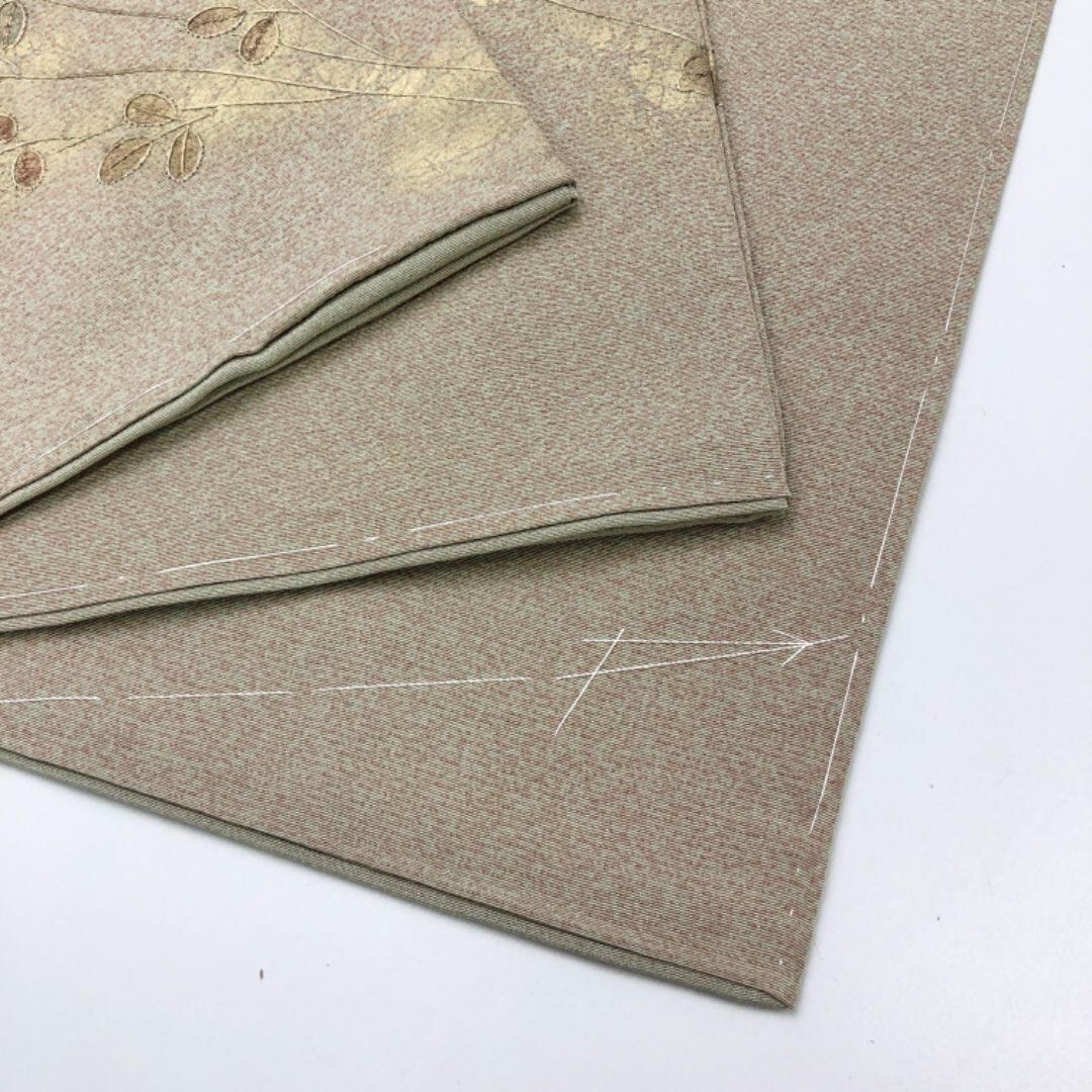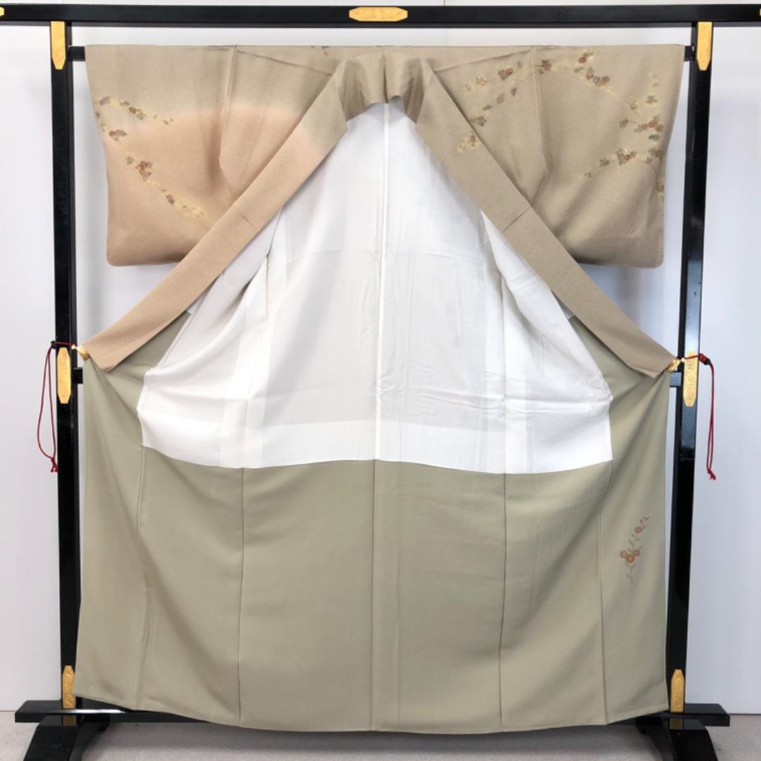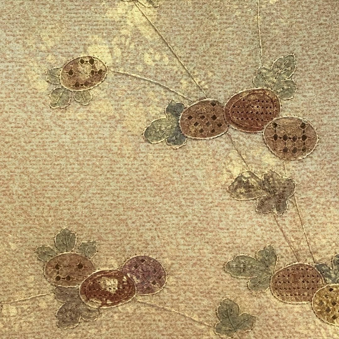 藁色ベースの染分けの上品なお色味に刺繍が使われた萩模様がデザインされた素敵なお品でございます。