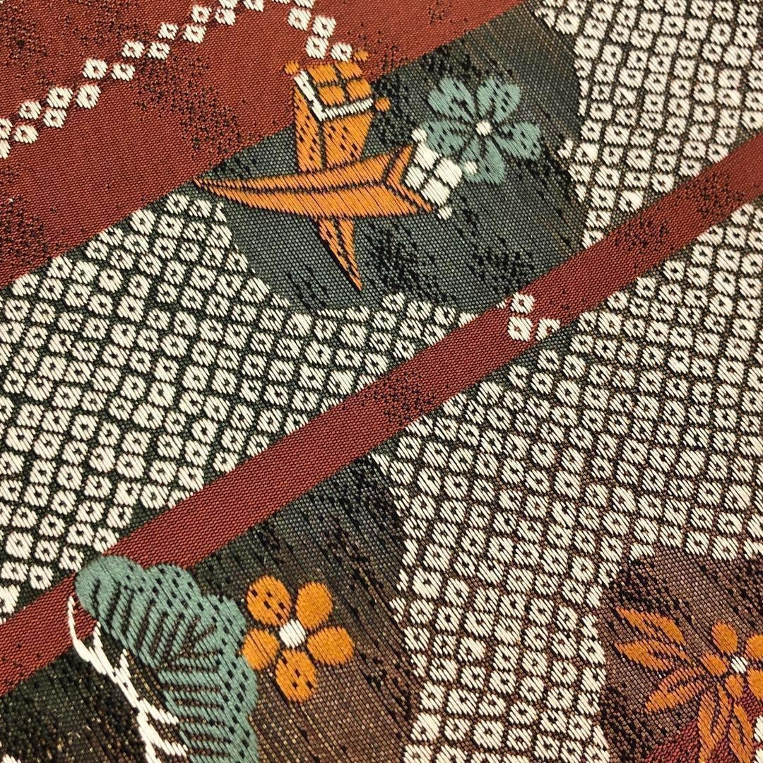 朱殷色ベースのお色味に縦柄にデザインされた鹿の子模様、散りばめられた宝尽くしの柄裄が素敵なお品でございます。