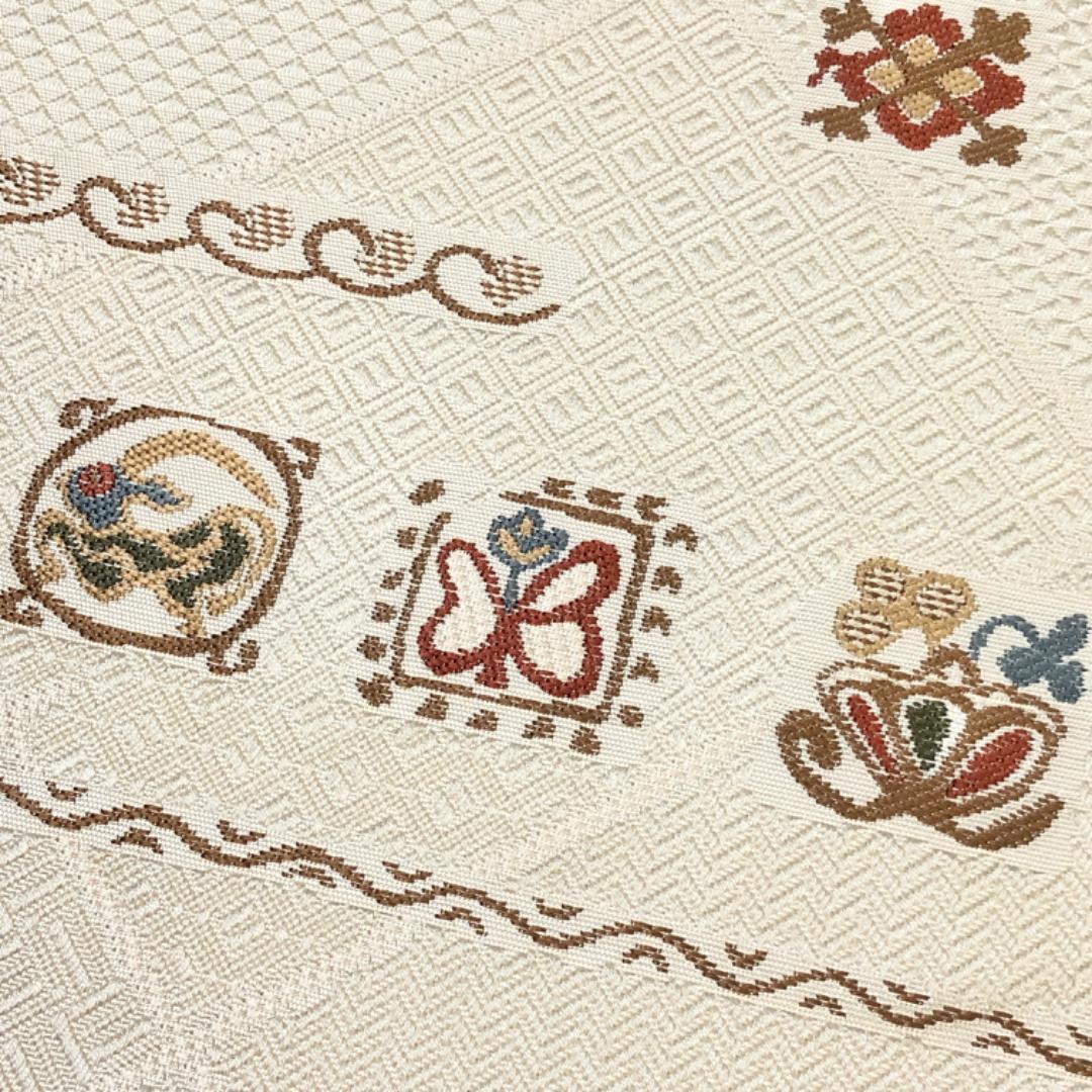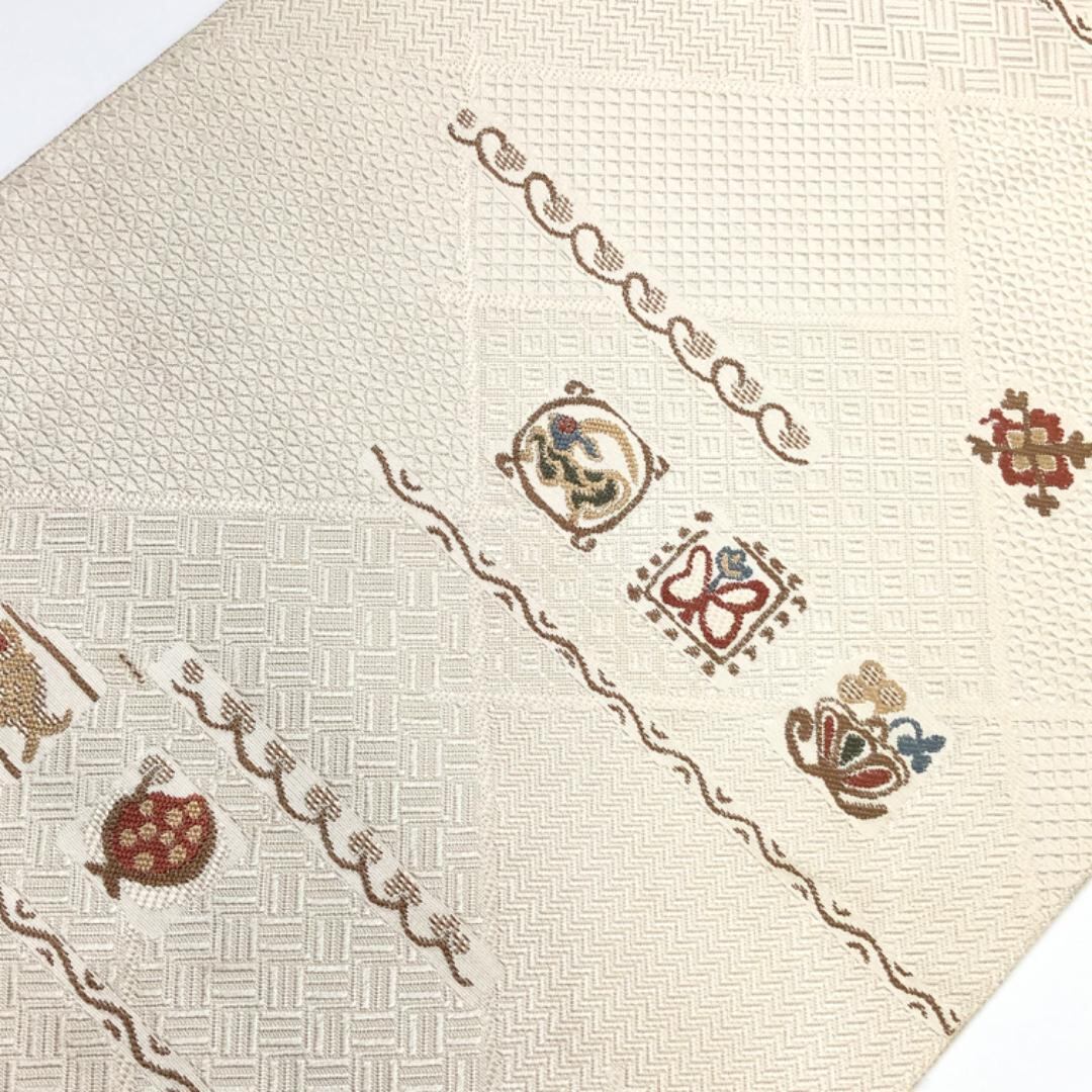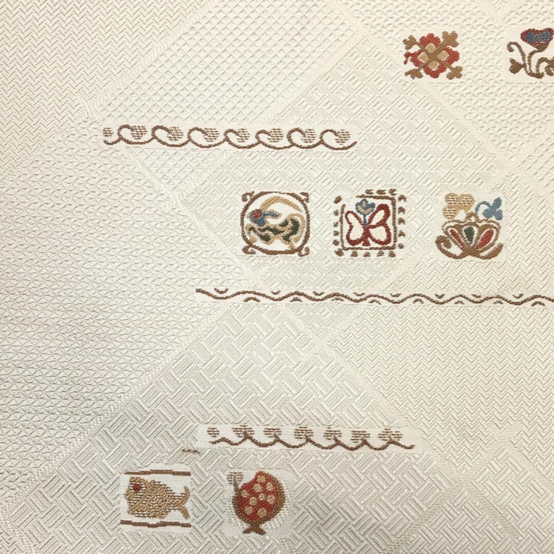 象牙色の上品なお色味に四角に抽象柄の魚、蝶々、動物、花模様などがデザインされた素敵な柄裄のお品でございます。