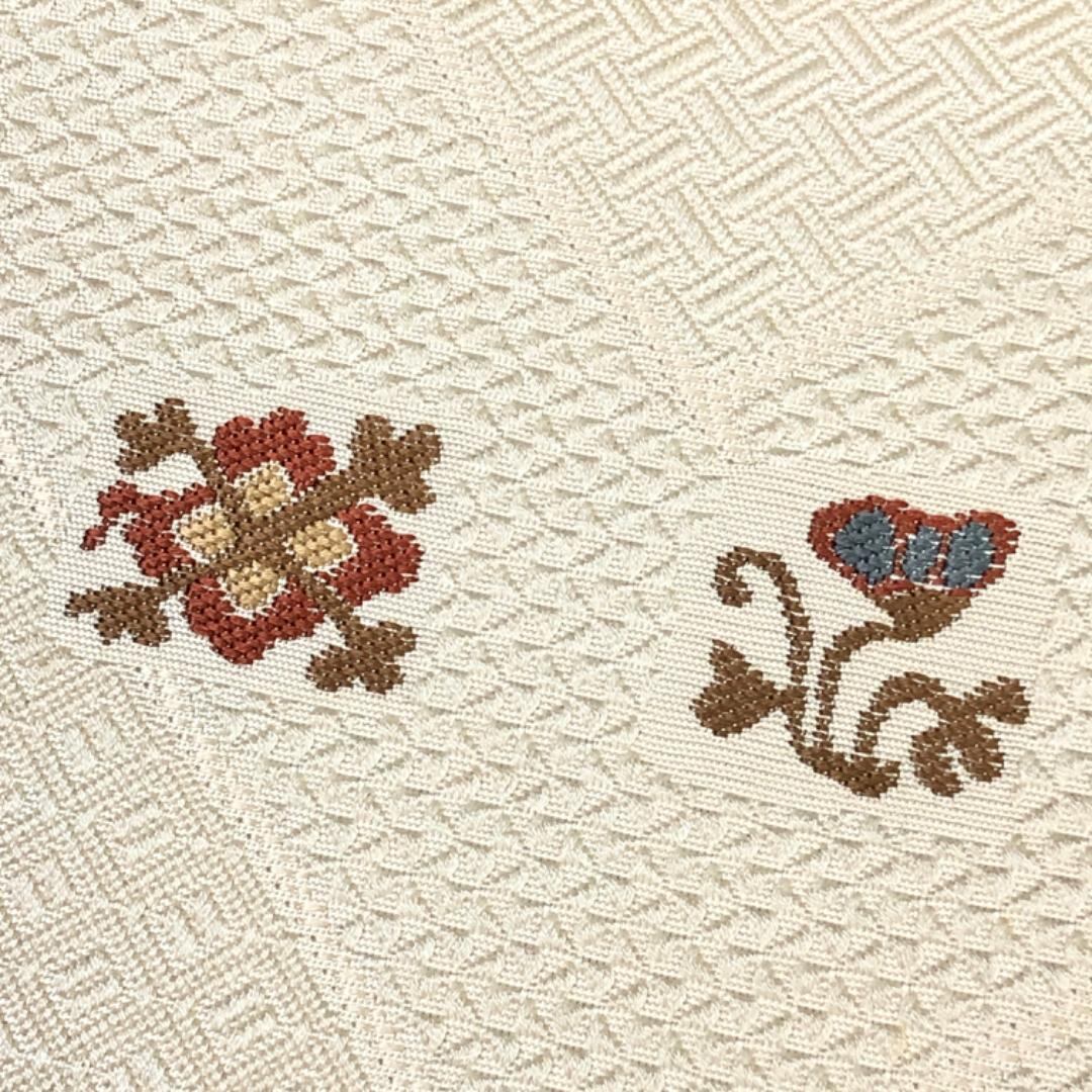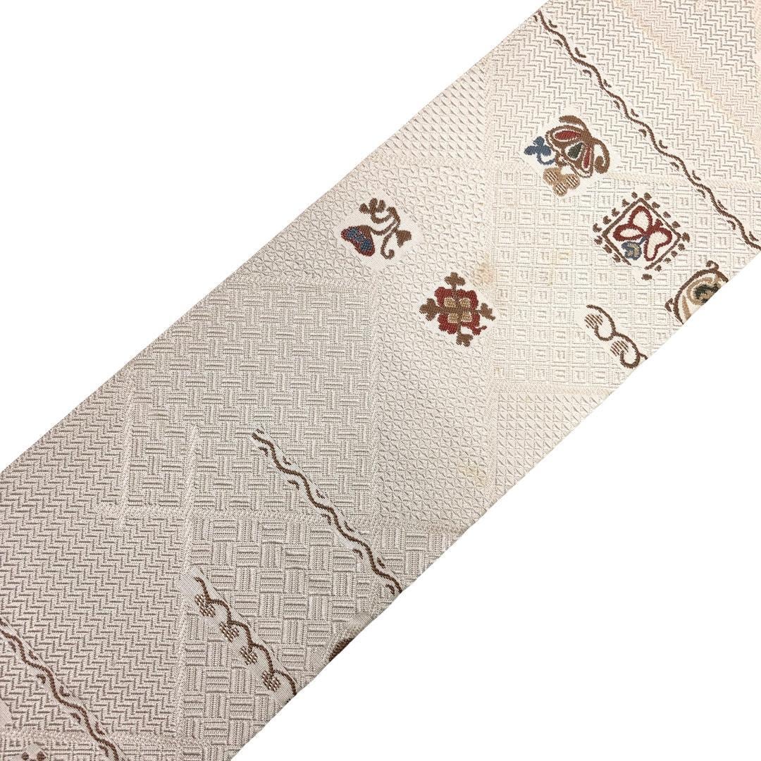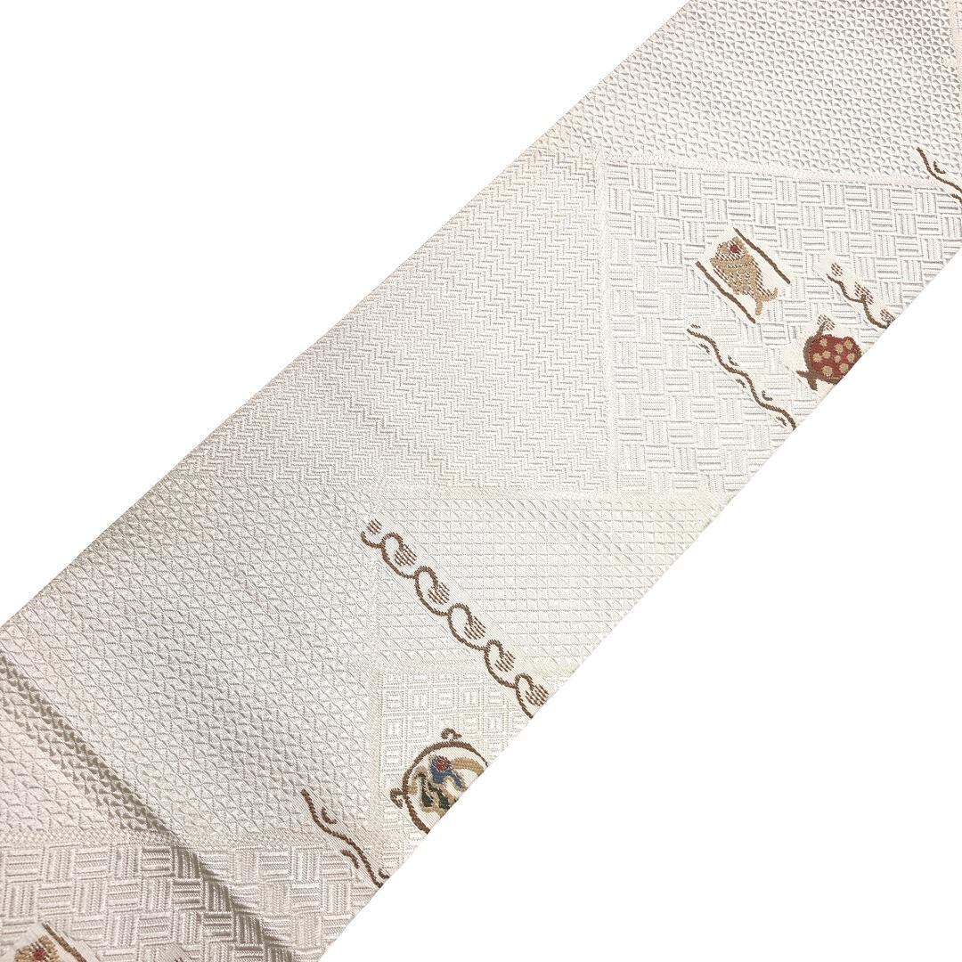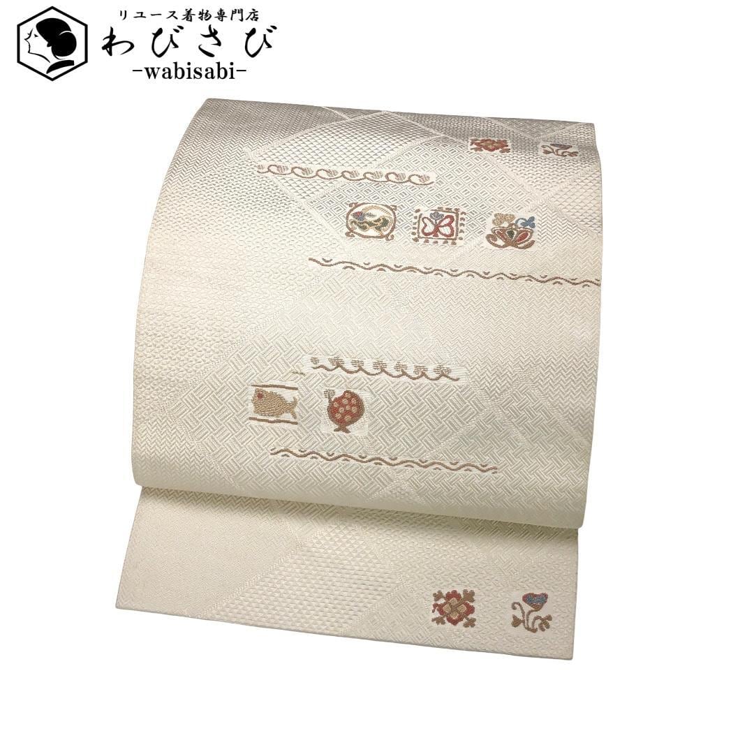 象牙色の上品なお色味に四角に抽象柄の魚、蝶々、動物、花模様などがデザインされた素敵な柄裄のお品でございます。