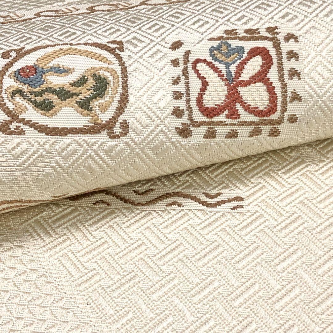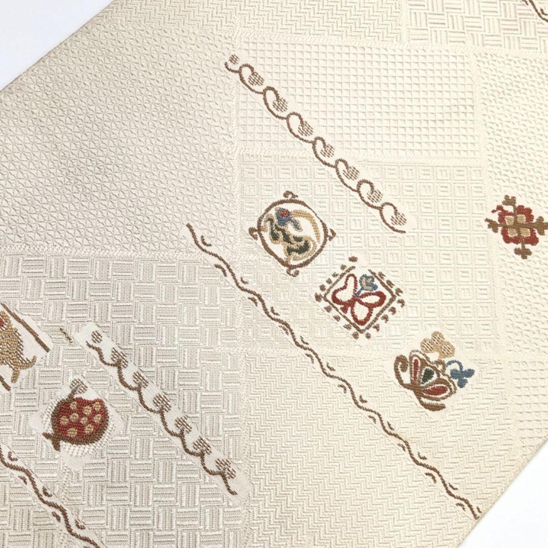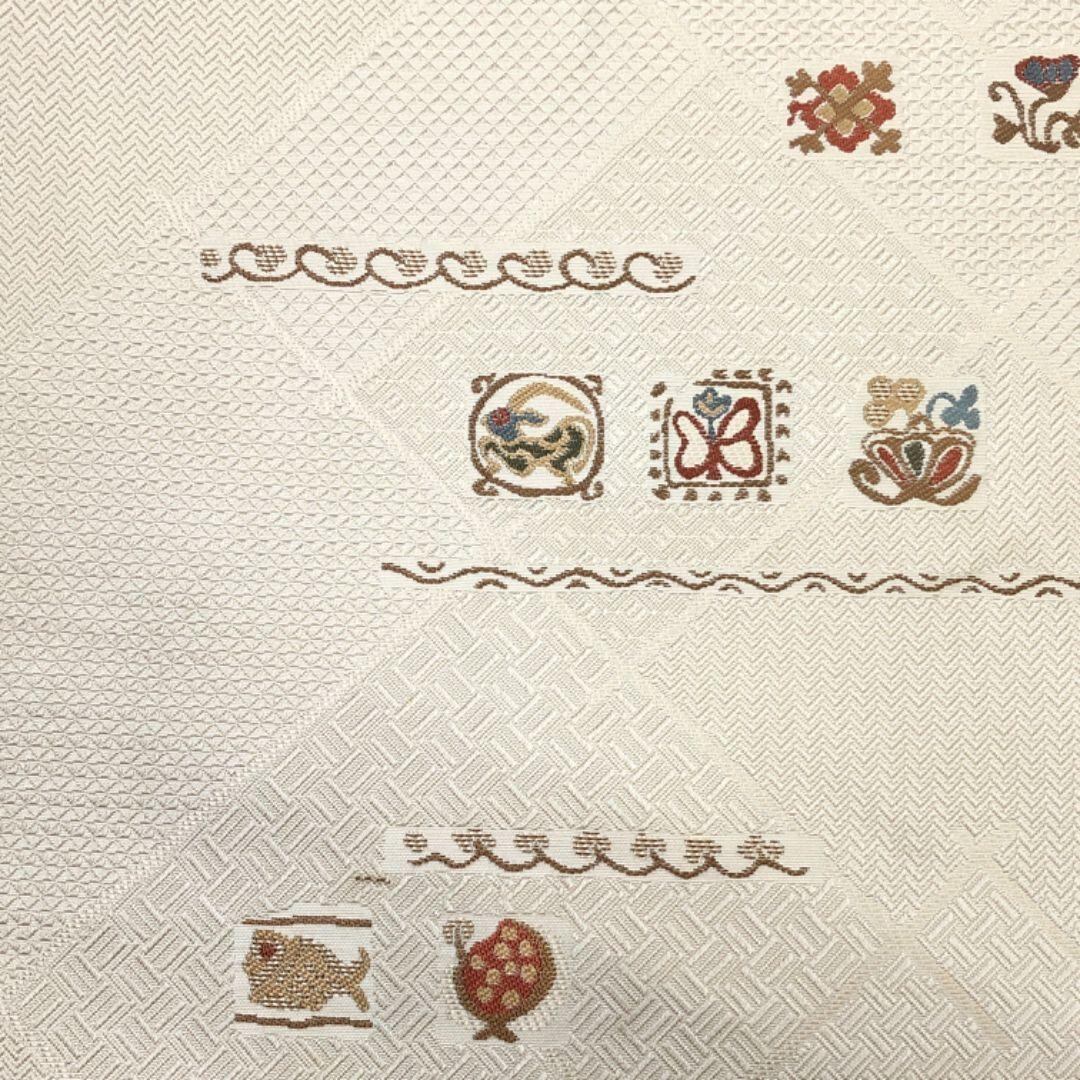 名古屋帯 四角に抽象柄 魚 蝶々 動物 花模様 象牙色 O-5288 着物 きもの kimono 和服 和装 中古 リサイクル着物 【送料無料】