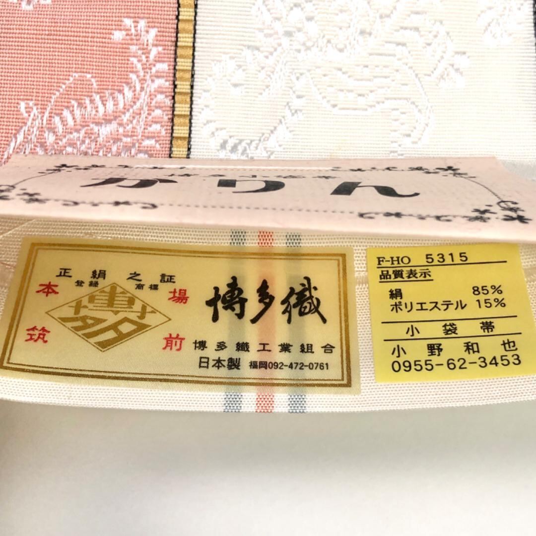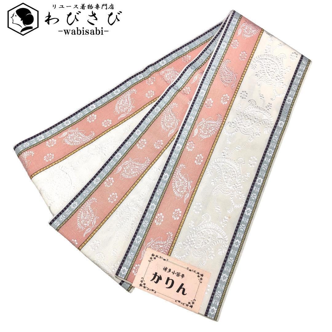 半幅帯 本場筑前博多織 証紙付 縦縞に華柄模様 乳白色 D-2091 着物 きもの kimono 和服 和装 中古 リサイクル着物 【送料無料】