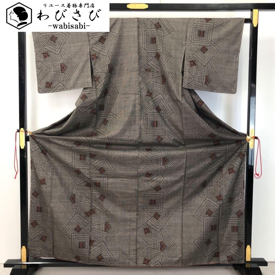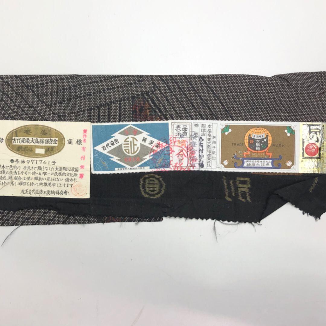 本場大島紬 茶泥染 証紙付 一元7マルキ 四角模様 しつけ糸 K-5020 着物 きもの kimono 和服 和装 中古 リサイクル着物 【送料無料】