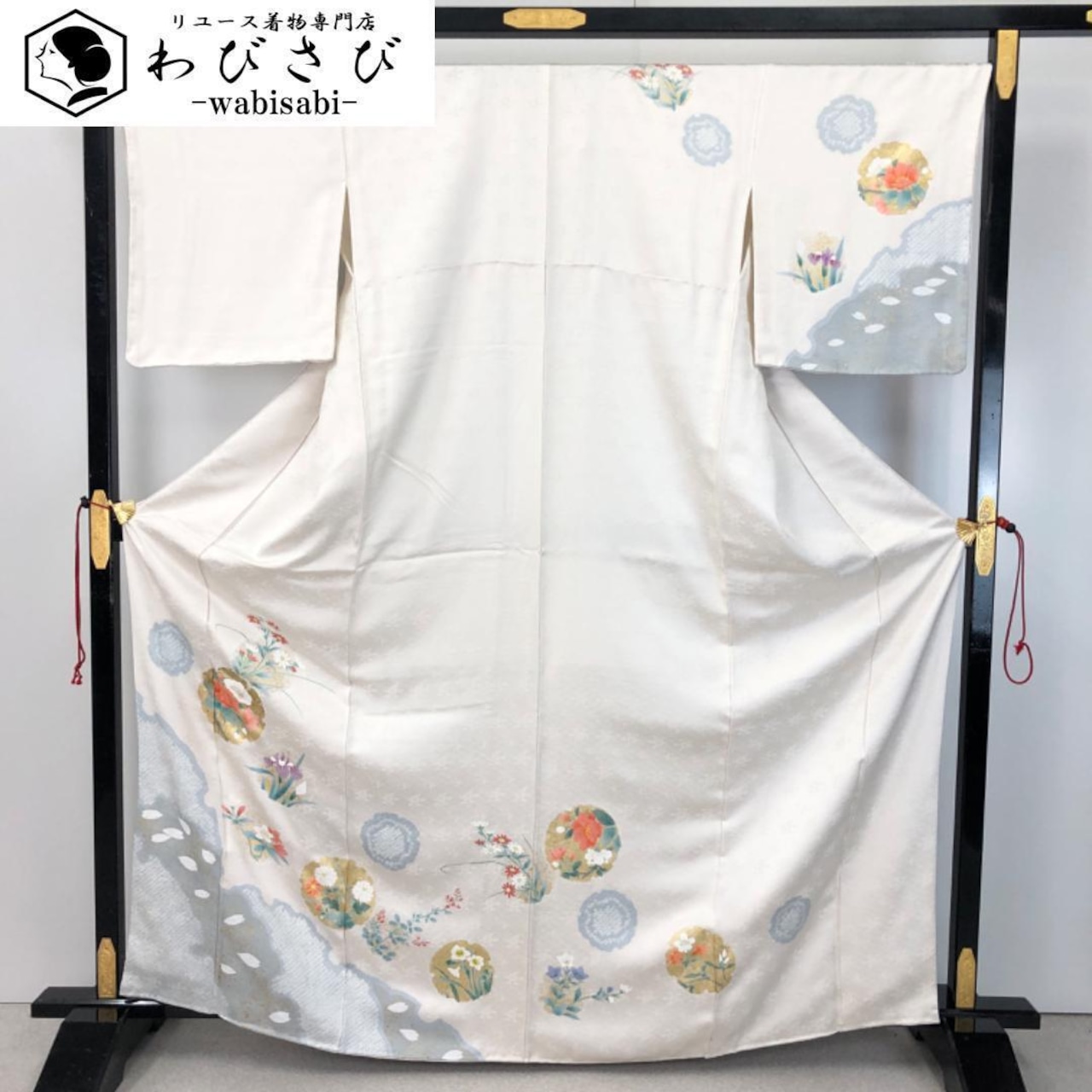 訪問着雪輪に花模様 絞り 乳白色 金彩 しつけ糸 トールサイズ K-5044 着物 きもの kimono 和服 和装 中古 リサイクル着物 【送料無料】