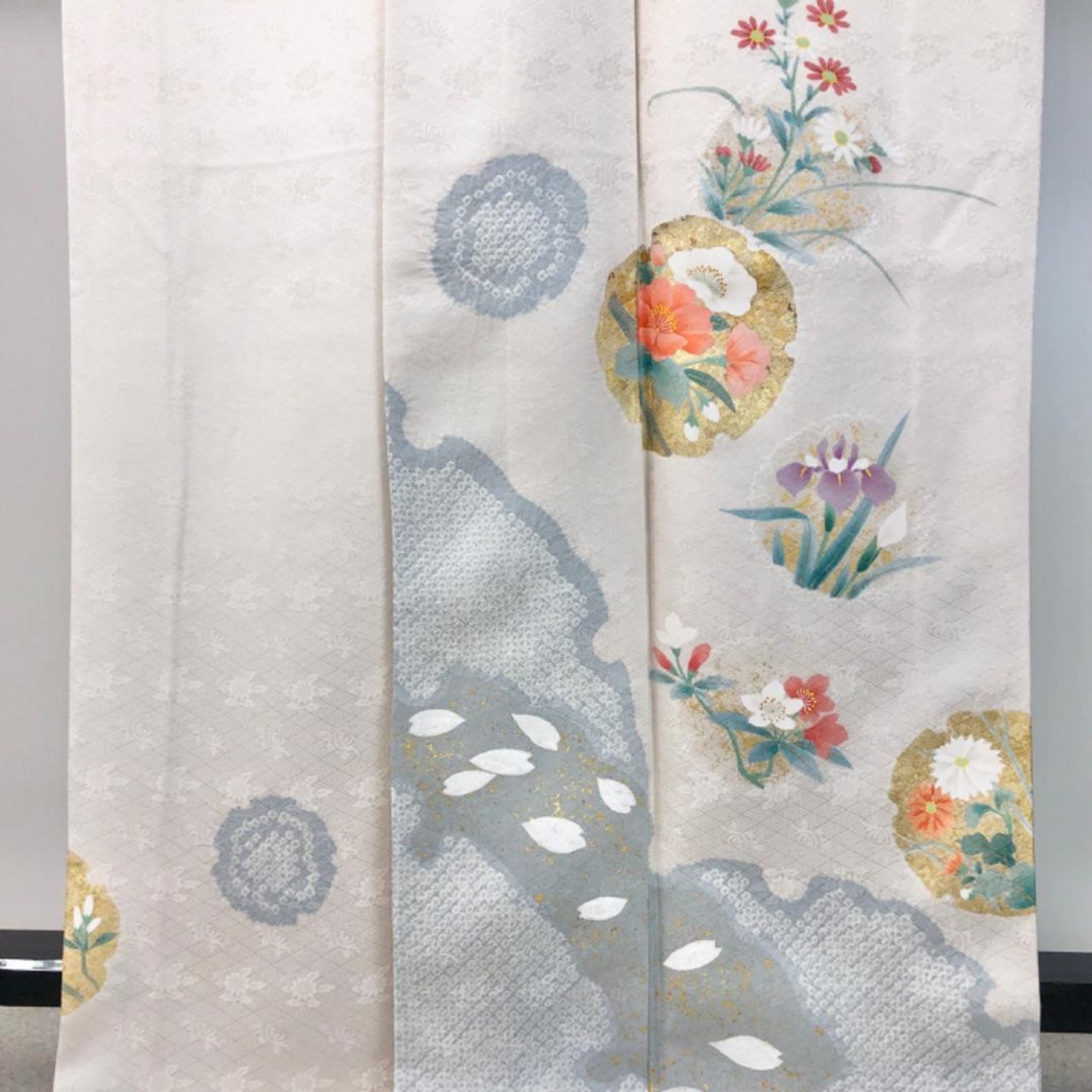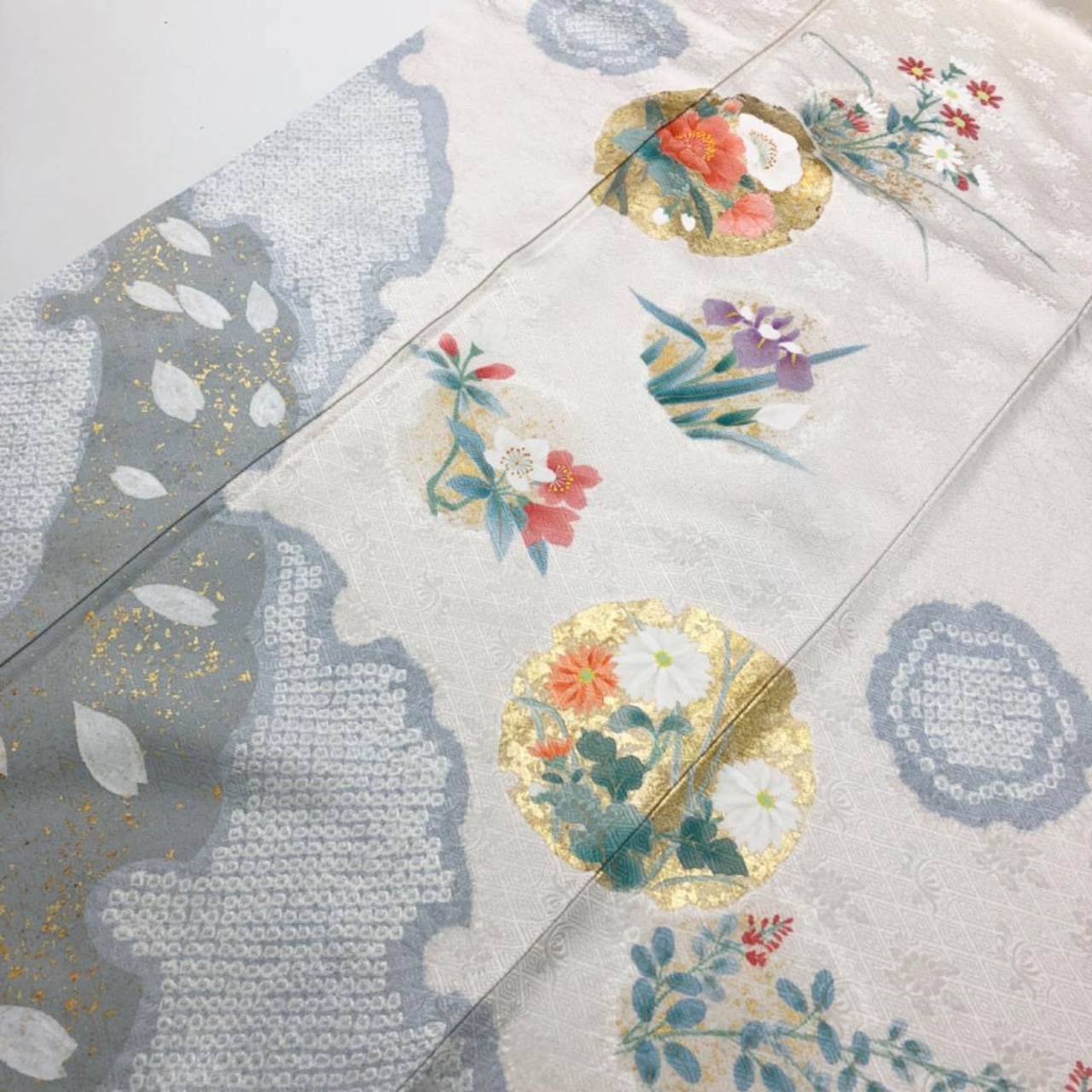乳白色の上品なお色味、絞り、金彩が使われた雪輪に花模様がデザインされた素敵な柄行のお品でございます。