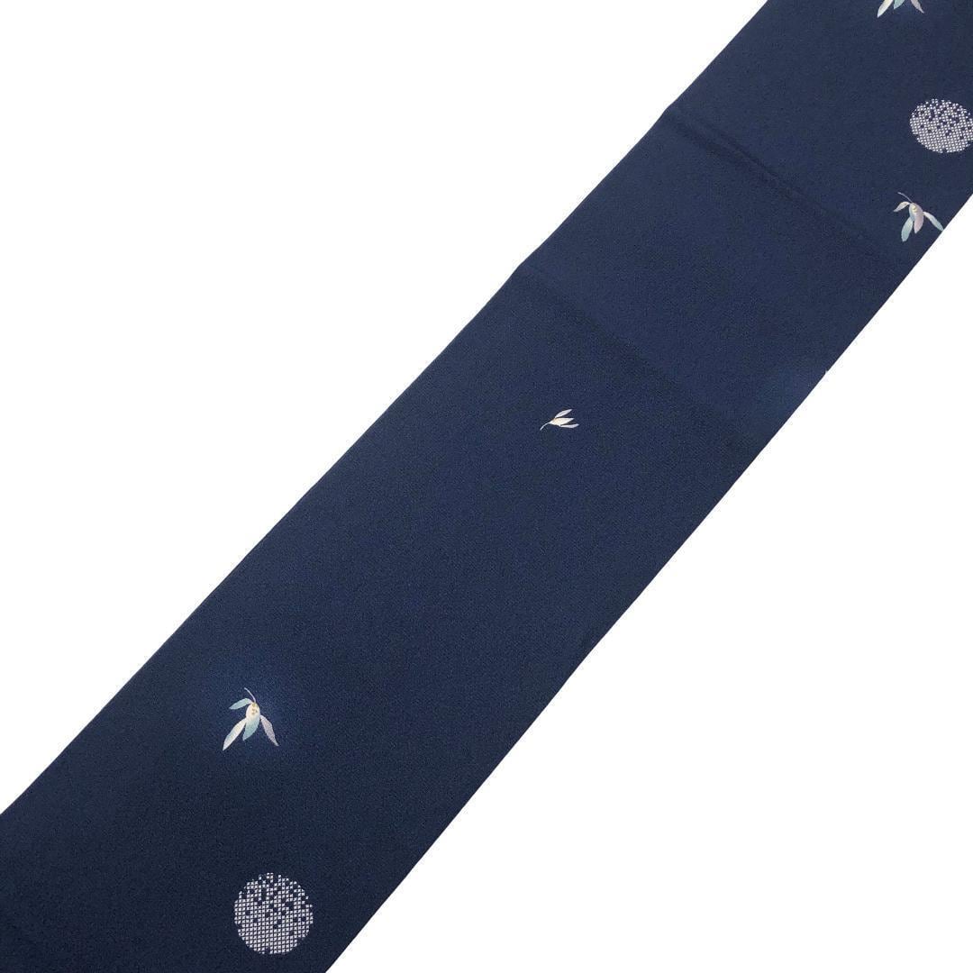 名古屋帯 月のような丸に花葉模様 縮緬 紺藍色 O-5307 着物 きもの kimono 和服 和装 中古 リサイクル着物 【送料無料】