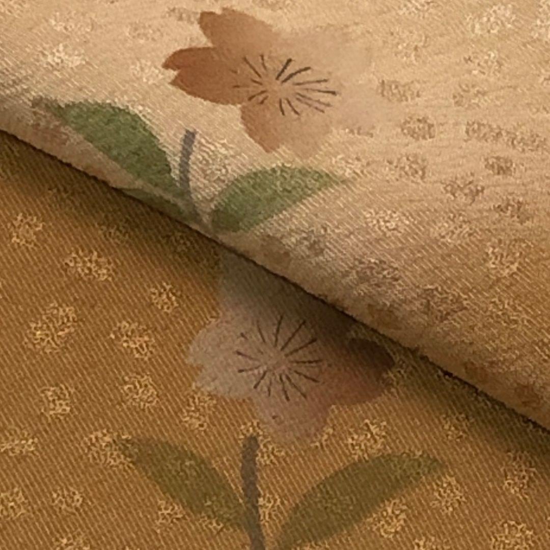 狐色ベースのお色味に縦縞暈し模様、花模様の柄裄がデザインされた素敵なお品でございます。