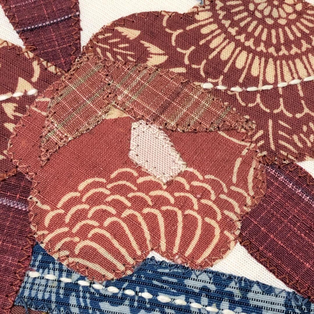 乳白色のお色味の紬地に雰囲気の良いパッチワークの花模様がデザインされた素敵な雰囲気の良いお品でございます。