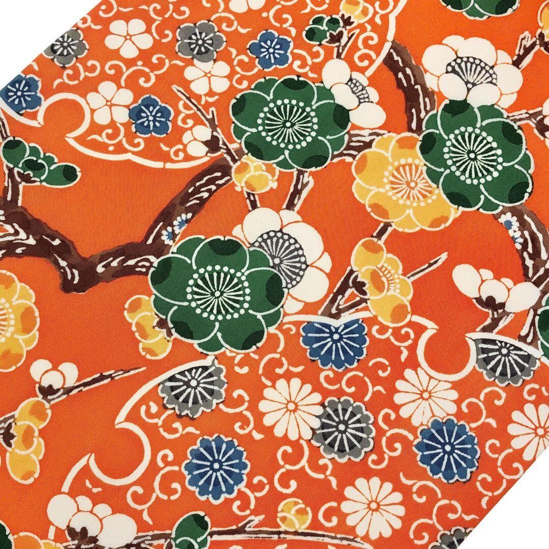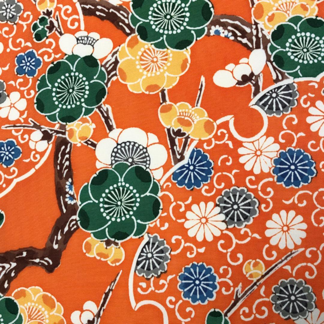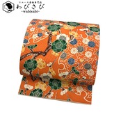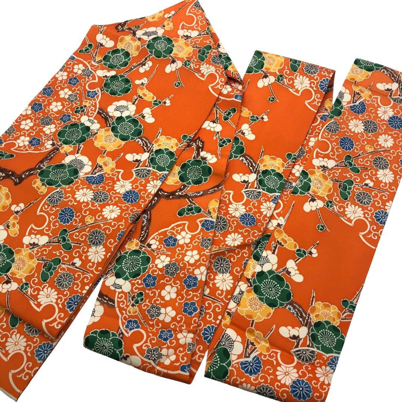 橙色のお色味の塩瀬に色鮮やかな雪輪に梅、菊の花模様の柄裄がデザインされた素敵なお品でございます。