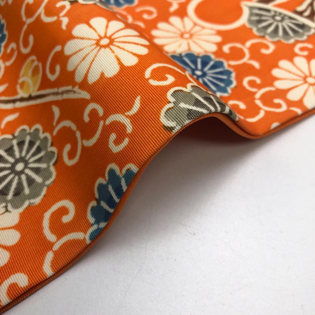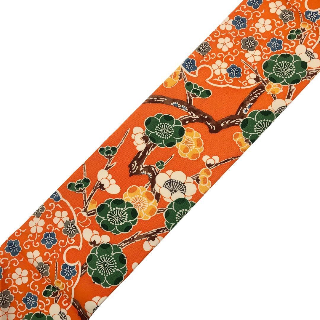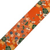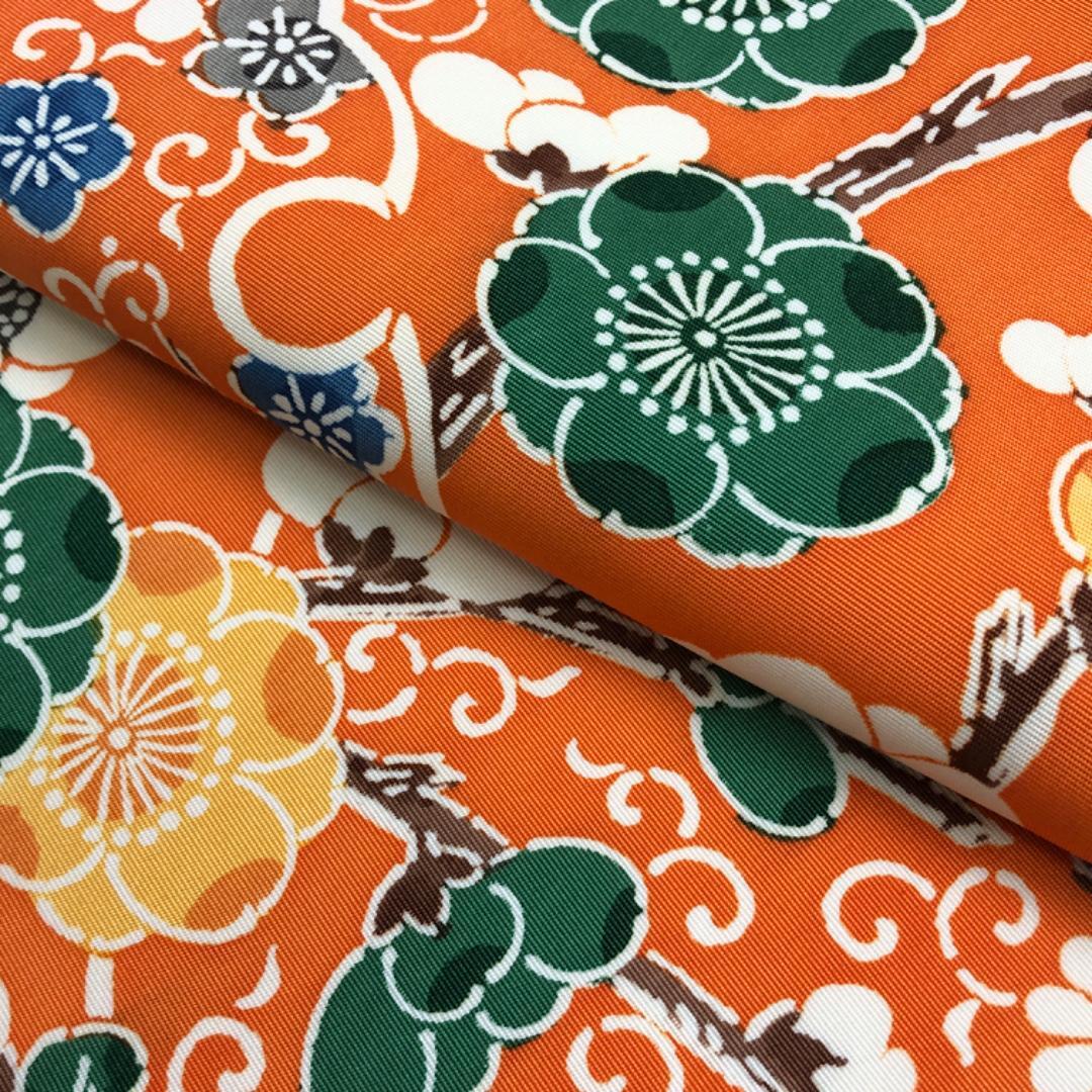 橙色のお色味の塩瀬に色鮮やかな雪輪に梅、菊の花模様の柄裄がデザインされた素敵なお品でございます。