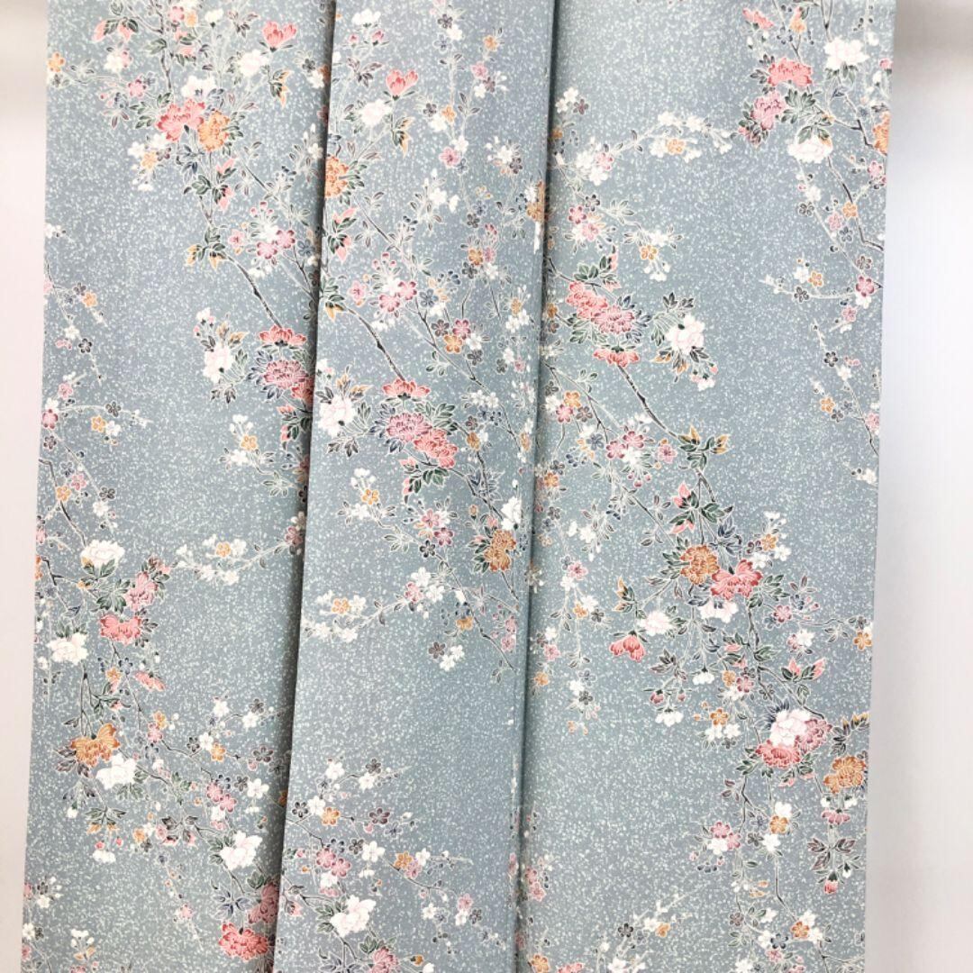 空鼠色の上品なお色味の縮緬地に叩き染、染柄の花模様がデザインされた素敵な柄行のお品でございます。