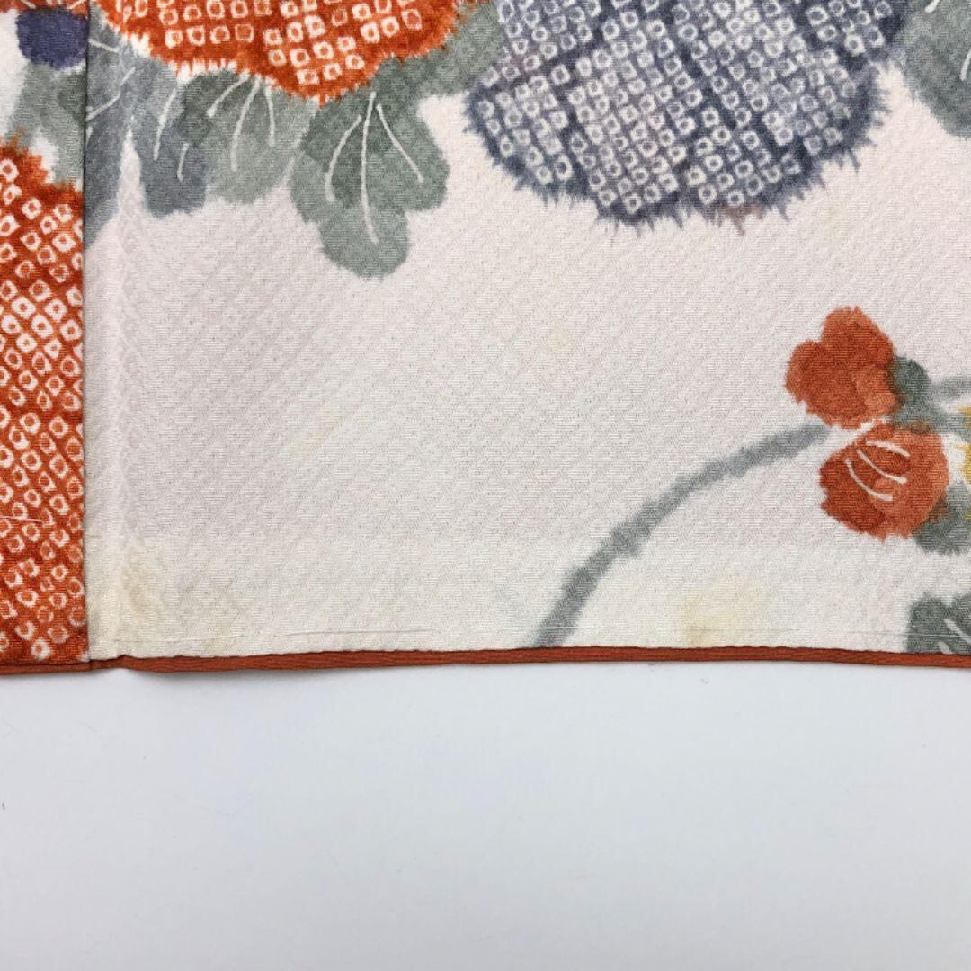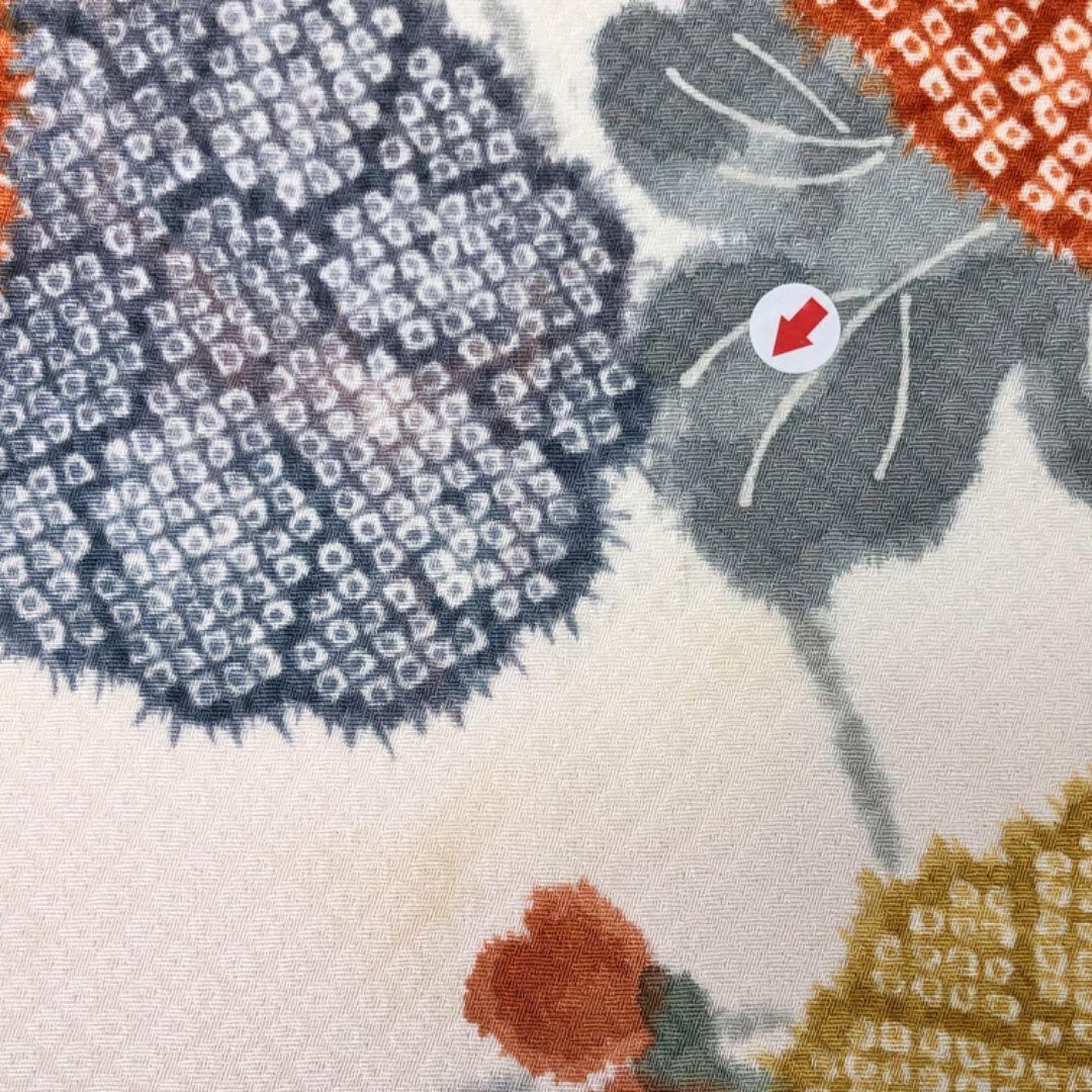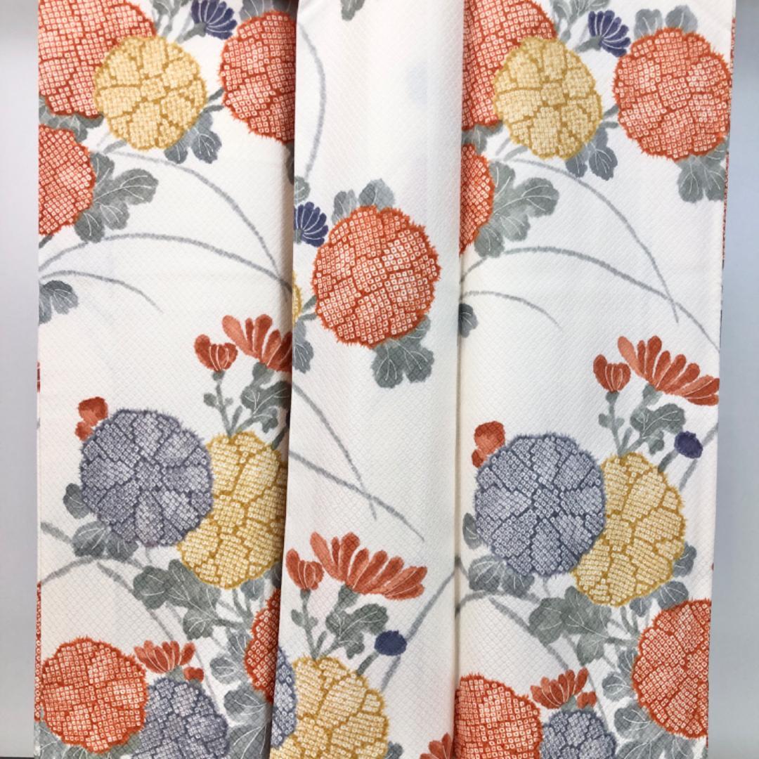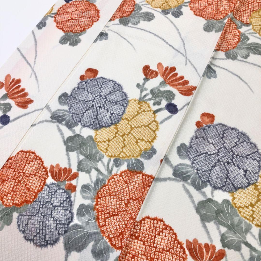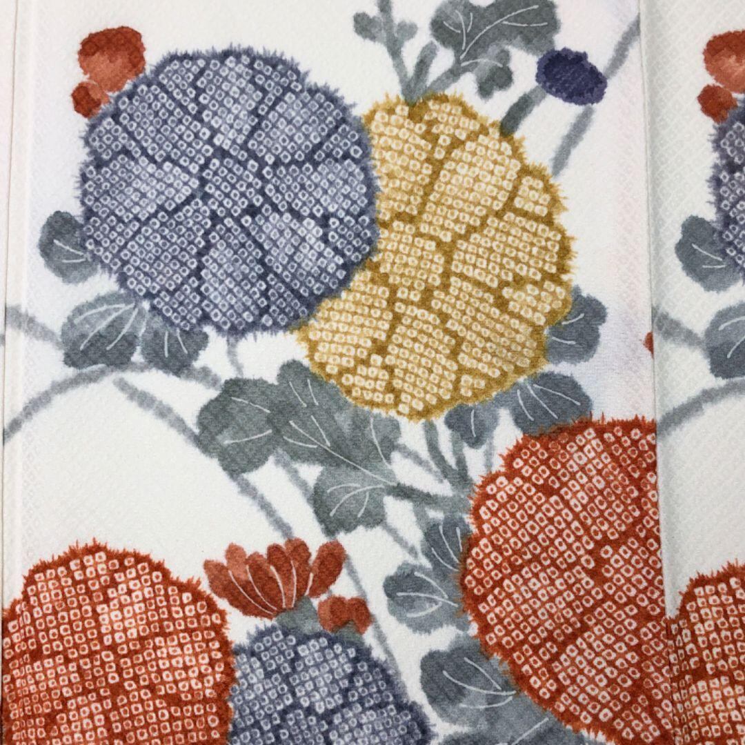 乳白色の上品なお色味に色鮮やかな鹿の子柄に花模様の雰囲気の良い柄裄がデザインされた素敵なお品でございます。