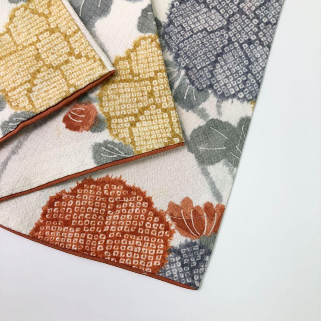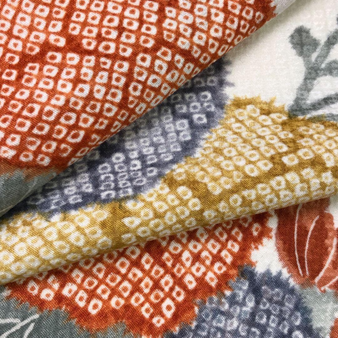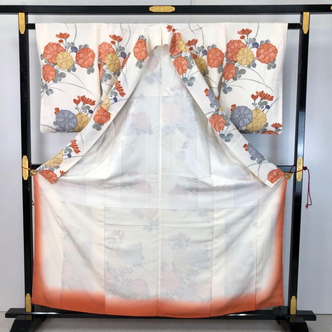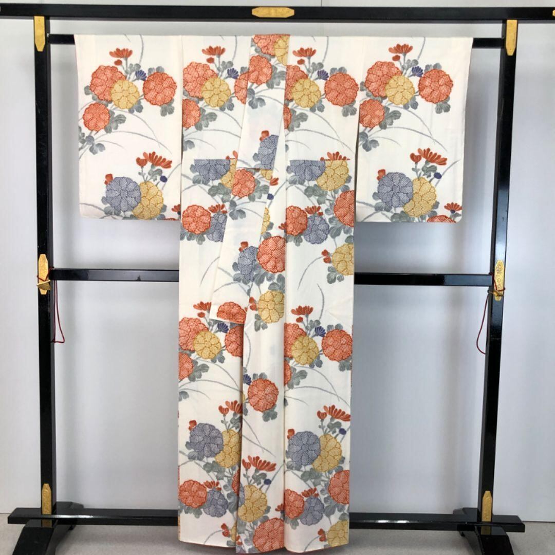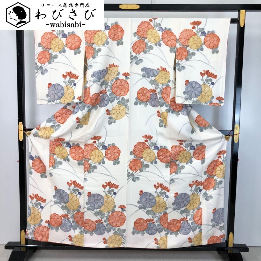 乳白色の上品なお色味に色鮮やかな鹿の子柄に花模様の雰囲気の良い柄裄がデザインされた素敵なお品でございます。